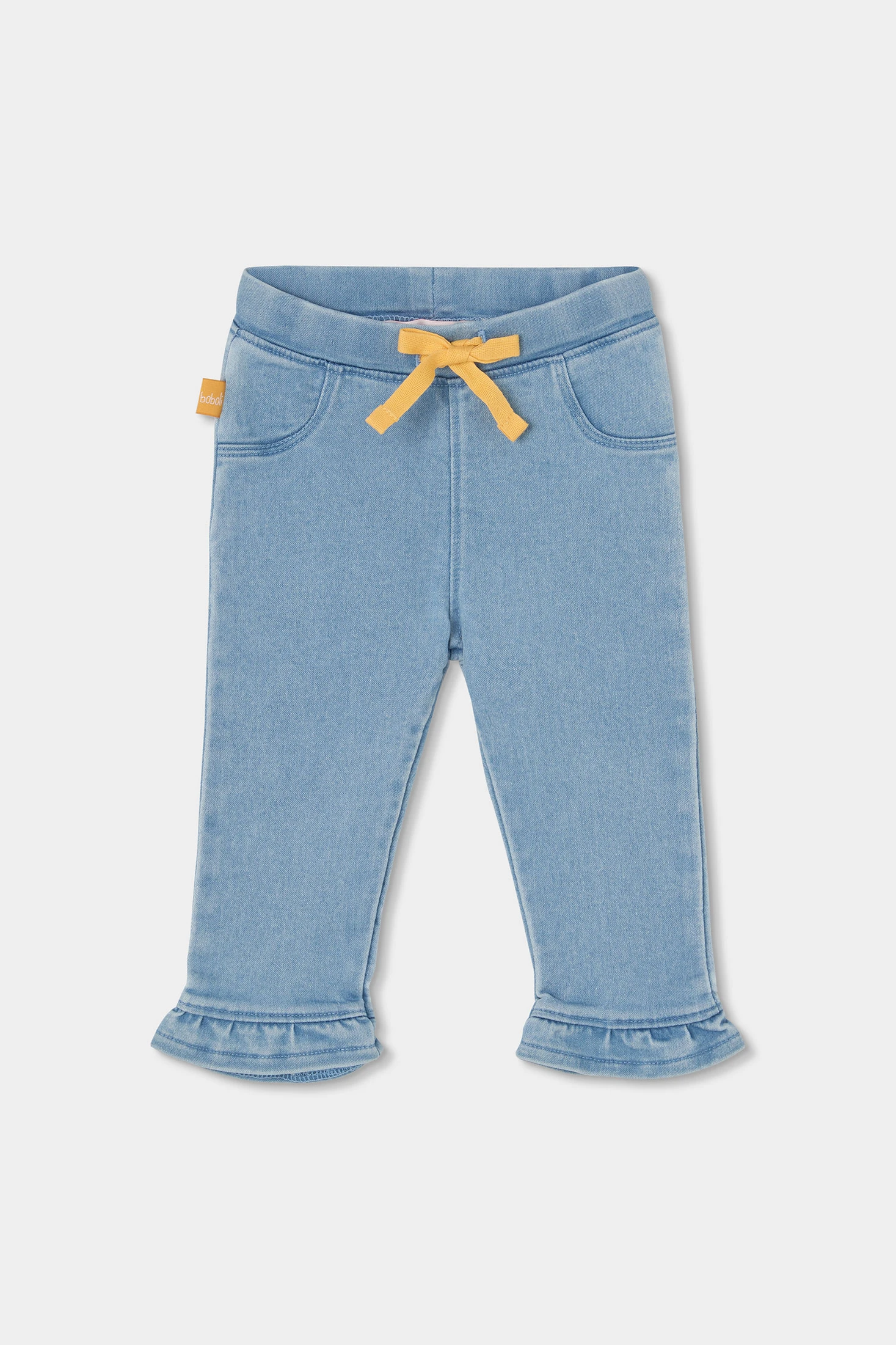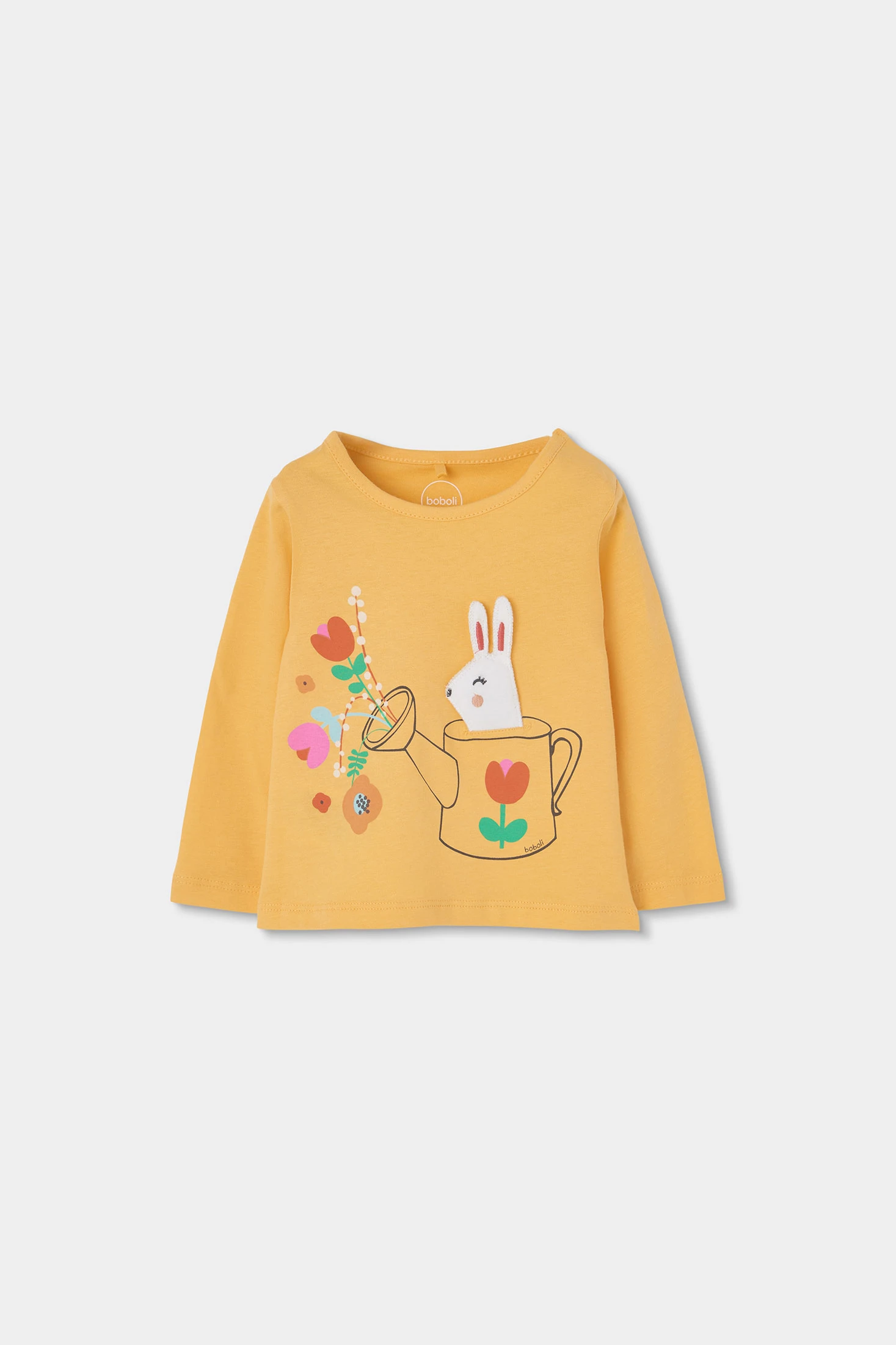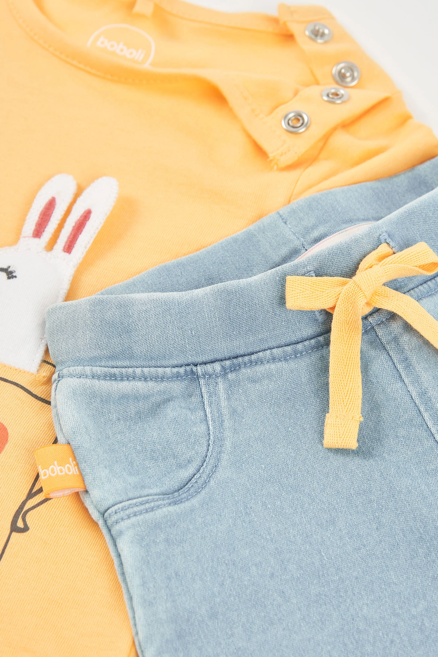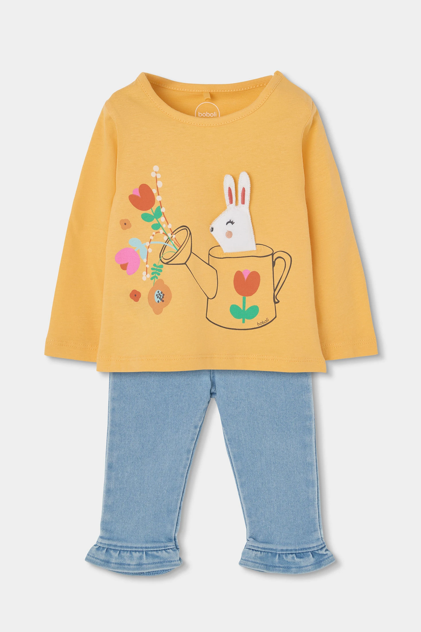 Ensemble pour fille idéal pour bébé, disponible en tailles de 1 mois à 24 mois. Le t-shirt est en coton, de couleur jaune, avec un design amusant montrant un lapin et des fleurs sortant d'un arrosoir. Manches longues qui le rendent parfait pour la mi-saison. Le pantalon est en denim extensible, avec des volants à l'ourlet, ajoutant contraste et un style moderne. Cet ensemble est confortable et pratique, idéal pour un usage quotidien, apportant une touche de joie et de couleur à la garde-robe de la petite.