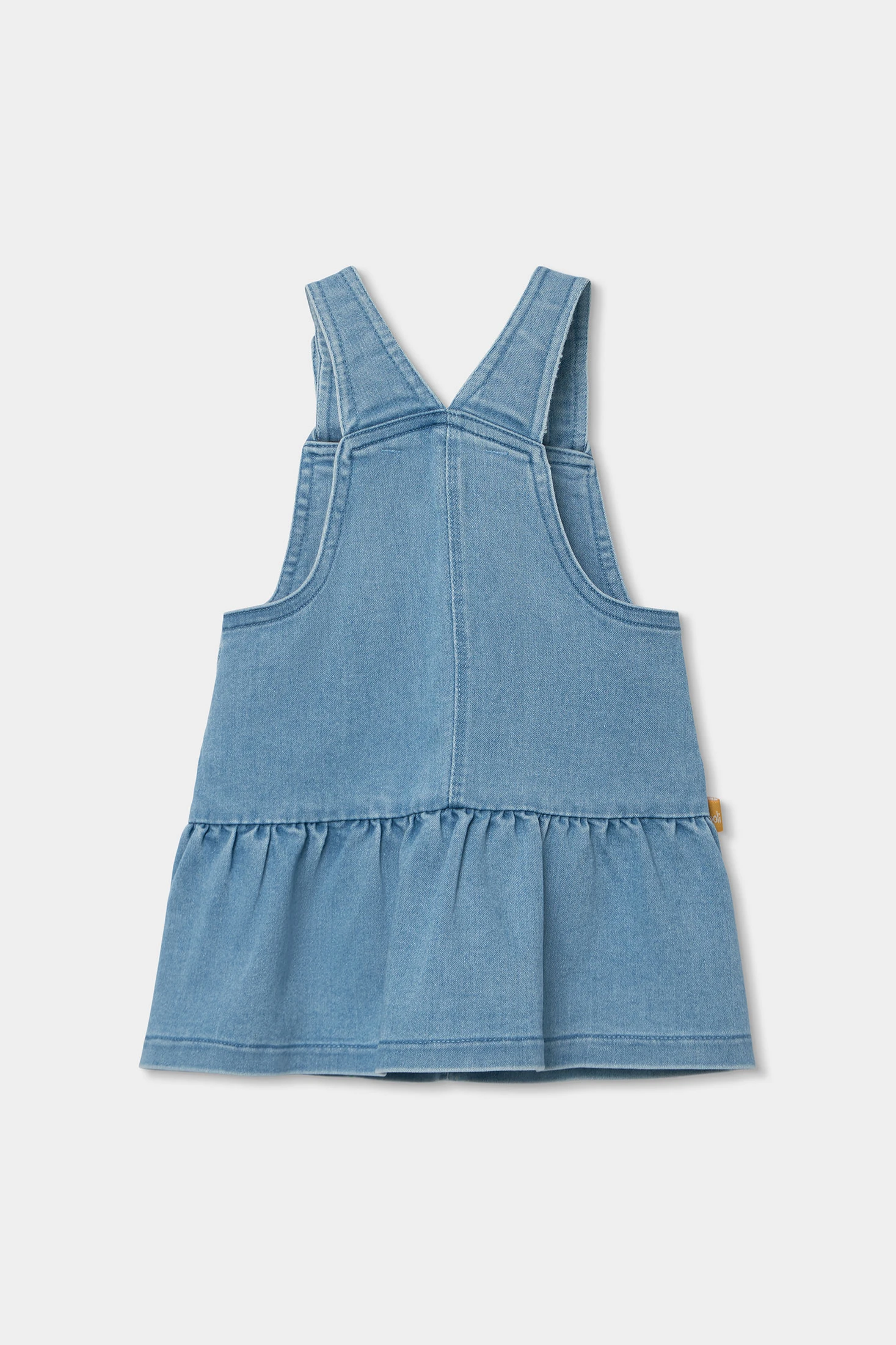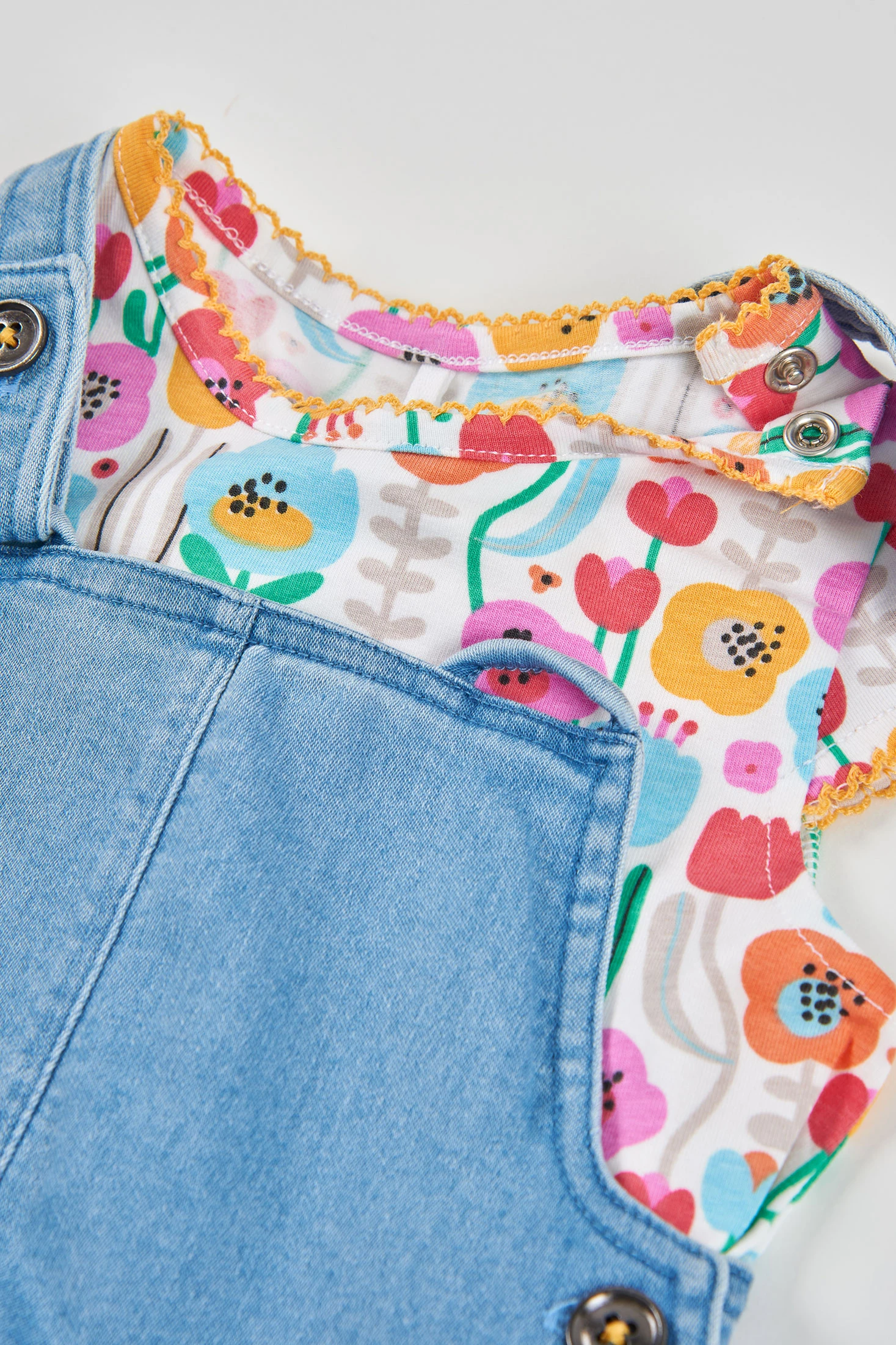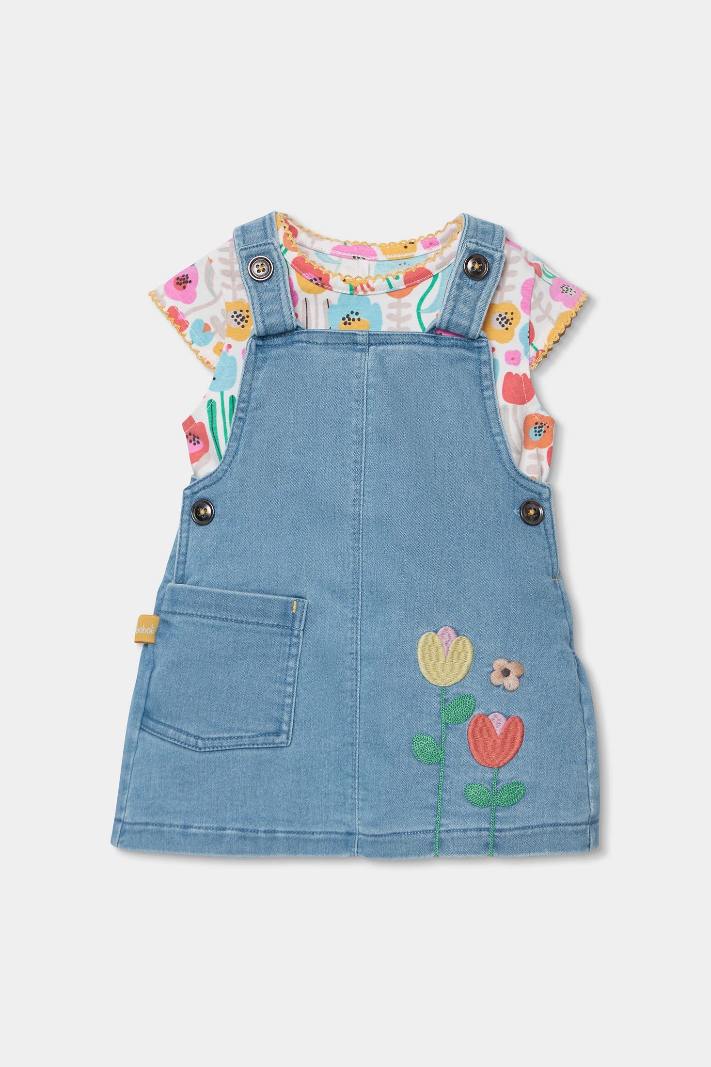 Ensemble pour bébés filles. Robe chasuble en maille denim élastique bleu clair avec une poche latérale et des broderies de fleurs de différentes couleurs, apportant une touche charmante. Le t-shirt en coton élastique de couleur blanche avec un imprimé floral multicolore et une ouverture à l'épaule facilitant le changement. Disponible en tailles de 1 mois à 24 mois. Une option moderne et fonctionnelle pour les plus petites.