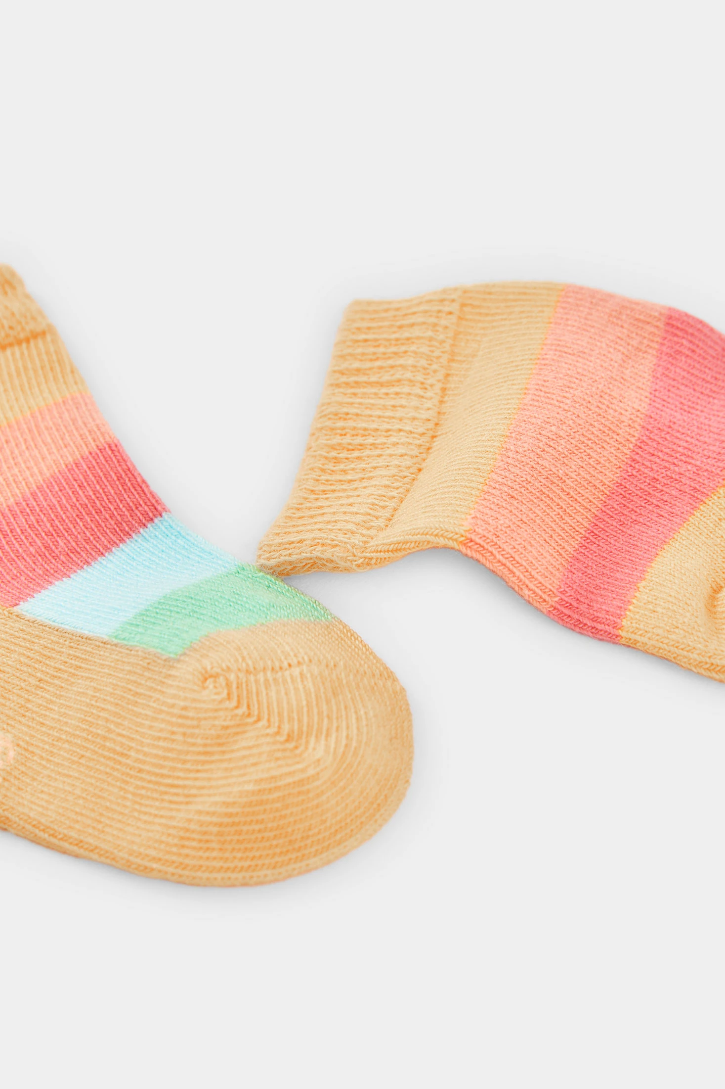 Pack de chaussettes en coton parfait pour nouveaux-nés, offrant confort et douceur. Avec des motifs rayés dans des couleurs vibrantes, elles sont idéales pour ajouter une touche de couleur à la garde-robe des tout-petits. Disponibles en tailles : 16/18, 19/21, et 22/24. Ces chaussettes s'adaptent facilement aux petits pieds en pleine croissance, étant une option pratique et stylée pour le quotidien.