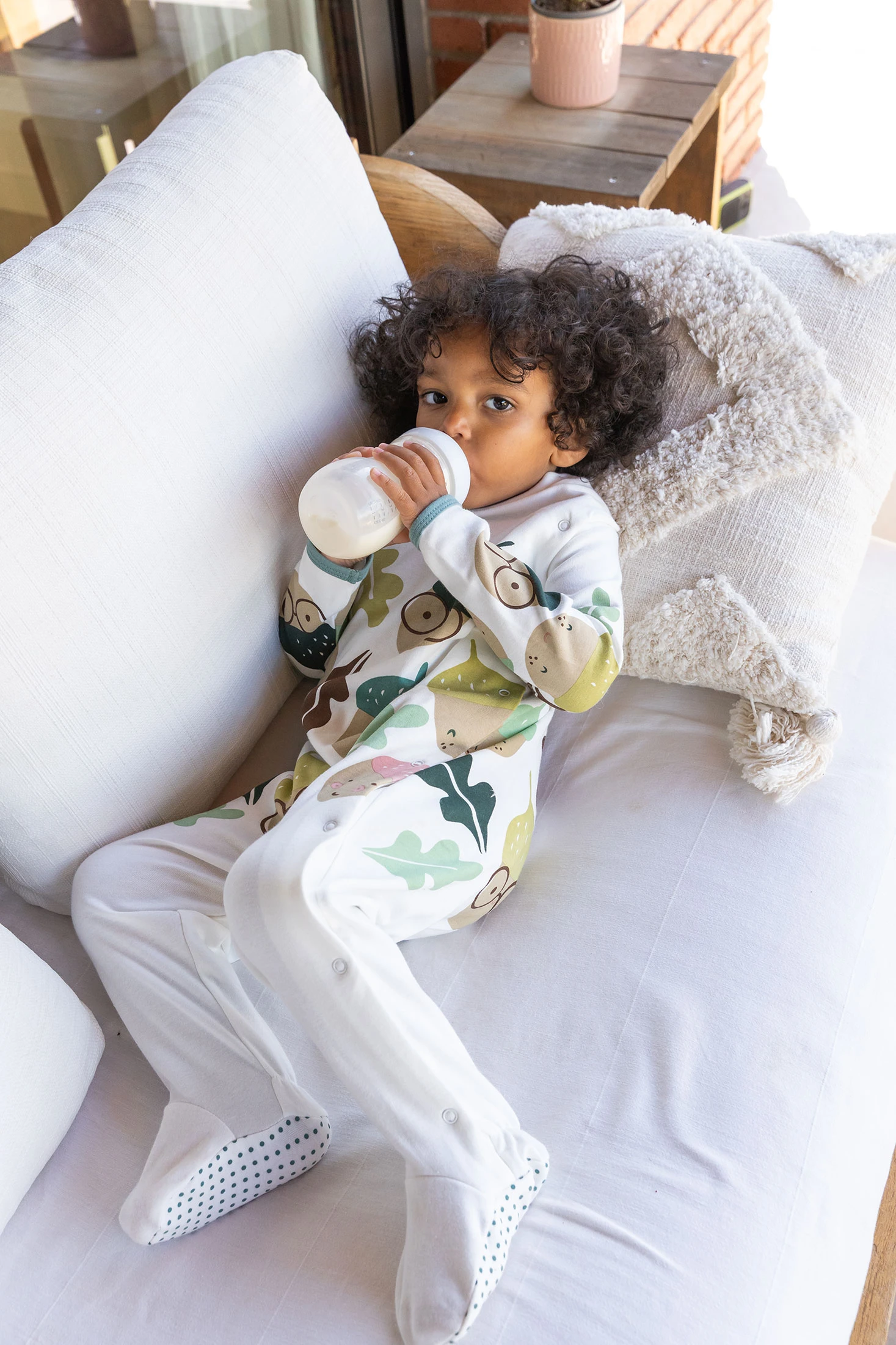 Pyjama en interlock blanc pour bébé avec motif de feuilles qui évoque fraîcheur et tendresse. Fabriqué en tissu interlock de haute qualité, il assure douceur et confort pour la peau sensible de votre petit. Il présente une fermeture pratique à boutons sur l'épaule, ce qui facilite son habillage. Disponible en tailles de 1 mois à 2 ans, il est parfait pour toute saison grâce à son design polyvalent et ses couleurs neutres. Vous pouvez l'associer avec une couverture en coton assortie pour un look complet et accueillant.