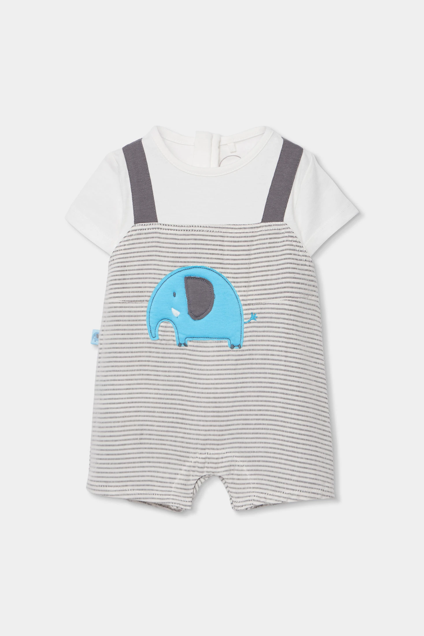 Grenouillère en coton pour bébé, dans des tons gris et blanc, idéale pour les nouveau-nés. Son design présente un éléphant sympathique sur le devant en couleur bleue, ajoutant une touche amusante. Confectionnée dans un matériau doux et confortable, elle est parfaite pour la peau délicate du bébé. Les tailles vont de 1 mois à 24 mois, garantissant un ajustement adéquat pendant sa croissance. Vêtement pratique et polyvalent, essentiel dans la garde-robe de tout bébé.