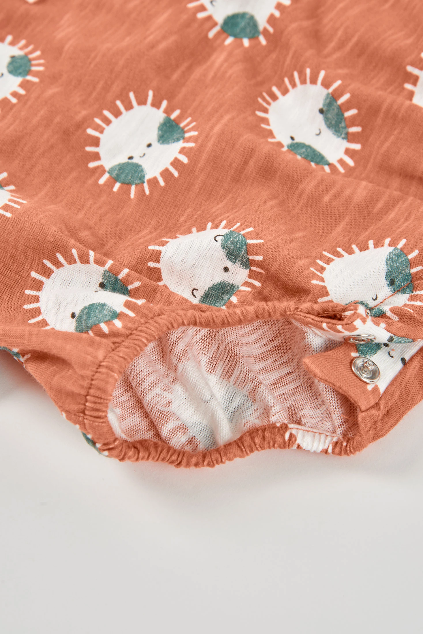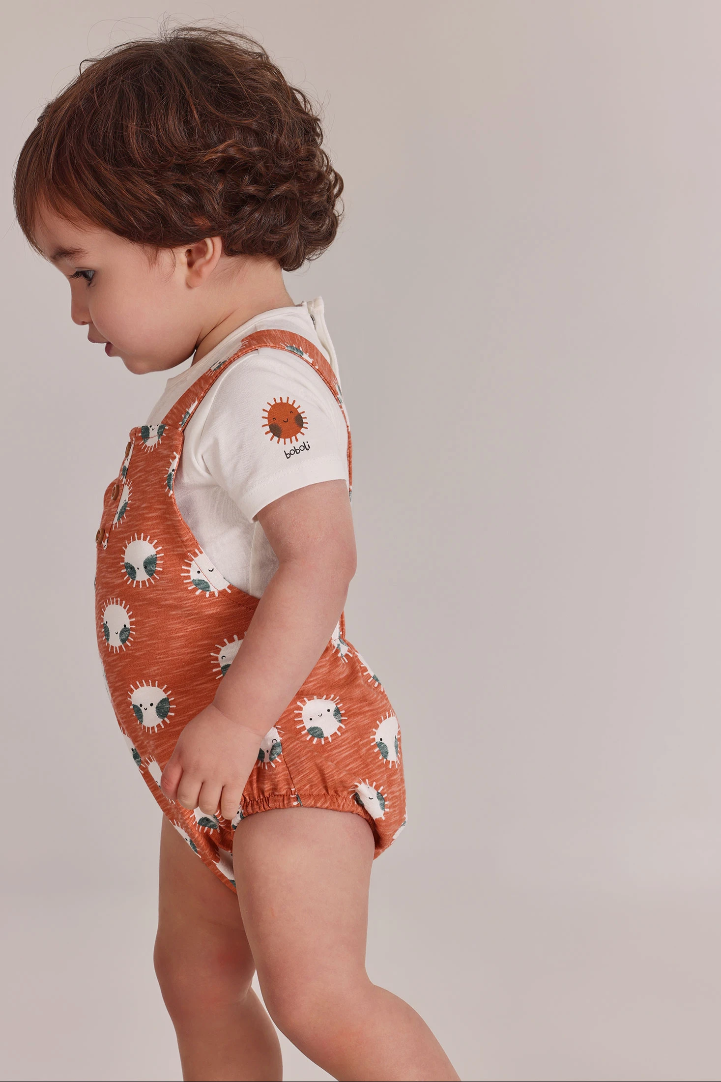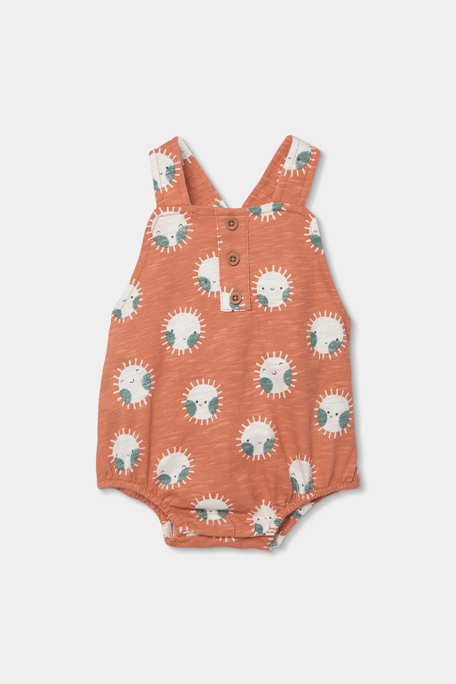 Grenouillère en coton imprimé pour bébé, idéale pour les nouveau-nés. Disponible en tailles de 1 mois à 24 mois. Le tissu en coton est doux et confortable, parfait pour la peau délicate du bébé. Présente un design avec des soleils souriants qui apporte une touche ludique. Sa couleur terracotta ajoute chaleur et style. Elle est à bretelles avec boutons à l'avant pour faciliter le changement de couche. C'est un vêtement pratique et confortable pour le quotidien, idéal pour garder votre bébé heureux et à l'aise.