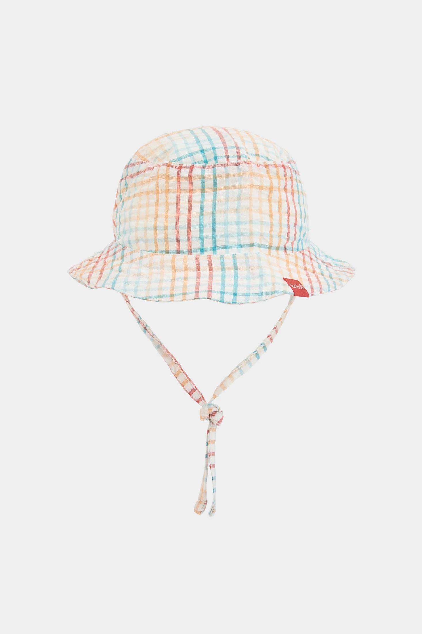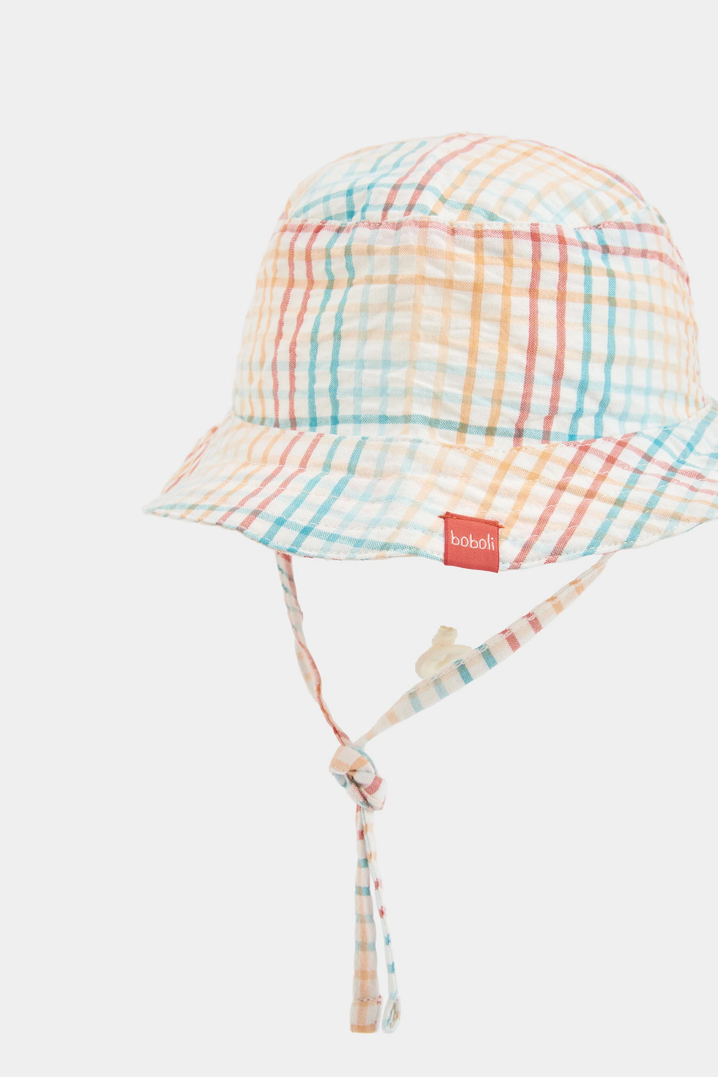 Bonnet en popeline pour nouveau-nés avec un motif à carreaux dans des tons pastel, combinant bleu, orange et rose. Il est confectionné dans un matériau léger et respirant, idéal pour protéger votre bébé du soleil. Équipé d'une sangle ajustable, il assure un ajustement confortable et sûr. Adapté aux bébés de 0 à 12 mois, il est disponible en tailles allant de XXS42 à M/50. Son style classique et coloré en fait une option polyvalente à assortir avec divers vêtements, ajoutant une touche joyeuse à n'importe quelle tenue.