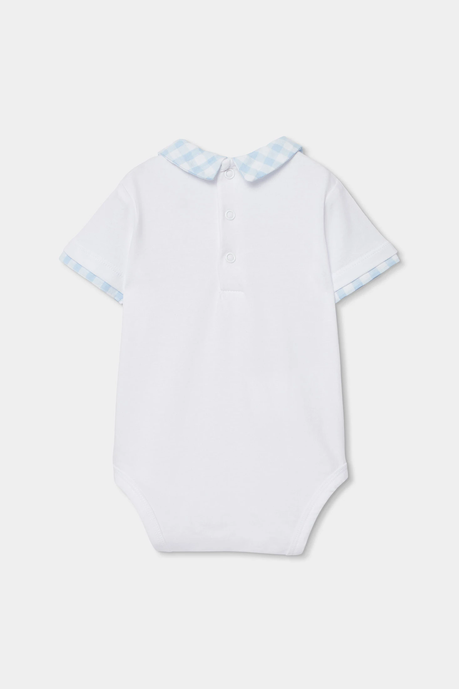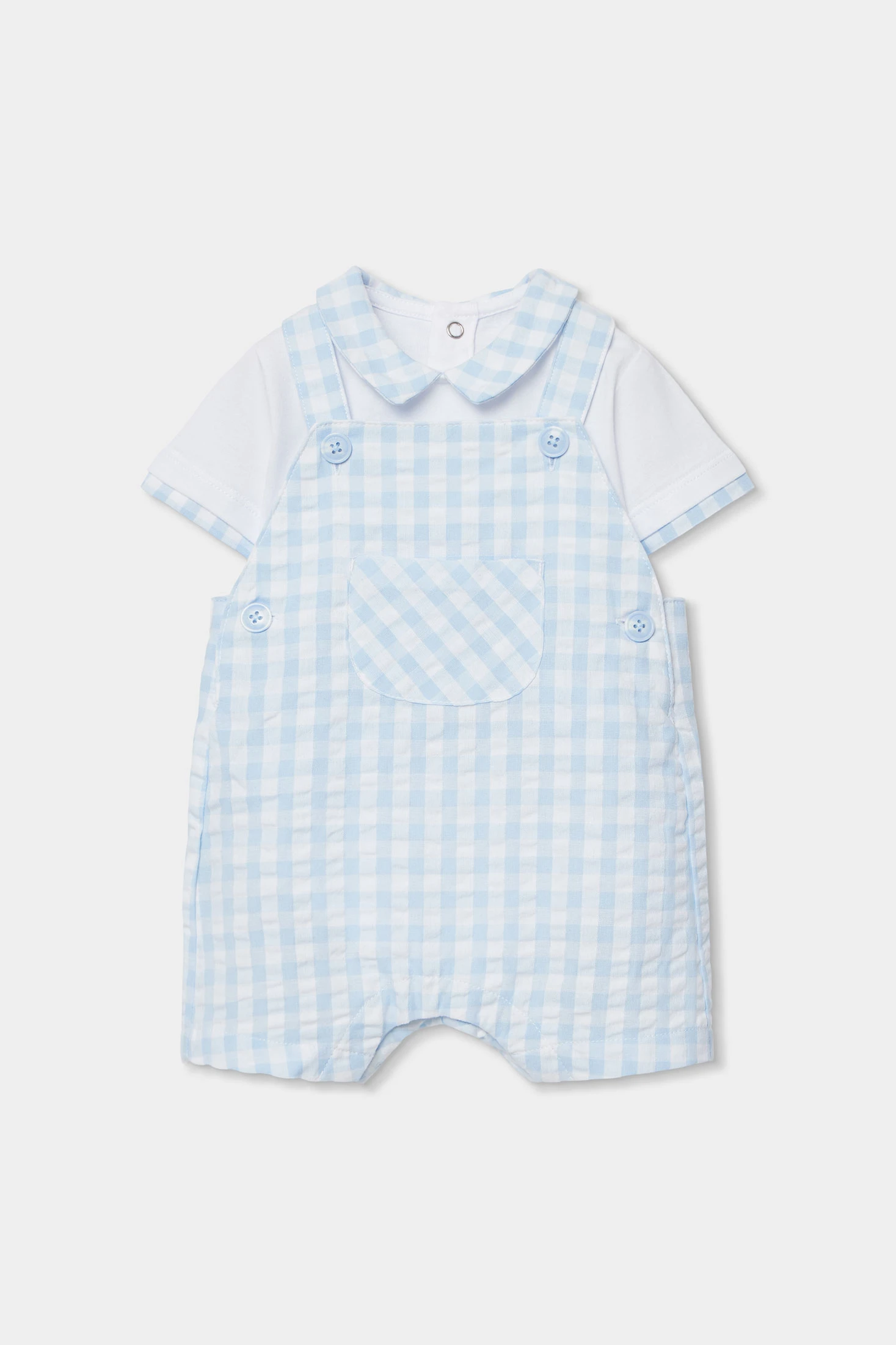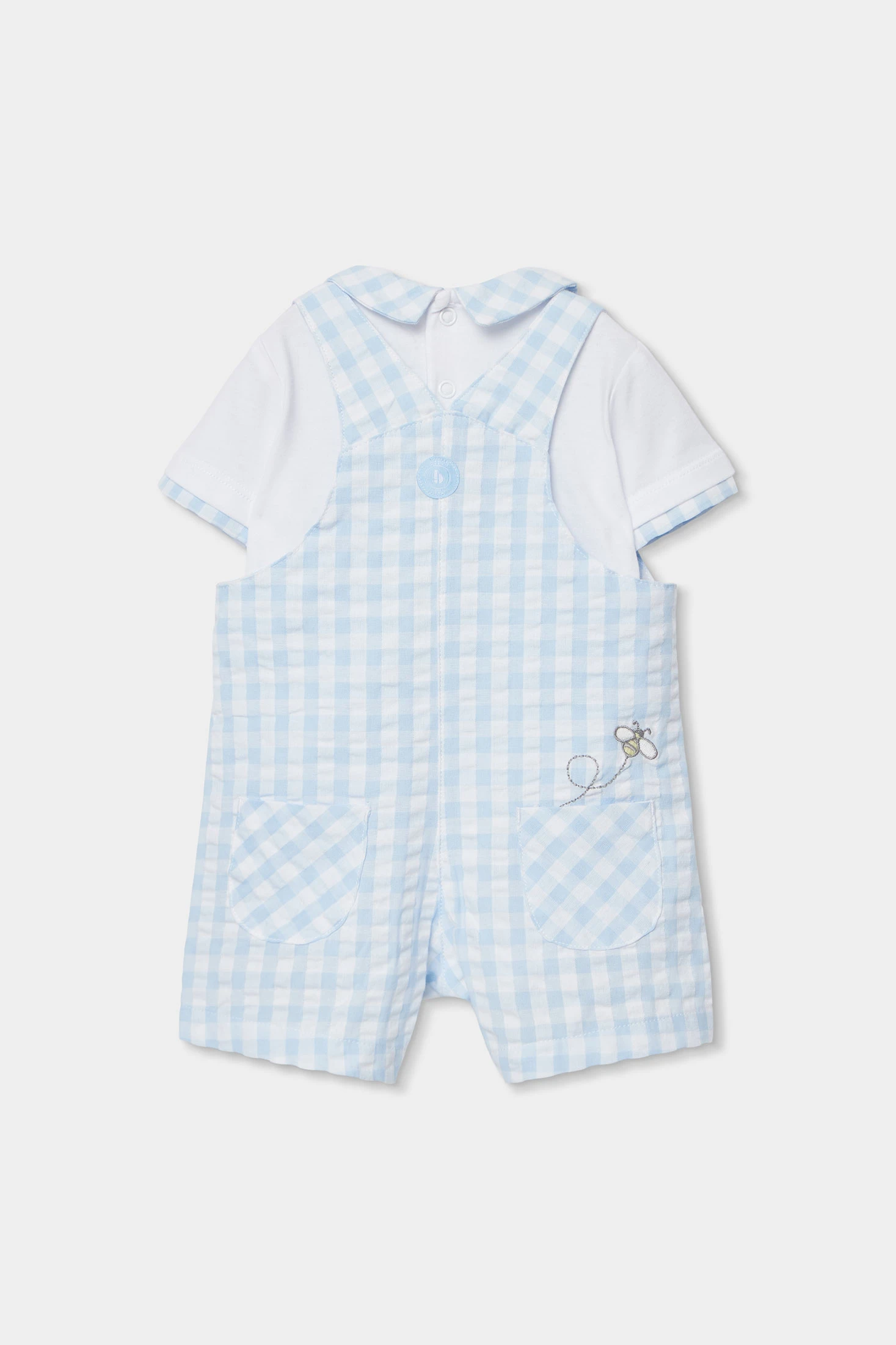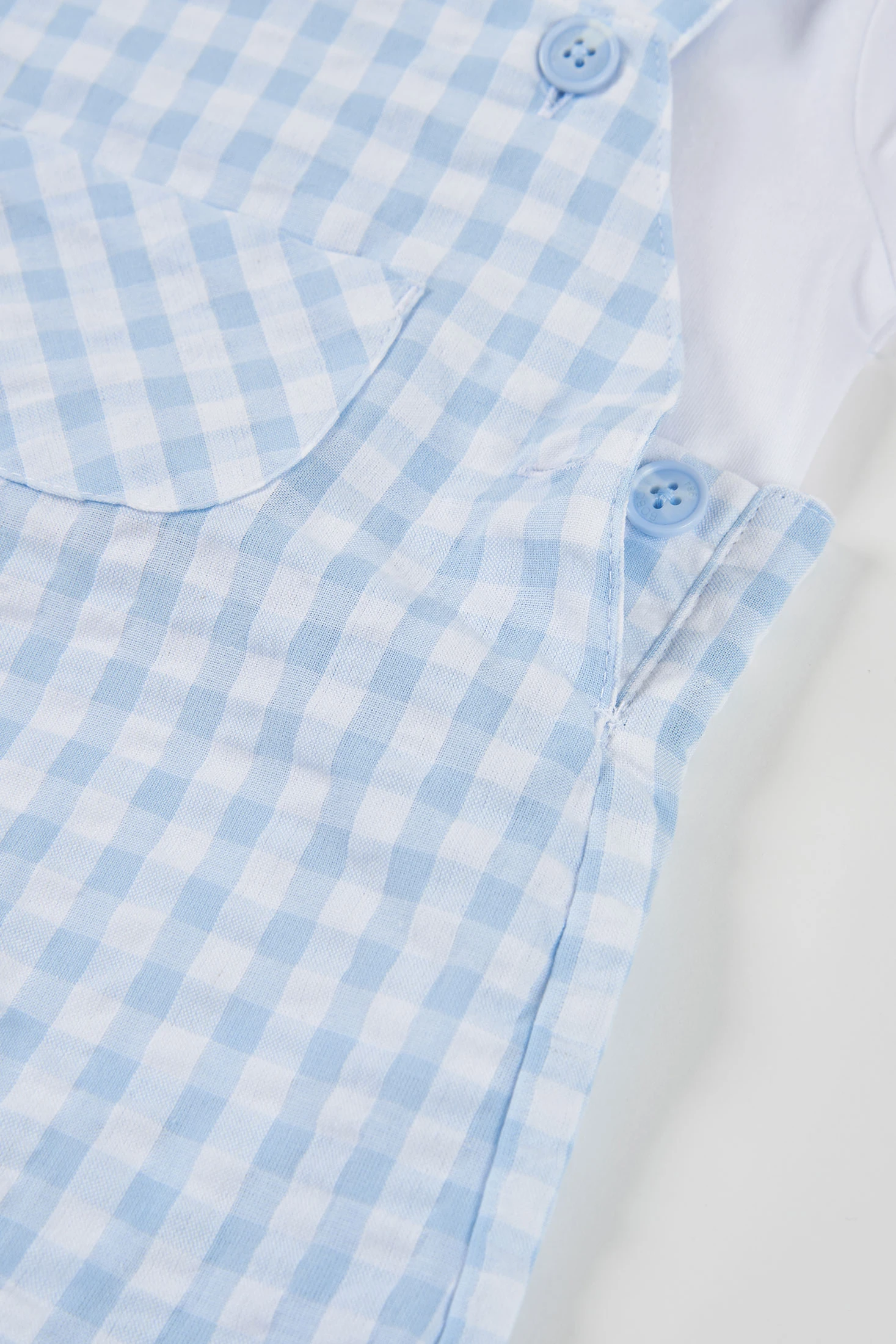 Ensemble en coton pour bébé présentant un motif à carreaux dans les tons bleu clair. Le matériau doux garantit le confort pour la peau du bébé. Fonctionnel et facile à enfiler, avec des boutons sur les bretelles, il est disponible en tailles de 1 mois à 2 ans. Inclut un tee-shirt blanc à manches courtes avec col, ajoutant une touche classique et élégante. Idéal pour toutes les occasions, cette salopette peut être facilement assortie à d'autres vêtements pour un look charmant.