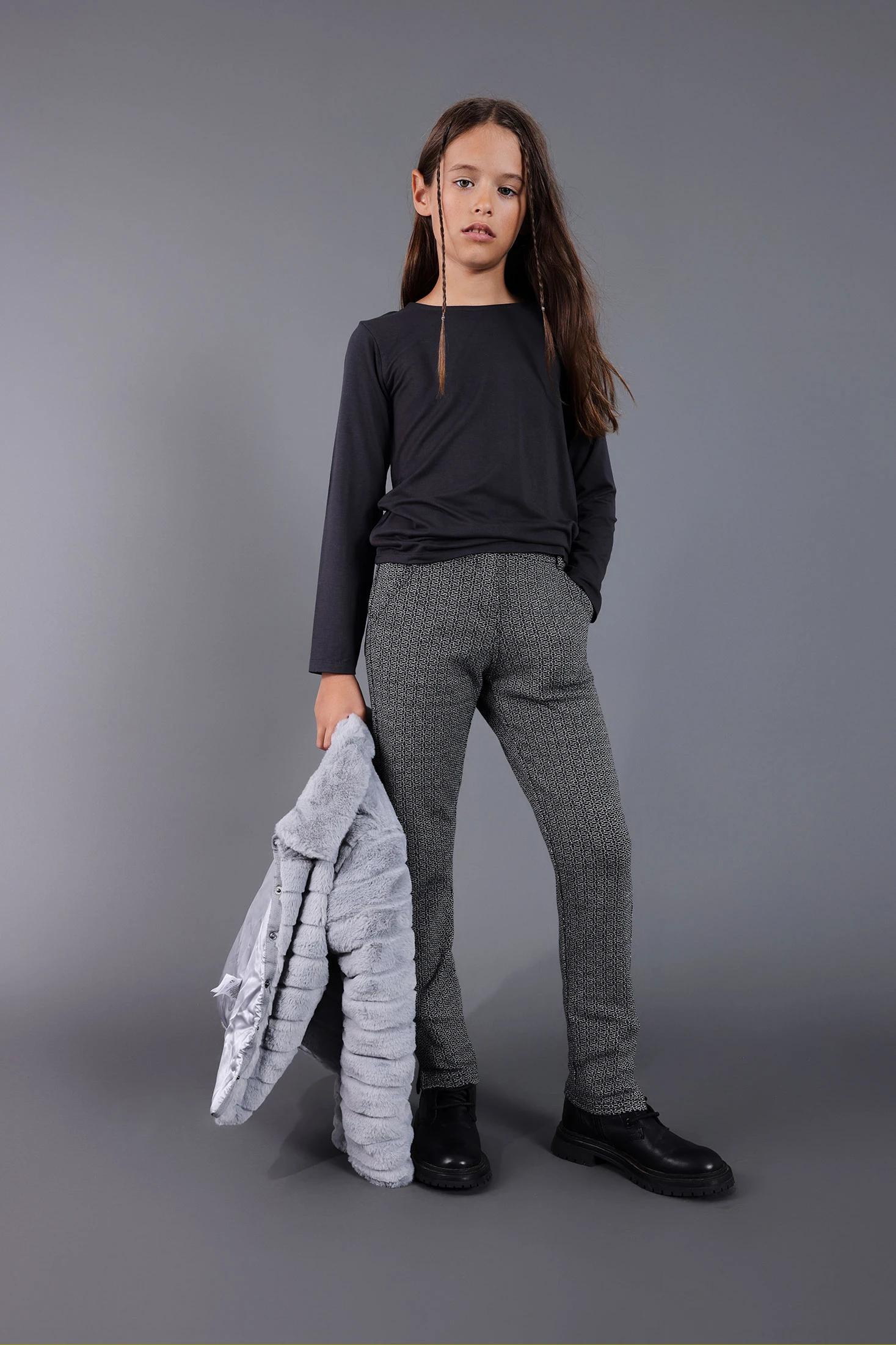 Pantalon pour fille en couleur noire avec un motif géométrique subtil, conçu pour offrir style et confort. Confectionné en tissu maille élastique, il facilite le mouvement et est idéal pour la saison automne-hiver. Sa coupe ajustée et sa taille élastique assurent un ajustement parfait et confortable. Disponible en tailles de 2 à 14 ans, il constitue un choix polyvalent, facilement combinable avec des pulls, manteaux ou t-shirts pour créer un look moderne et élégant.