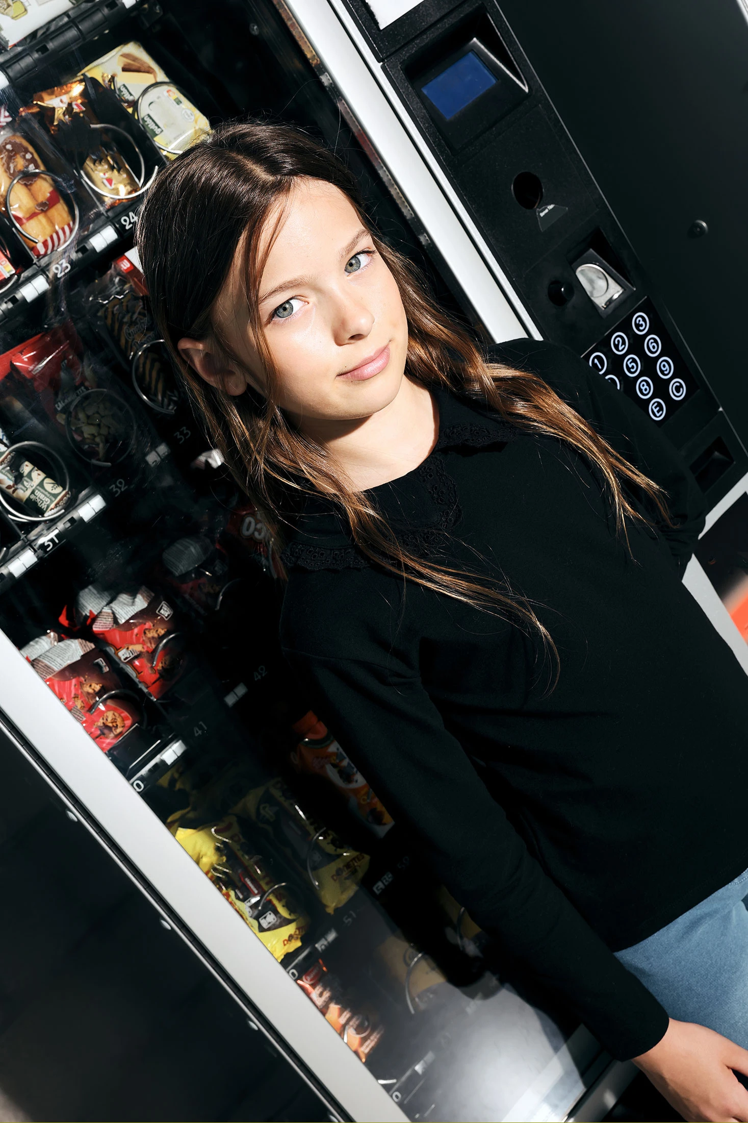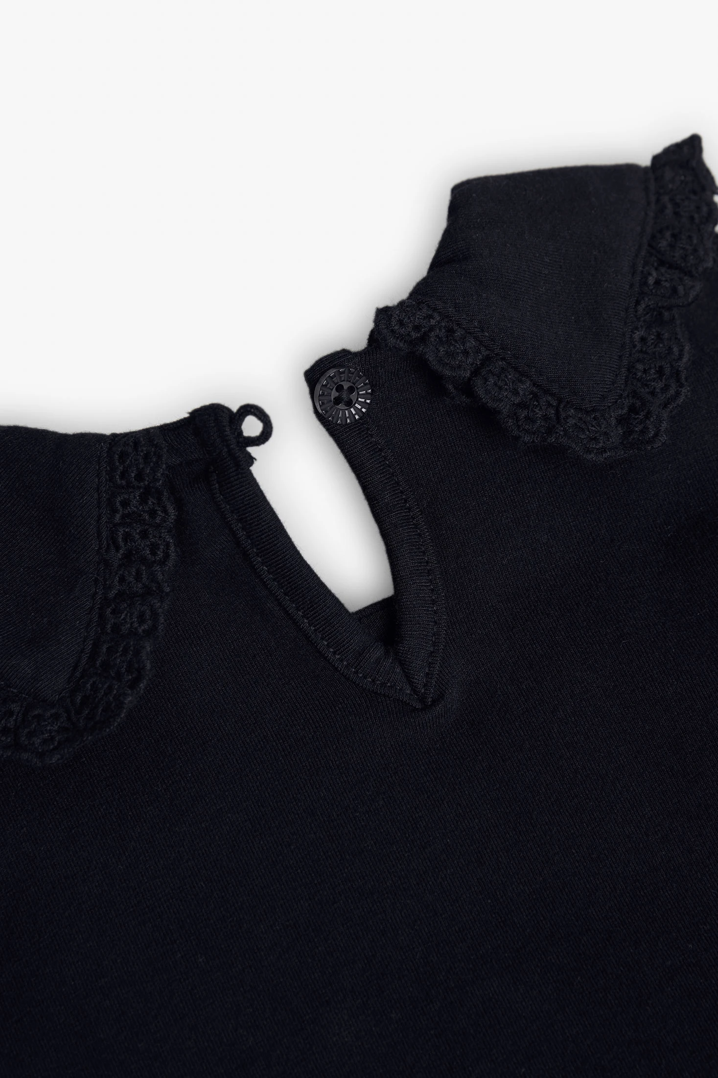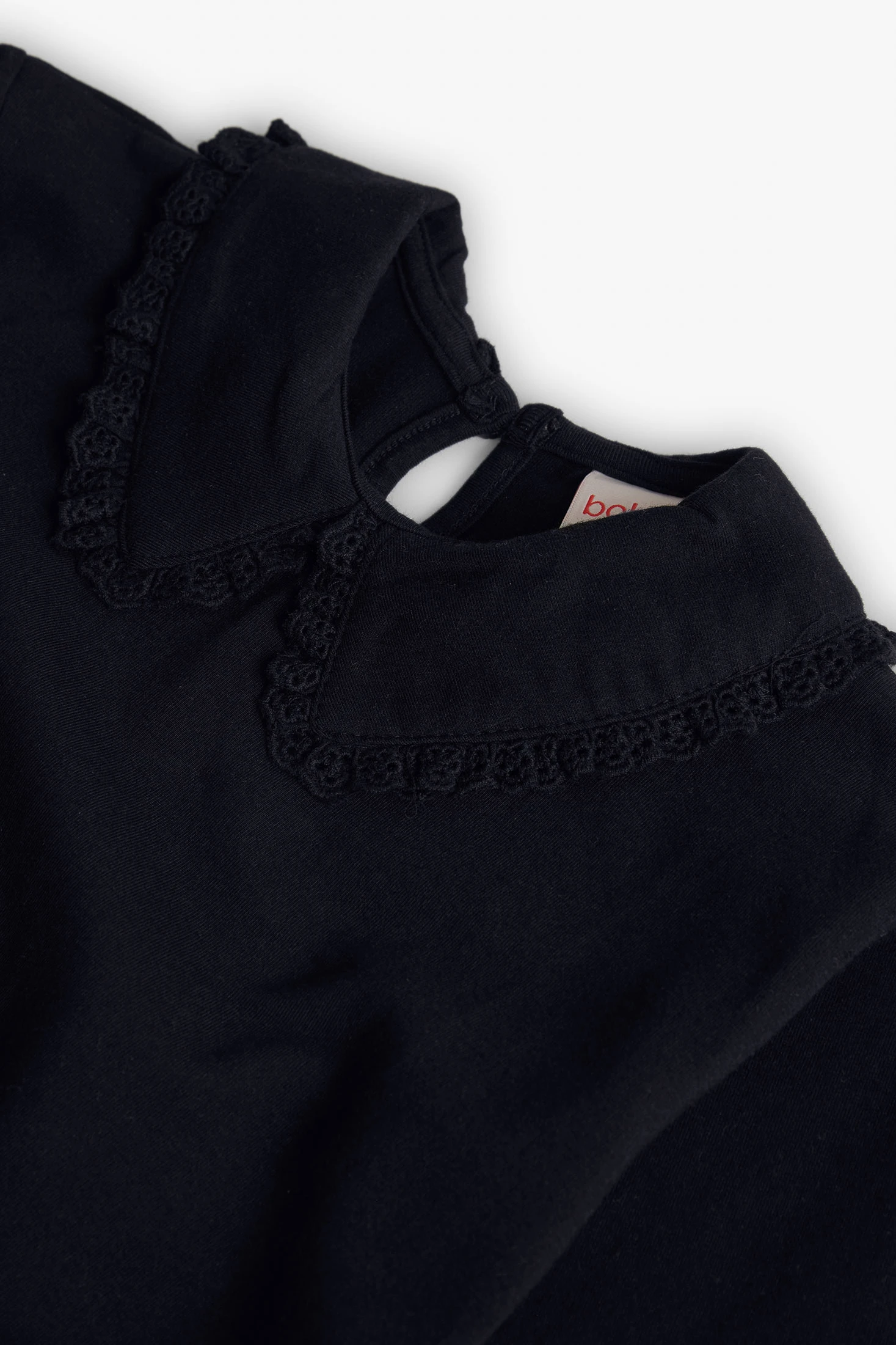 T-shirt noire en maille pour fille, conçue pour les saisons d'automne et d'hiver, offre confort et chaleur grâce à son tissu doux. Le design à col rond et manches longues s'adapte parfaitement pour maintenir le confort lors des journées froides. Disponible en tailles de 2 à 14 ans, son style uni fait d'elle un vêtement polyvalent, facile à assortir avec d'autres pièces, ajoutant une touche élégante et intemporelle à la garde-robe enfantine.