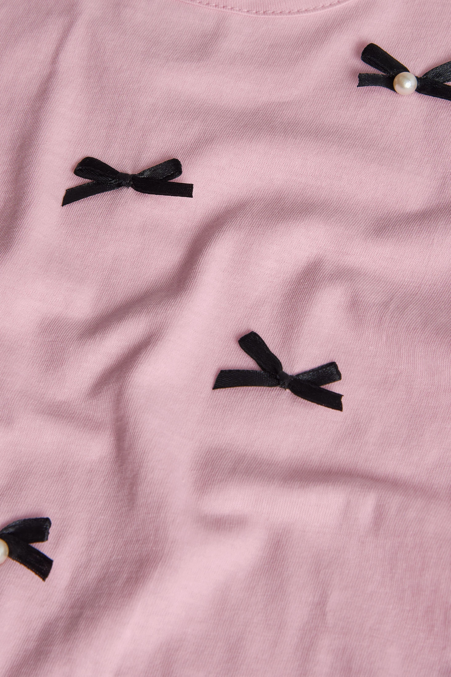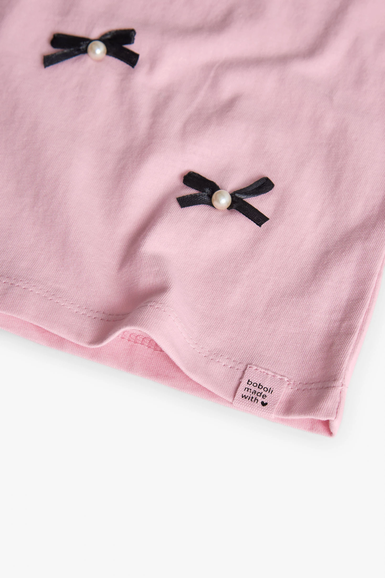 T-shirt en tricot rose avec nœuds, une option charmante pour les filles, idéale pour les saisons d'automne et d'hiver. Décorée avec de délicats nœuds noirs, elle ajoute une touche élégante et féminine à la tenue. Fabriquée avec des matériaux doux et confortables, elle est parfaite pour un usage quotidien tout en offrant de la chaleur grâce à ses manches longues et son col rond. Disponible en tailles allant de 2 à 14, elle se combine facilement avec des jupes, pantalons ou leggins, devenant un basique polyvalent et coquet pour toute garde-robe enfantine.