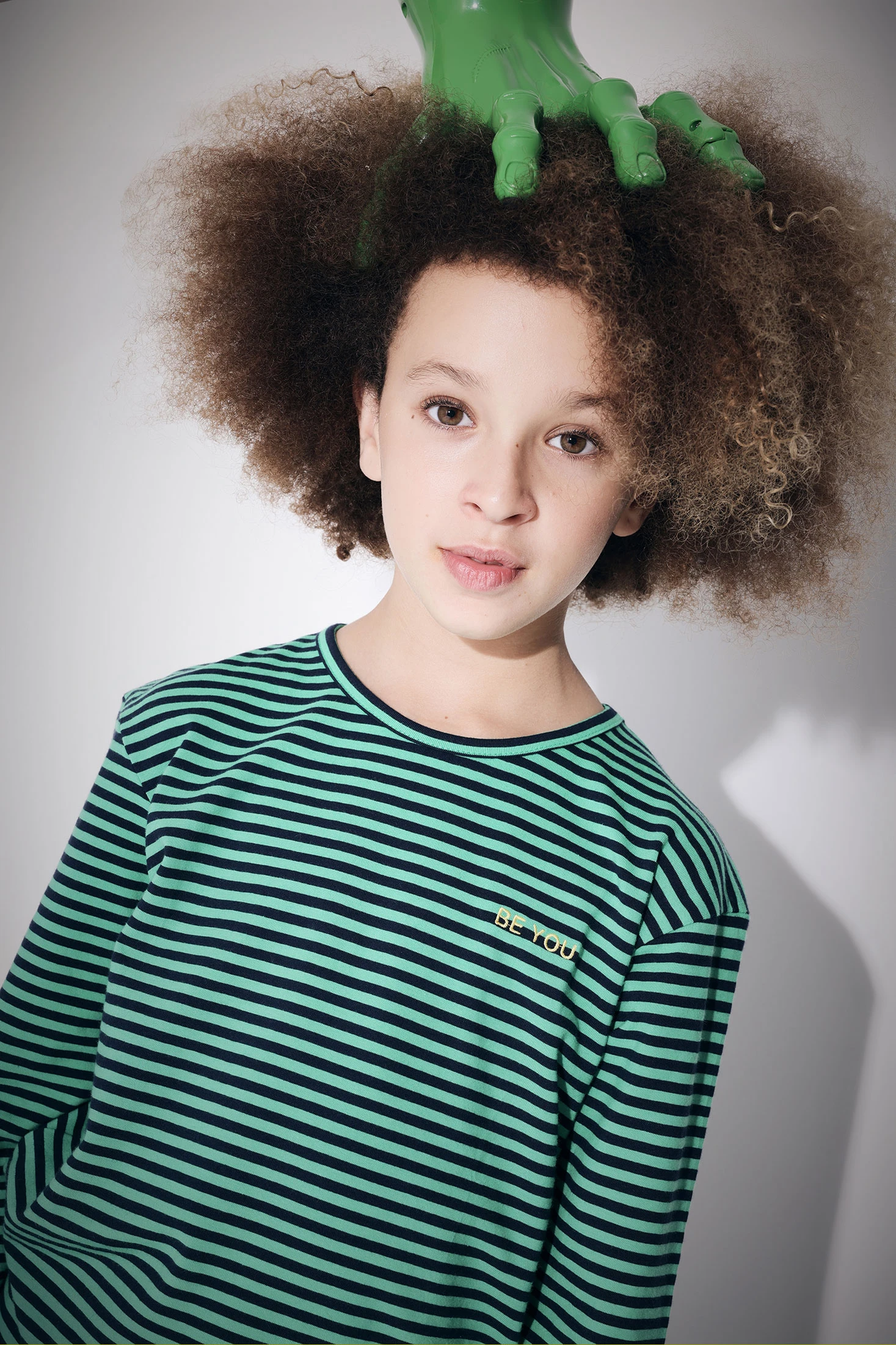 T-shirt fille rayée en maille vert et bleu marine