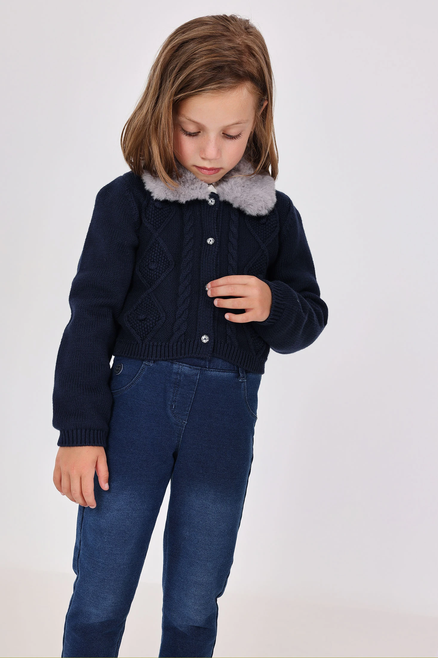 Veste en maille bleu marine pour fille, idéale pour garder votre petite confortable et au chaud pendant les mois froids. Confectionnée dans une matière tricotée chaude et douce, elle offre un design élégant et intemporel. Fermeture frontale à boutons assurant un ajustement simple et fiable. Disponible en tailles de 12 mois à 10 ans, elle s'associe parfaitement avec des robes et des leggins pour un look adorable. Parfaite tant pour les événements spéciaux que pour un usage quotidien en hiver.