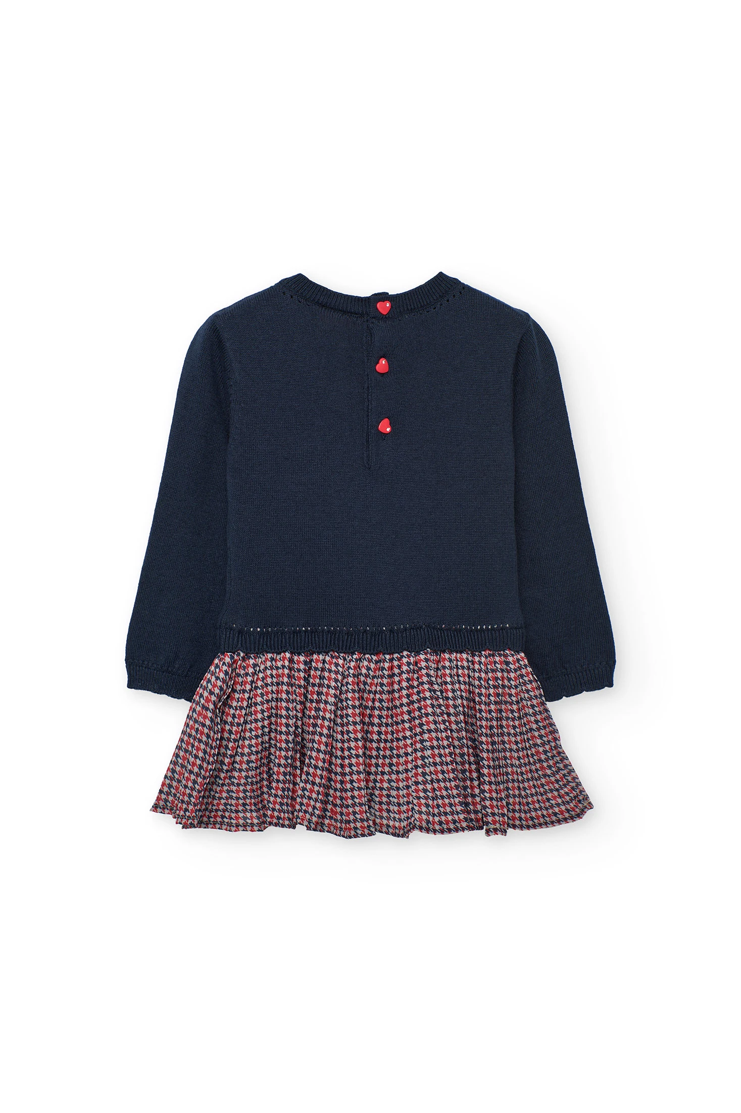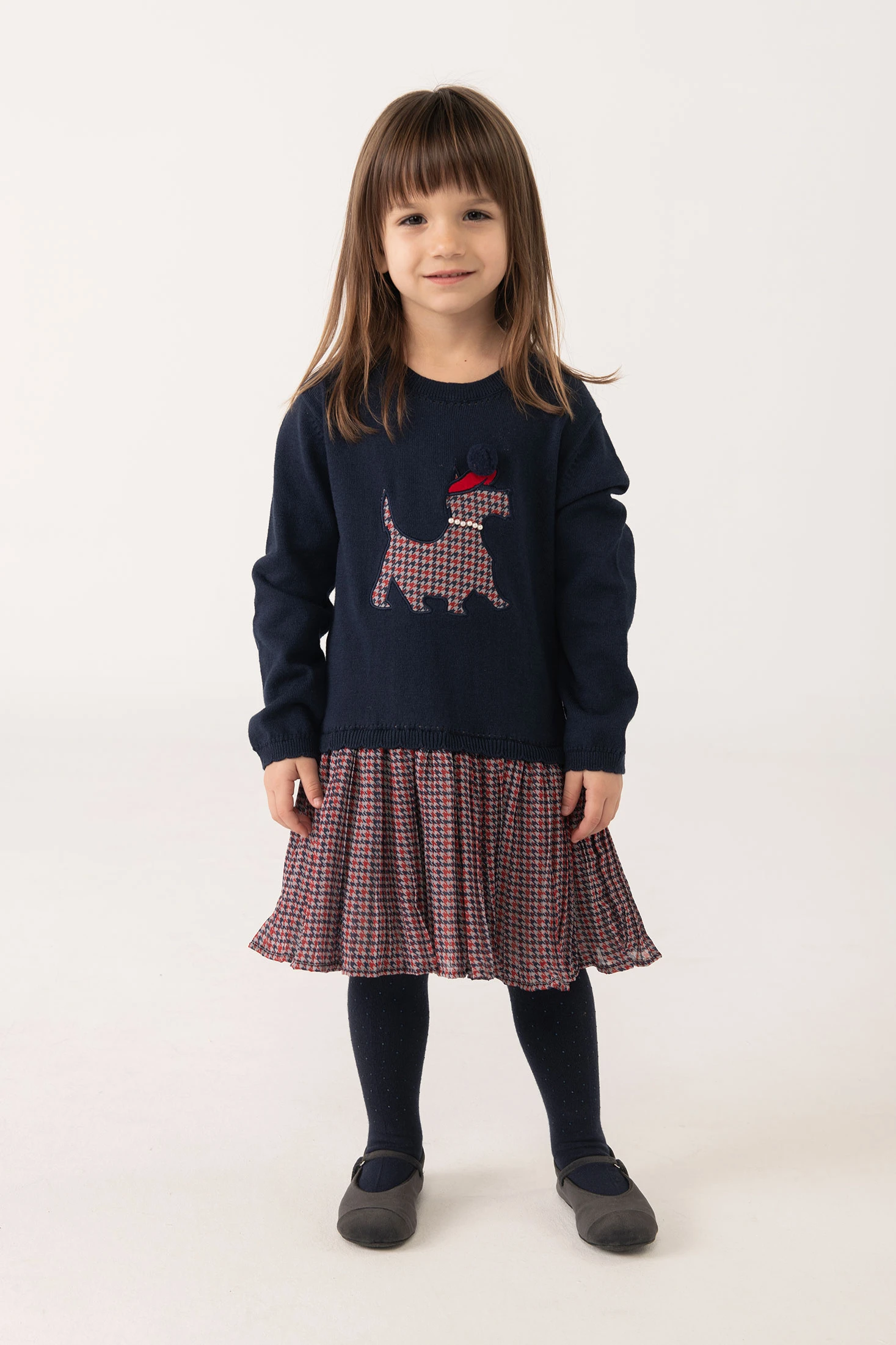Robe pour fille, idéale pour l'automne et l'hiver, confectionnée en doux tissu tricoté garantissant confort et chaleur. Elle présente une couleur bleu marine avec un élégant motif à carreaux, apportant une touche classique et stylisée. Le design inclut un col rond et des manches longues, parfait pour rester au chaud durant les journées froides. Disponible en tailles de 12 mois à 10 ans, elle peut être facilement associée à des collants ou des leggings pour obtenir une tenue complète et sophistiquée.