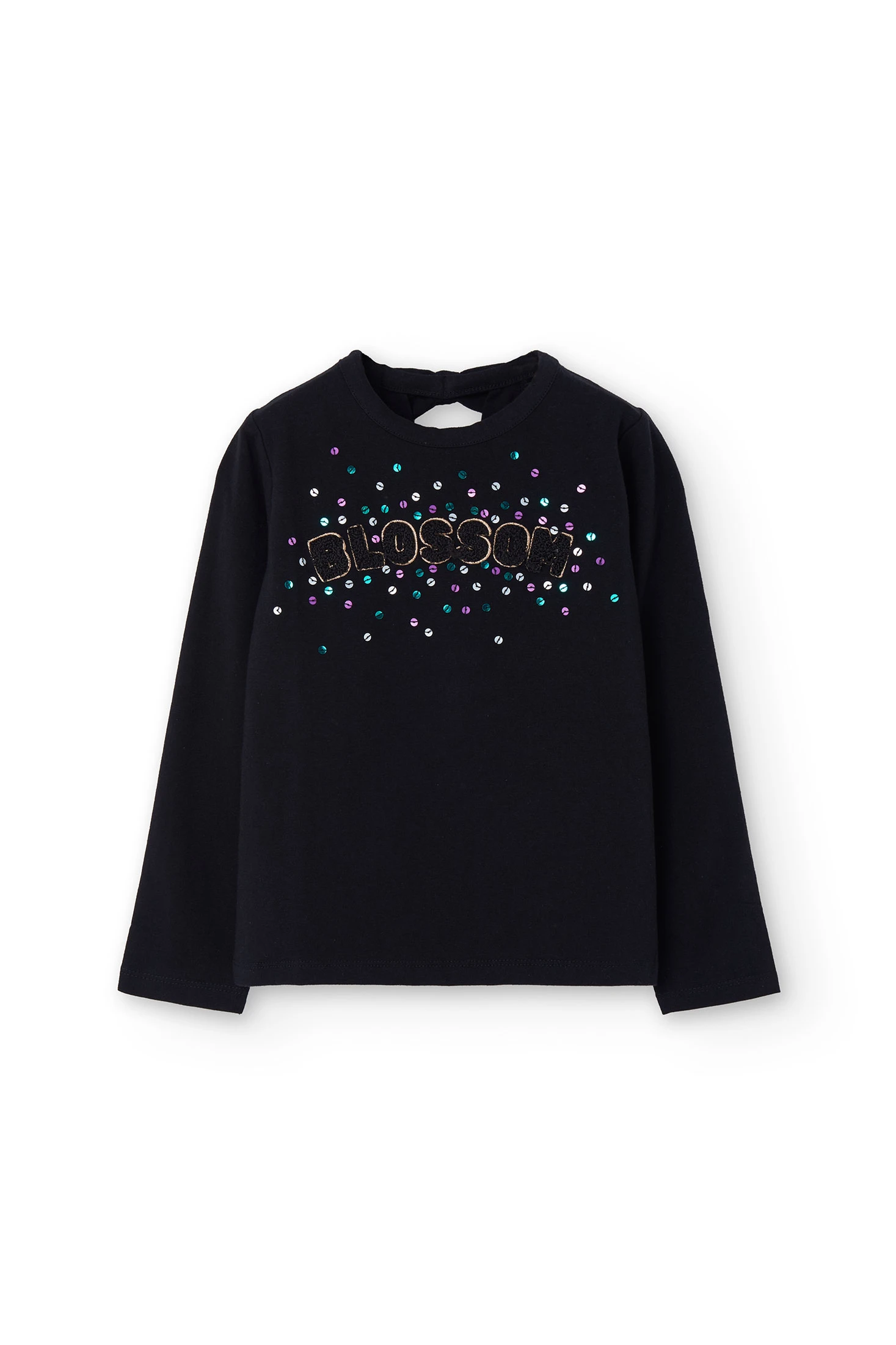 T-shirt en maille noire pour fille, confectionnée en doux coton, idéale pour les mois d'automne et d'hiver. Conçue avec des manches longues et un col rond, elle assure confort et chaleur lors des journées les plus froides. Disponible en tailles de 2 à 14 ans, elle permet des combinaisons polyvalentes avec des pantalons ou des jupes pour un look décontracté et moderne. Les détails métalliques décoratifs ajoutent une touche de style, faisant de ce t-shirt un choix moderne pour la garde-robe de toute fille.