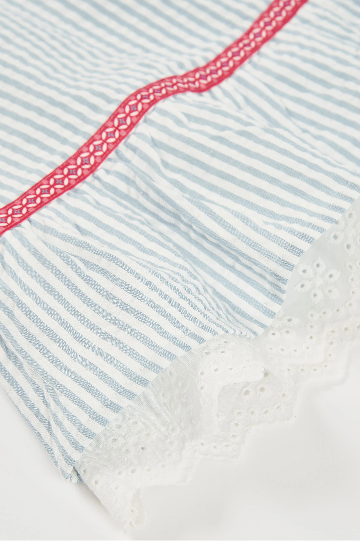 Jupe en popeline combinée, à rayures bleues et blanches et détail de ceinture imprimée en rose, idéale pour les filles de 12 mois à 4 ans. Son design présente un imprimé floral à la taille de couleur rose et un noeud décoratif. Le tissu à rayures verticales bleues et blanches offre un style classique et frais. Elle est légère, parfaite pour l'été, et comporte un liseré blanc en bas qui ajoute une touche délicate. Elle se marie bien avec des blouses ou des t-shirts de couleurs unies, étant une option polyvalente et charmante pour le quotidien.