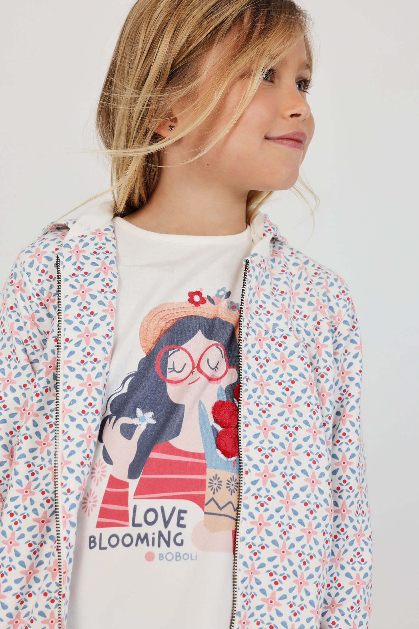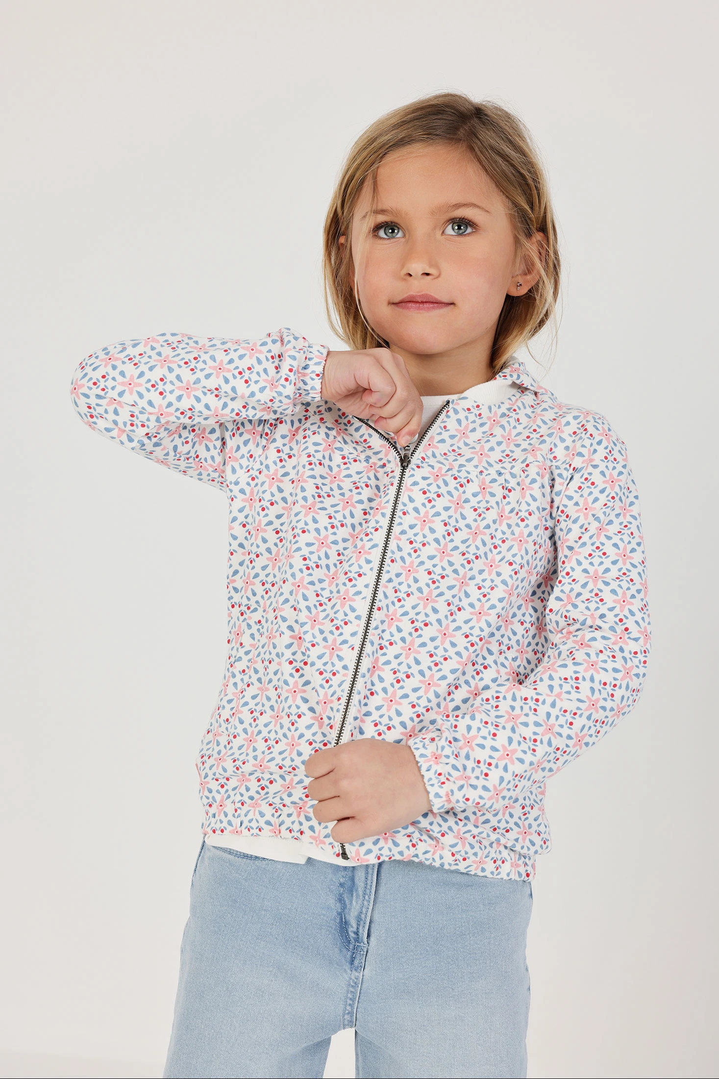 Veste en peluche pour fille. Elle présente un imprimé coloré dans les tons bleu et rose sur fond blanc. Sa fermeture est à glissière et le design inclut une capuche amovible. Disponible en tailles allant de 12 mois à 10 ans. Avec ses manches longues, elle est idéale à assortir avec des pantalons et des jupes, ajoutant une touche gaie à la garde-robe de n'importe quelle fille.
