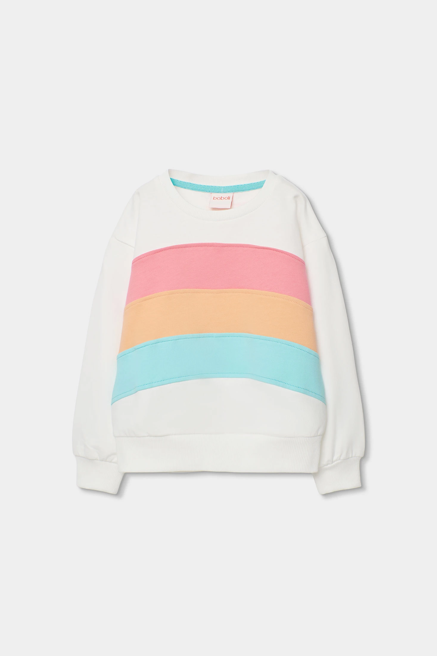 Sweatshirt en molleton blanc pour fille, parfait pour la mi-saison. Confectionnée dans un tissu doux et confortable, elle présente un design joyeux avec des bandes de couleurs rose, orange et bleu sur la poitrine. Ses manches longues et son col rond offrent de la chaleur pour les jours plus froids. Disponible en tailles allant de 12 mois à 14 ans, elle est idéale à assortir avec des jeans ou des leggings. Son style polyvalent en fait une pièce essentielle pour la garde-robe de toute fille, ajoutant une touche de couleur et de fun à son quotidien.