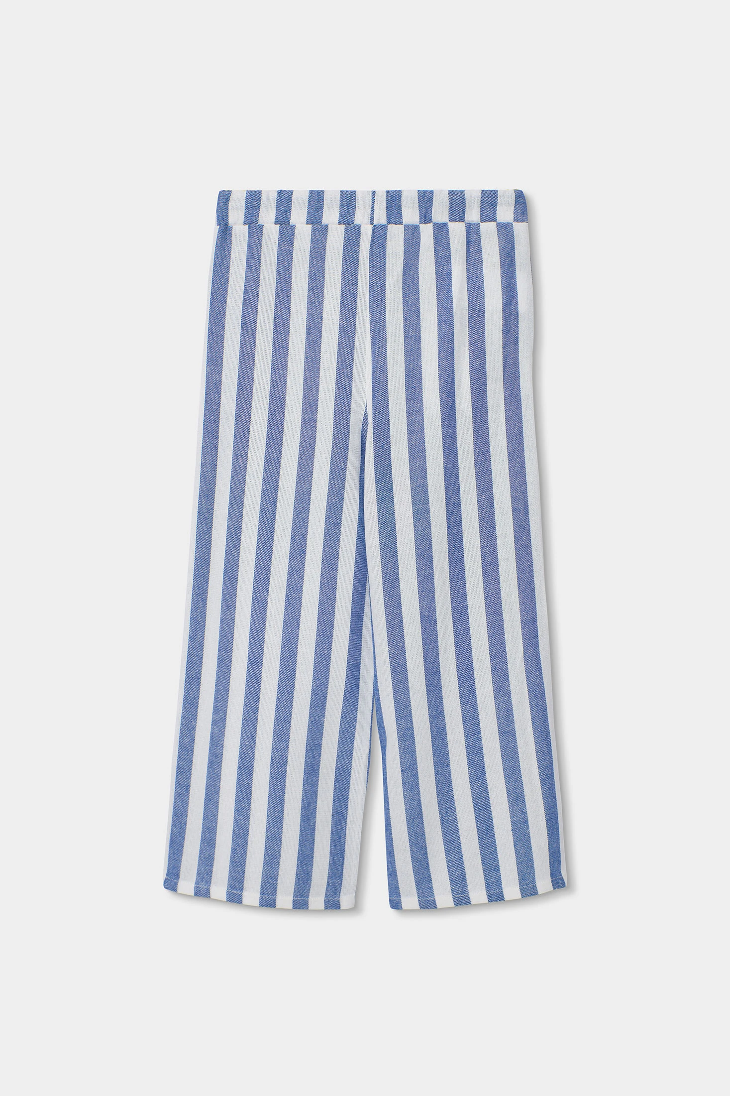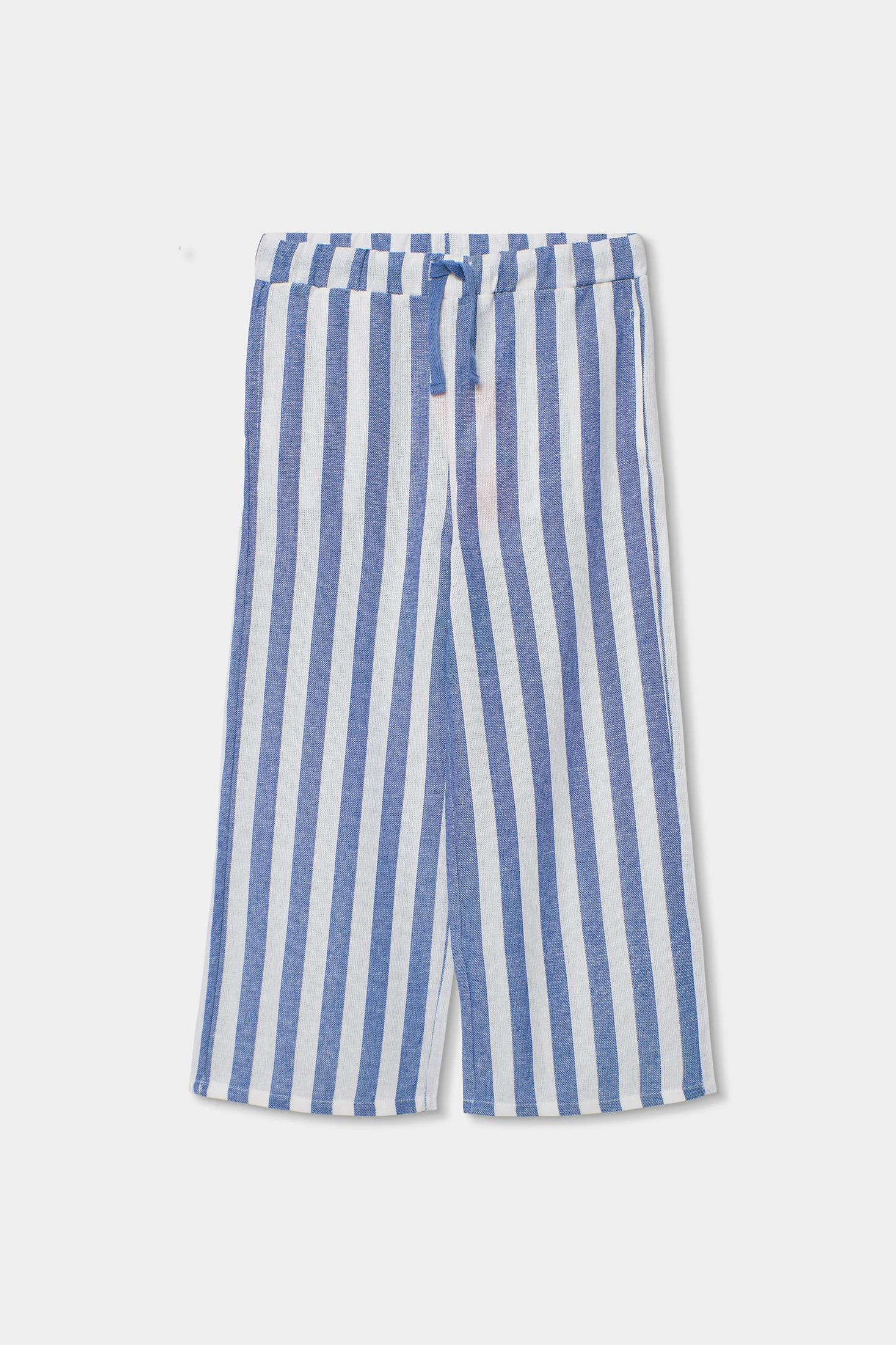 Pantalon en lin rayé pour fille offre une apparence fraîche et confortable. Le matériau en lin garantit fraîcheur et légèreté, parfait pour les jours chauds. Ils présentent un design à rayures verticales en bleu et blanc qui ajoute une touche classique et élégante. La taille ajustable apporte confort et un ajustement parfait. Disponibles en tailles de 12 mois à 14 ans, ils sont une option polyvalente à combiner avec des t-shirts ou des chemisiers dans des tons clairs pour un look estival.