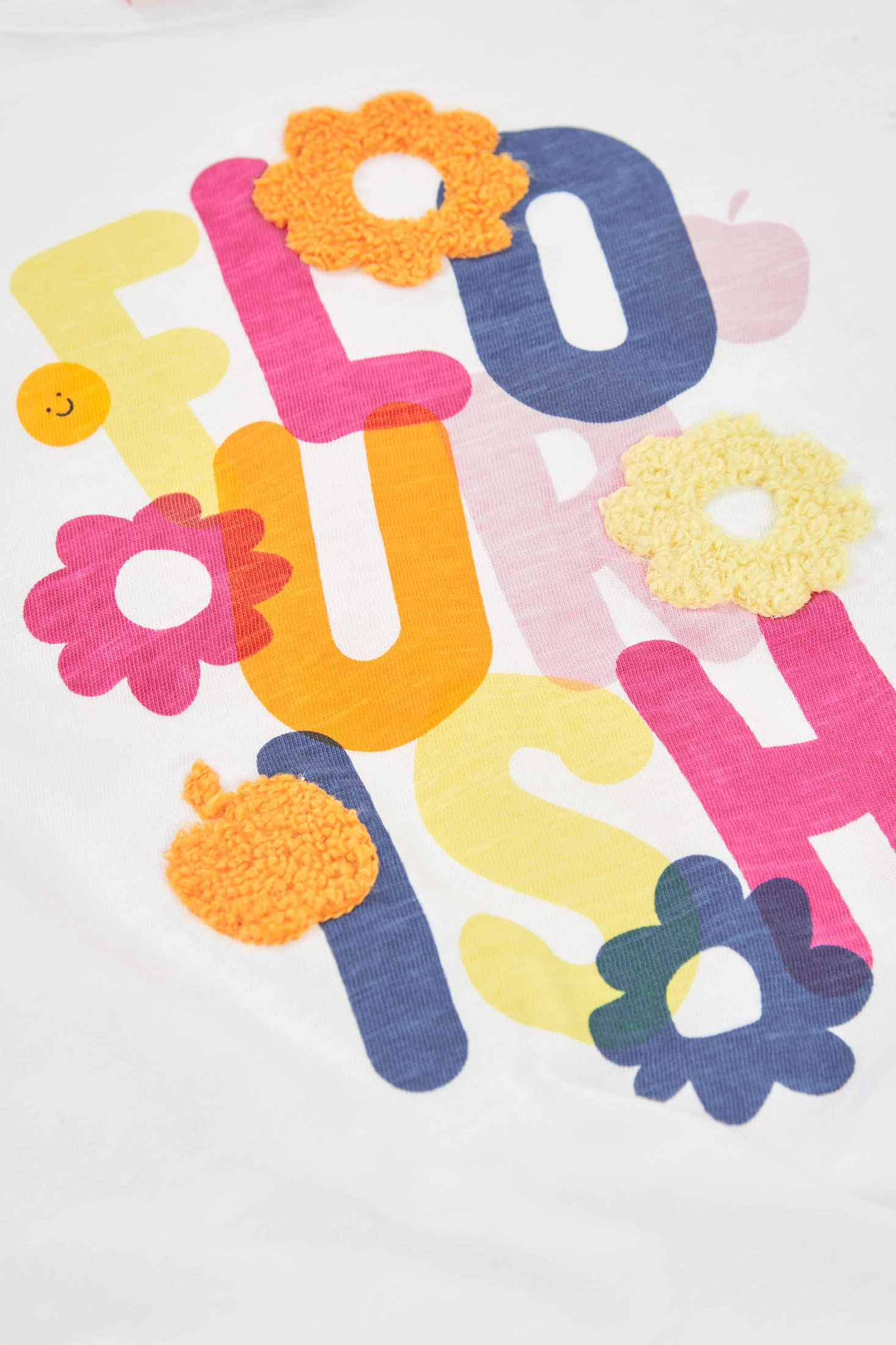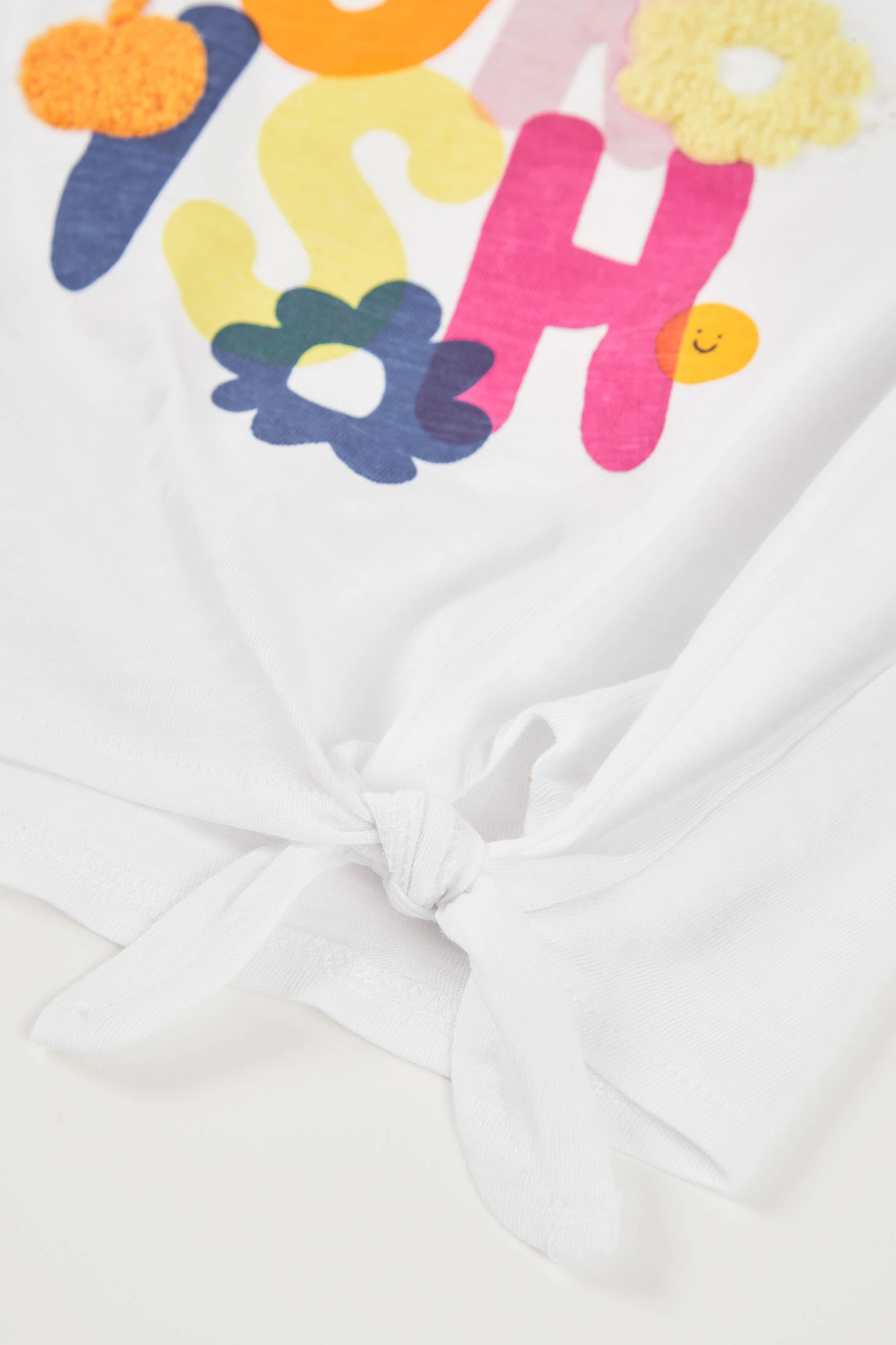 T-shirt à manches longues pour fille confectionnée en tissu jersey blanc, offrant confort et style. Elle présente un design amusant avec des lettres et des fleurs aux couleurs vives sur le devant. Finition avec un noeud latéral qui lui donne une touche moderne et décontractée. Idéale pour les âges de 12 mois à 14 ans. Parfaite pour être associée à des jeans ou des jupes lors des journées fraîches d'automne et d'hiver, apportant un look décontracté et joyeux.