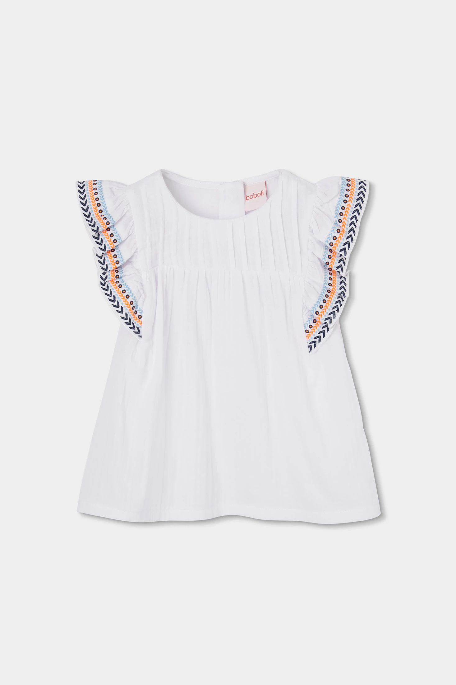 Blouse en tissu fantaisie blanche pour fille, idéale pour les journées ensoleillées. Sa matière légère et fraîche est parfaite pour l'été. On remarque les manches avec des détails brodés de couleurs vibrantes, qui ajoutent une touche amusante et élégante. Disponible en tailles de 12 mois à 14 ans. Cette blouse se marie parfaitement avec des shorts ou des jupes pour un look décontracté mais stylé en toute occasion.