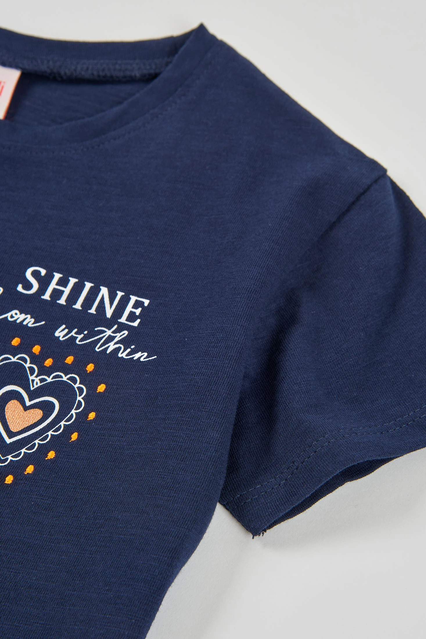 T-shirt en coton pour fille, idéale pour n'importe quelle saison. De couleur bleu marine, elle offre un design avec un imprimé de coeur et la phrase « Shine from within » sur le devant, ajoutant une touche inspirante. Son tissu doux et confortable est parfait pour un usage quotidien. Avec un col rond et des manches courtes, elle se combine facilement avec différentes tenues. Disponible dans les tailles allant de 12 mois à 14 ans, le t-shirt est une option polyvalente et pratique pour s'habiller avec style et confort.