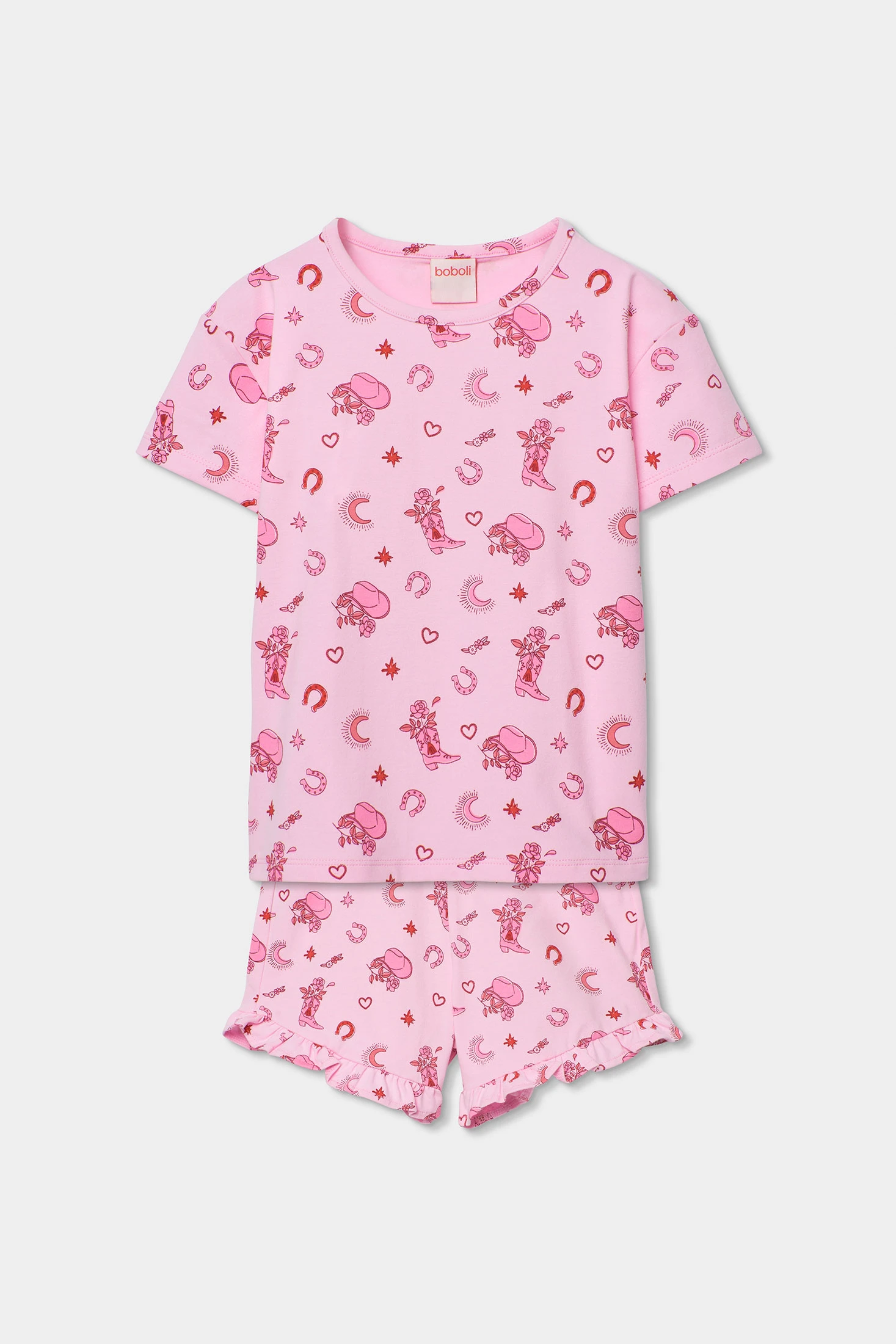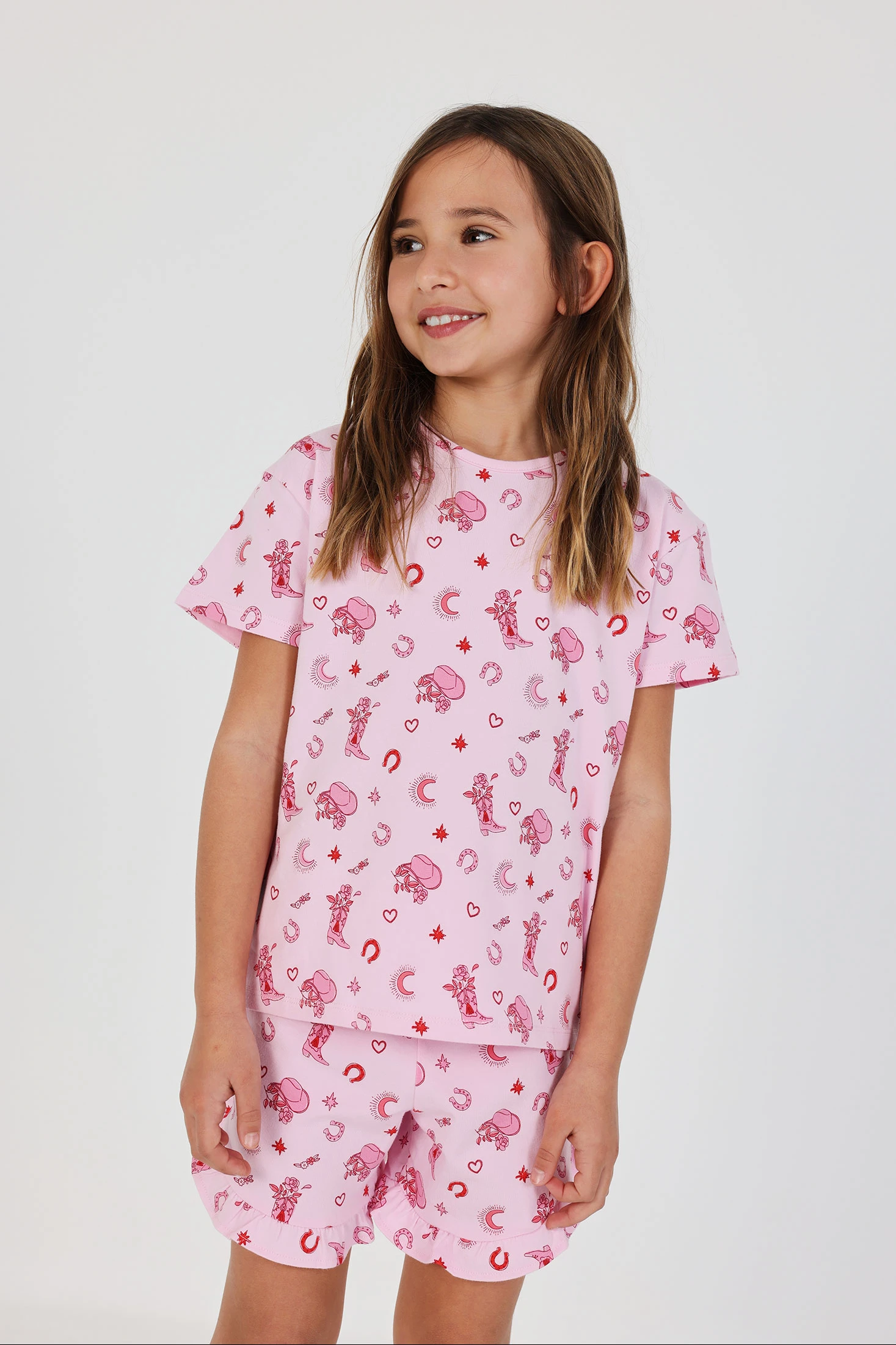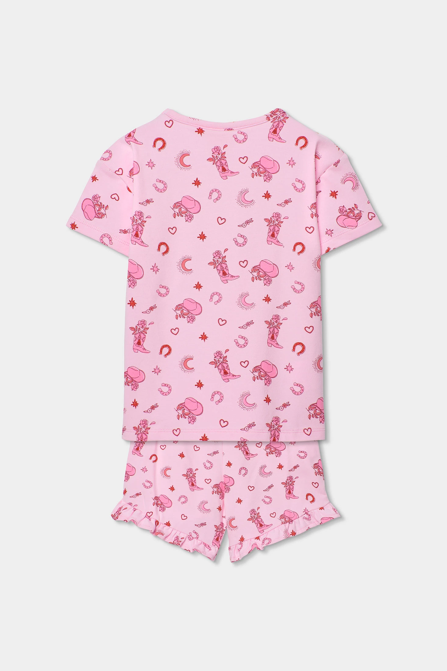 Pyjama en maille imprimé pour fille idéal pour des nuits confortables. Décoré avec divers motifs ludiques sur un fond rose, il offre une touche joyeuse et féminine. Son matériau en maille procure douceur et confort. Disponible en tailles de 2 à 14 ans, il s'adapte à la croissance des filles. Conçu avec des manches courtes et un pantalon à volants, il est parfait pour garder les petites fraîches et à l'aise pendant les nuits chaudes. Les tonalités de l'imprimé ajoutent une touche amusante et charmante.