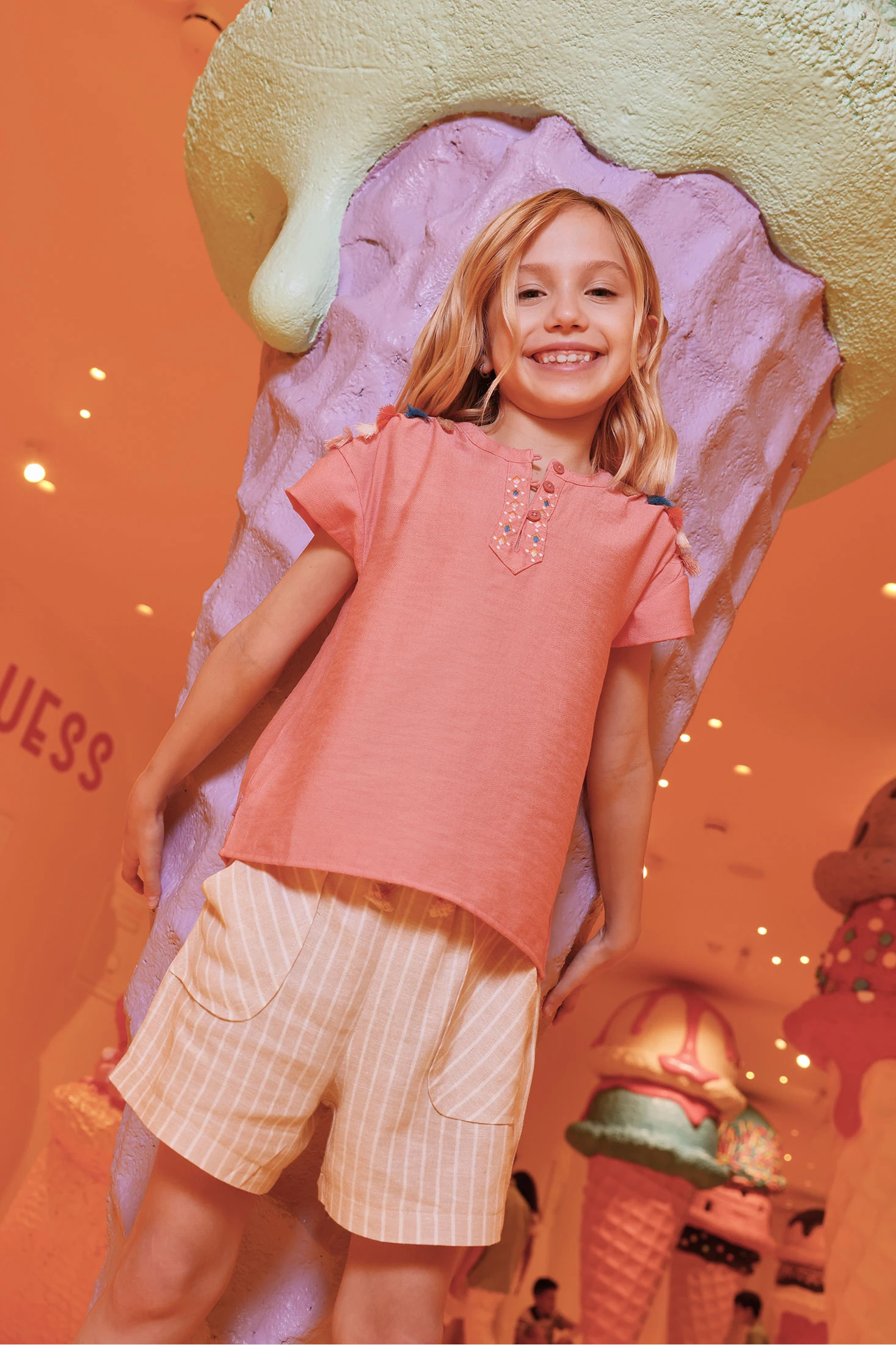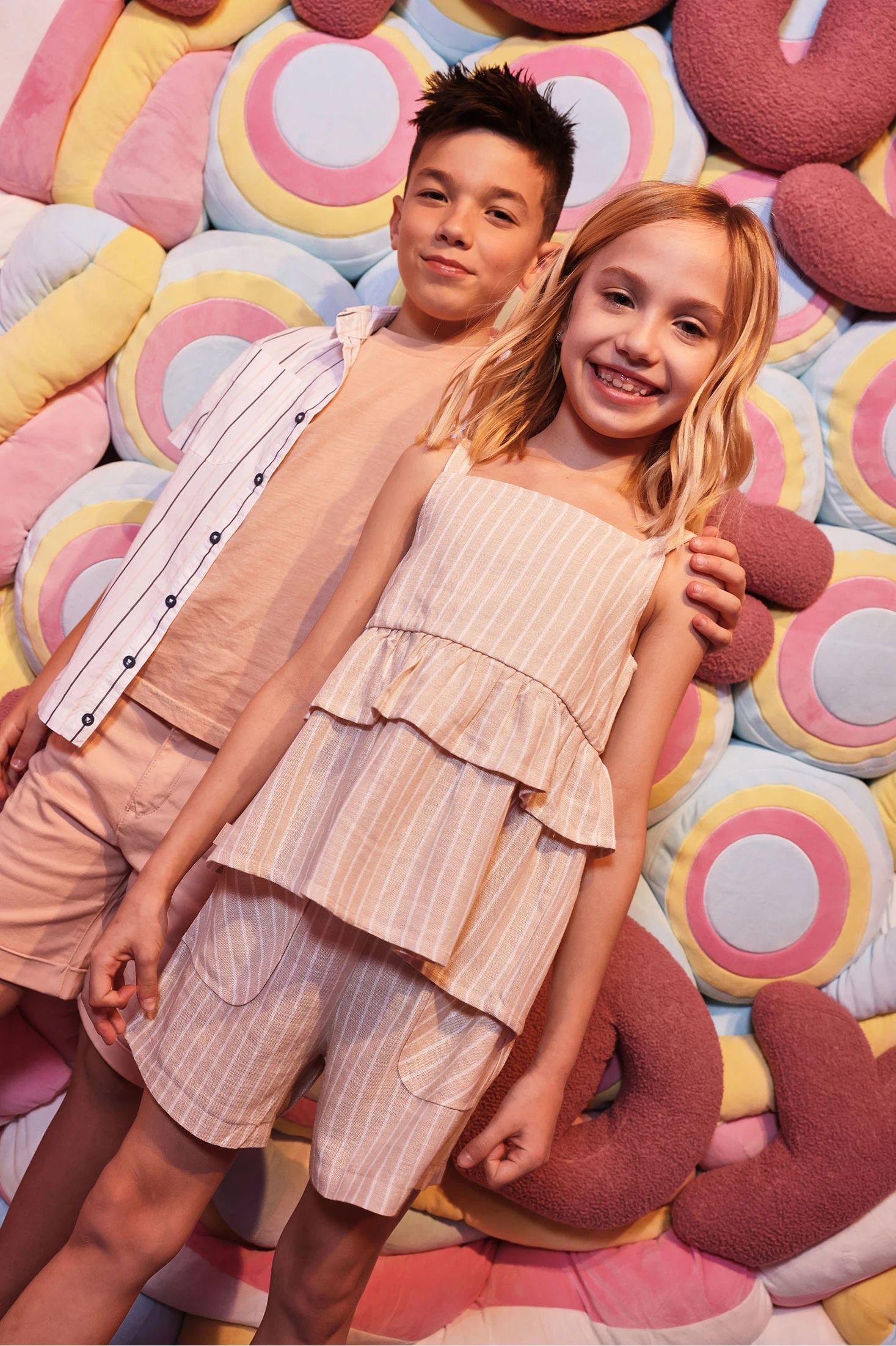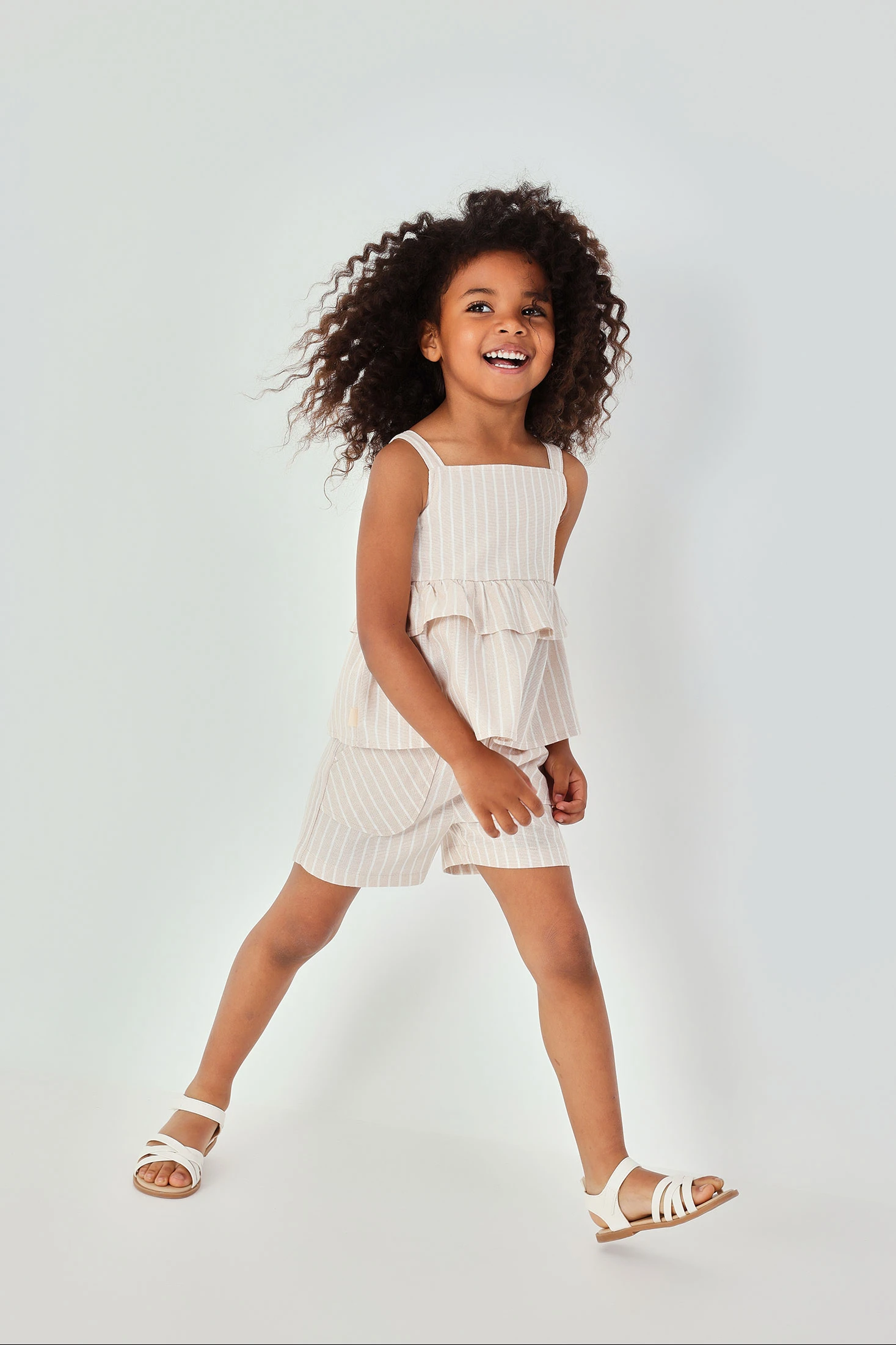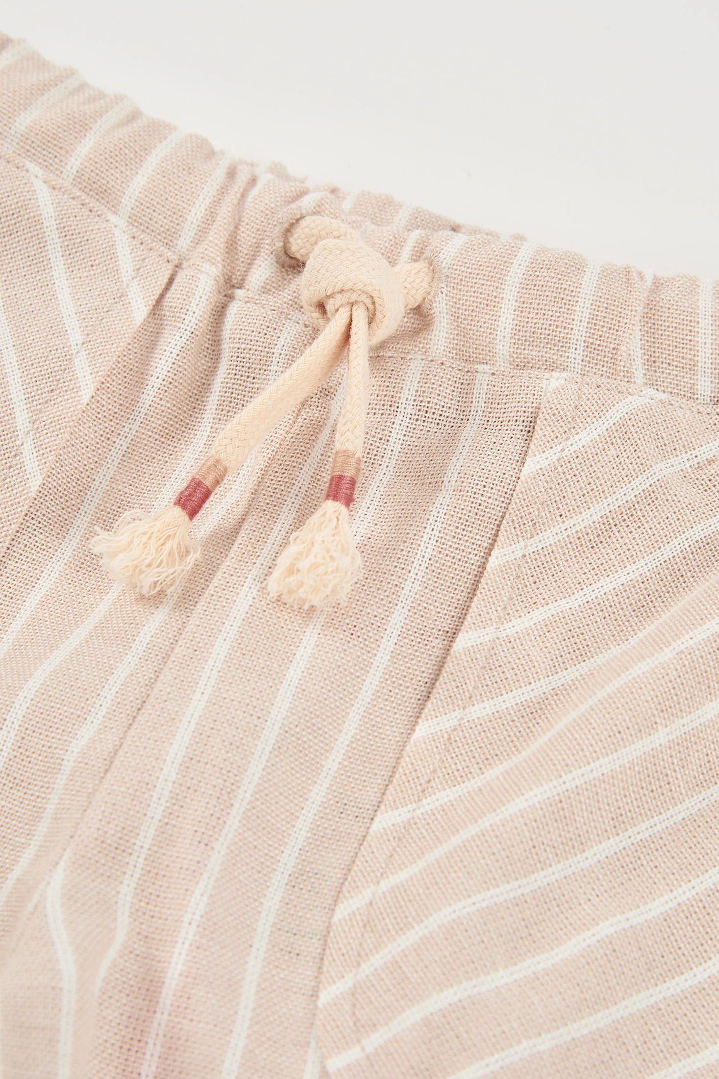 Bermuda en lin rayé, parfaite pour les tout-petits au printemps et en été. Fabriquée dans un tissu léger et respirant, elle offre confort et fraîcheur. Son design à rayures en tons beige est élégant et polyvalent. Elle inclut un noeud ajustable à la taille pour un ajustement parfait. Disponible en tailles pour des âges allant de 12 mois à 10 ans, elle est idéale pour toute occasion décontractée ou formelle. Se marie bien avec des t-shirts de couleurs neutres ou à motifs doux, apportant une touche de style sophistiqué à la garde-robe des enfants.