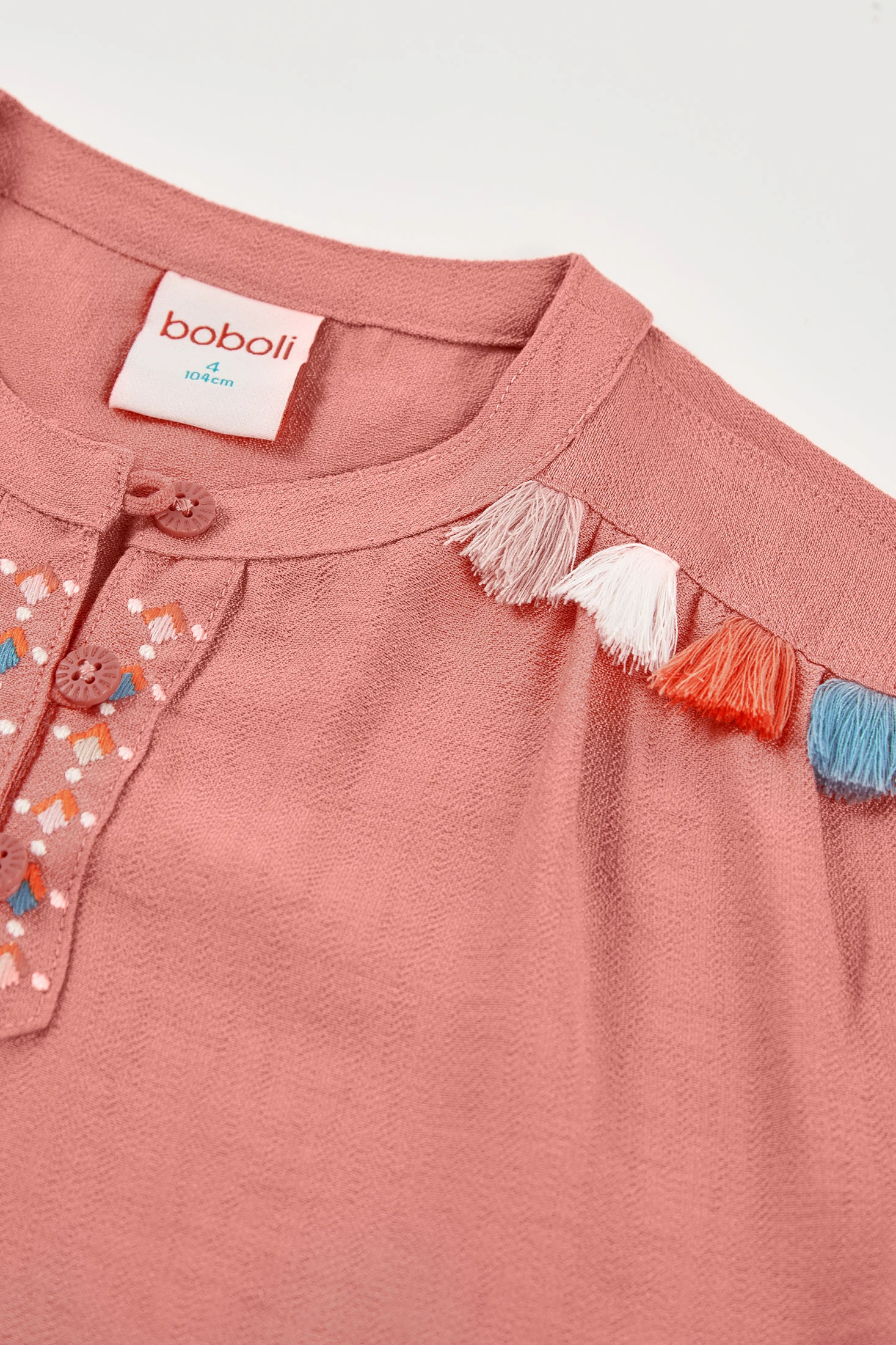 Chemise en tissu fantaisie de couleur rose pour fille, idéale pour un look vibrant et chic. Présente des détails de pompons colorés sur les épaules et une broderie décorative sur le devant. Le tissu avec viscose assure confort et douceur. Les tailles vont de 12 mois à 12 ans. Parfaite pour assortir avec des jupes ou des pantalons, c'est une option polyvalente pour toute occasion. Son design joyeux et moderne ajoute une touche de style à n'importe quelle tenue.