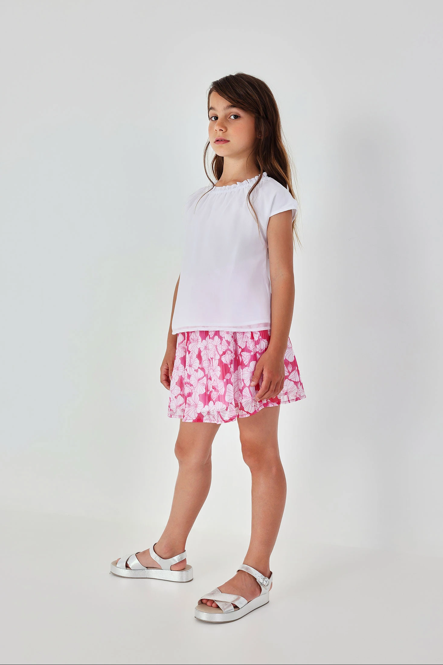Jupe en mousseline imprimée pour fille idéale pour ajouter une touche de style frais et joyeux. Disponible en tailles de 2 à 14 ans. Son design léger et fluide en couleur rose avec un imprimé floral est parfait pour les occasions spéciales ou le quotidien. Le matériau en mousseline offre confort et mouvement, tandis que sa taille élastique assure un ajustement confortable. Se marie parfaitement avec des t-shirts simples ou des blouses élégantes, offrant polyvalence pour différents styles et événements.