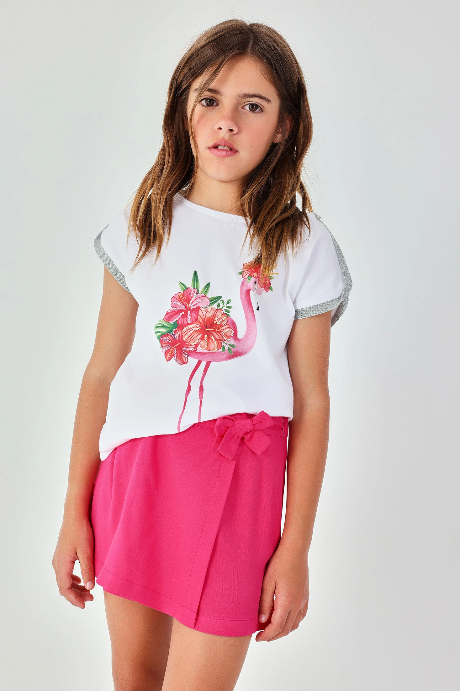 Jupe-short pour fille qui se distingue par sa polyvalence, idéale pour l'été. Avec une couleur fraise vibrante, le design inclut un noeud décoratif qui ajoute une touche charmante. Fabriquée dans un tissu doux et confortable, elle est parfaite pour le quotidien. Disponible en tailles de 2 à 14 ans, ce vêtement combine fonctionnalité et style. Idéale à associer avec des t-shirts légers, c'est une option pratique pour garder les filles à l'aise et stylées pendant les mois les plus chauds.