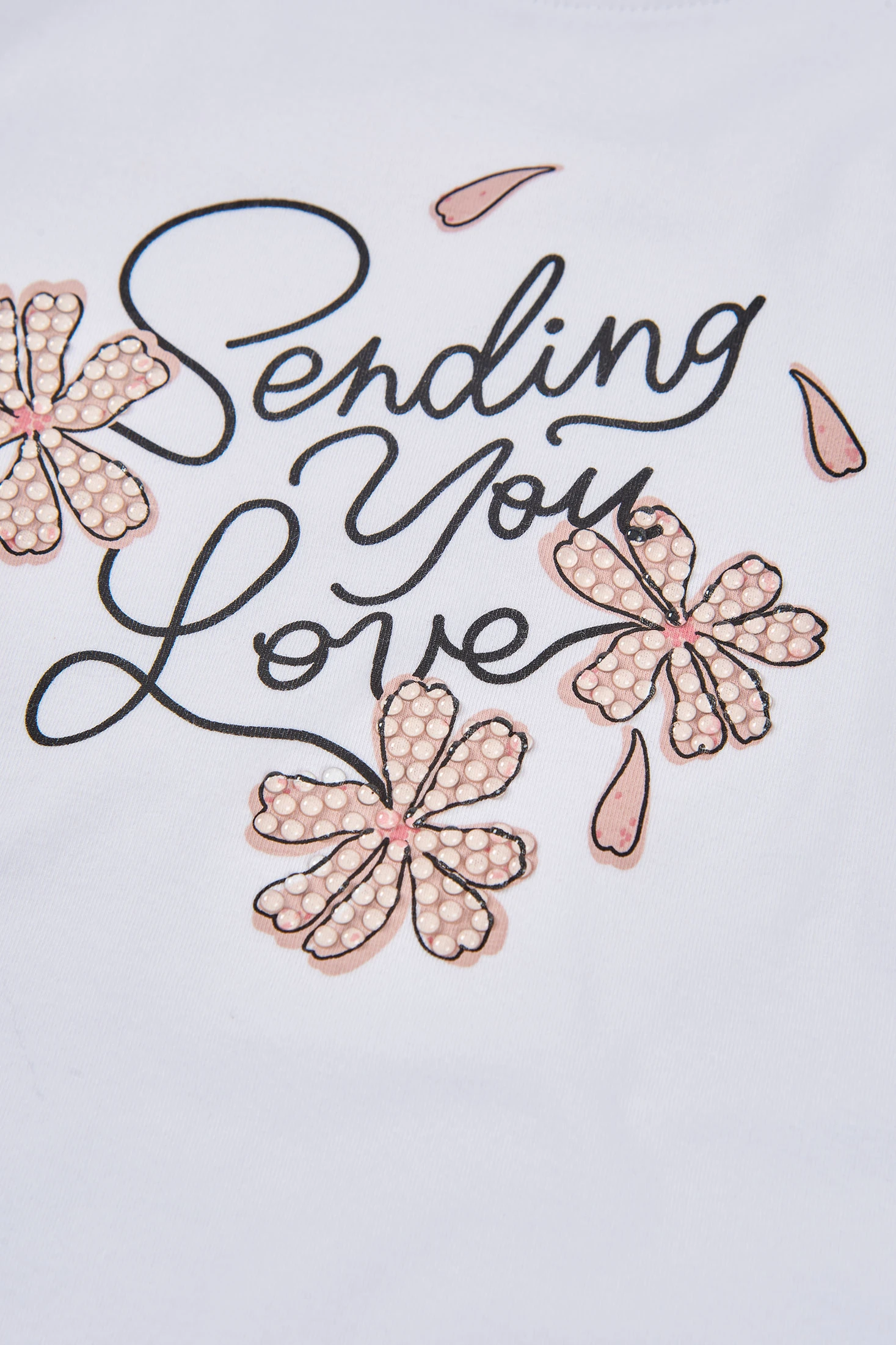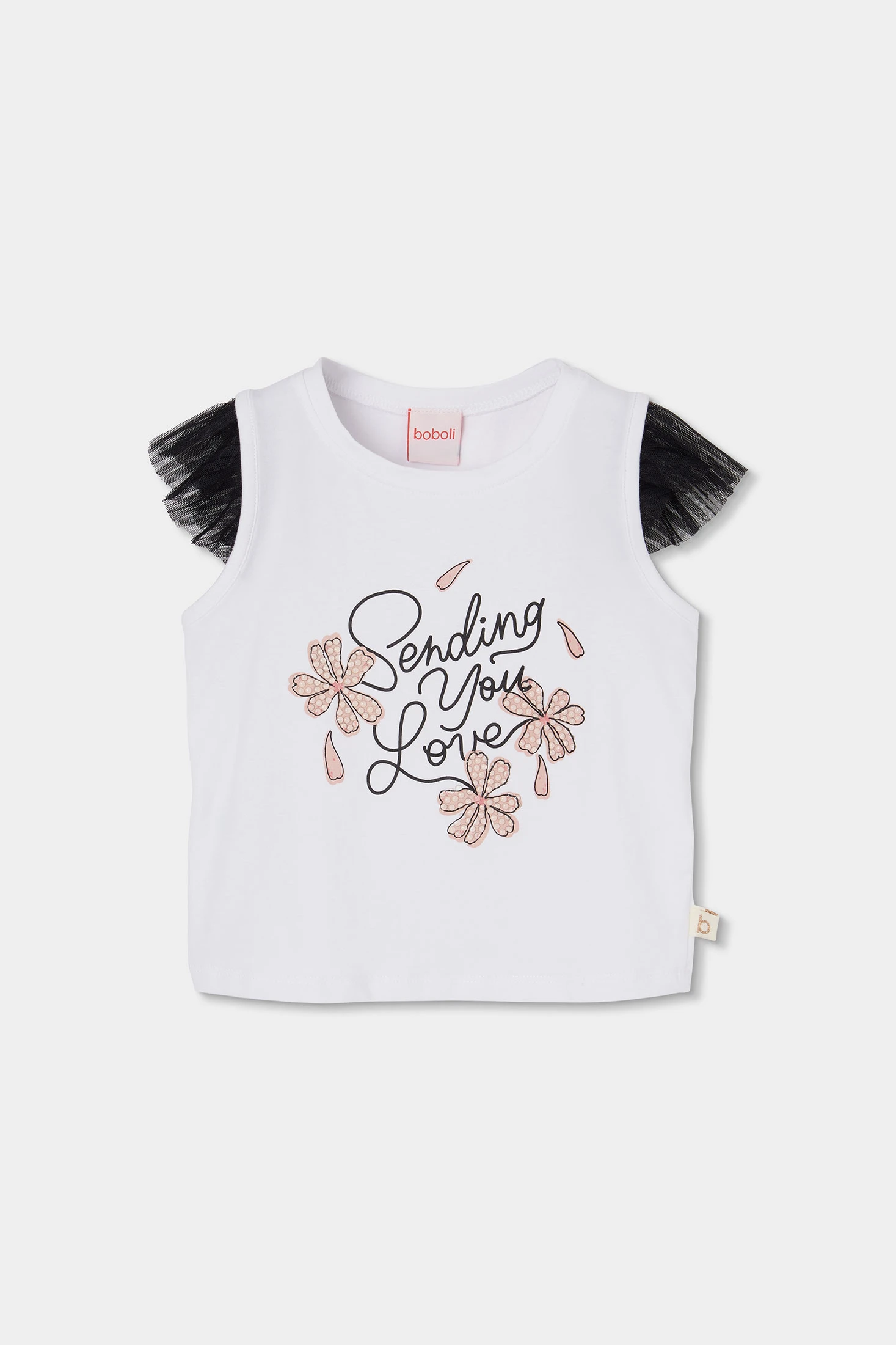 T-shirt en coton blanc pour fille, idéale pour le printemps et l'été. Elle présente un design avec un message central entouré de fleurs et des détails en tulle noir sur les épaules, apportant une touche élégante. Son tissu en coton assure fraîcheur et confort. Disponible en tailles de 2 à 14 ans. Se marie facilement avec des jeans ou des jupes, parfaite pour un look décontracté et chic.
