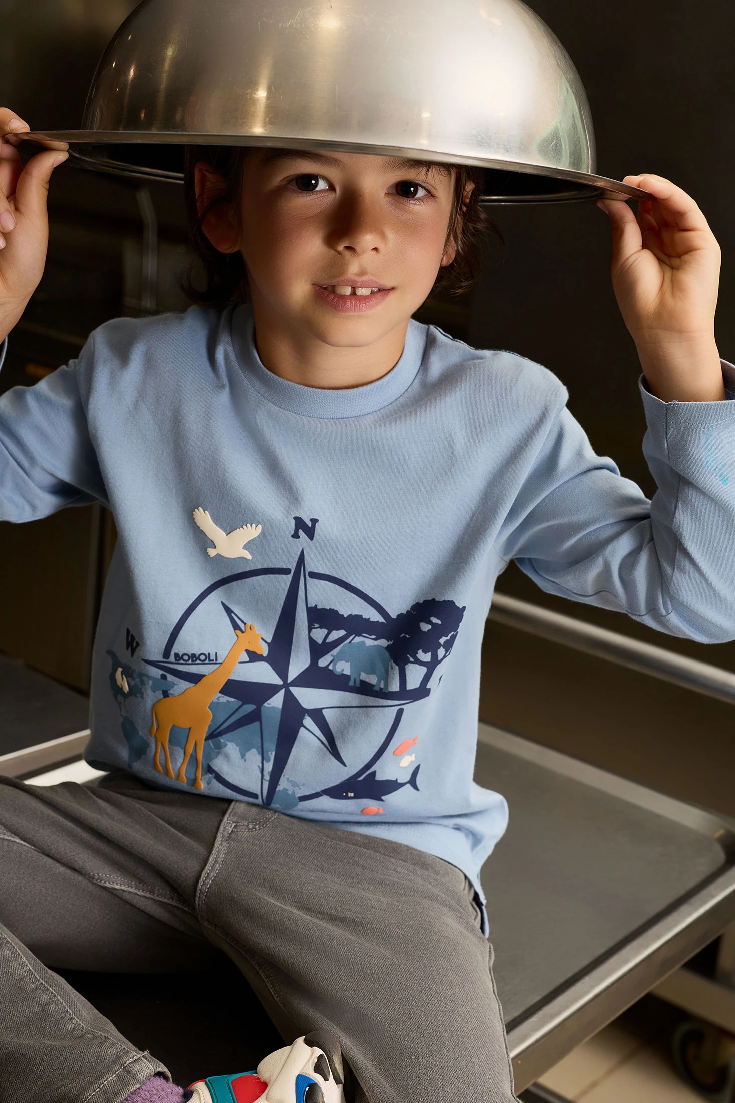T-shirt grise en coton pour garçon, ornée d'un design de boussole et d'animaux tels que des girafes, des oiseaux et des poissons, idéale pour les saisons d'automne et d'hiver. Confectionnée en tissu de maille doux, elle est dotée de manches longues et d'un col rond qui offrent confort et chaleur. Disponible en tailles allant de 12 mois à 10 ans, c'est un vêtement polyvalent qui peut être facilement associé à des jeans ou des pantalons de sport pour un style décontracté et explorateur.