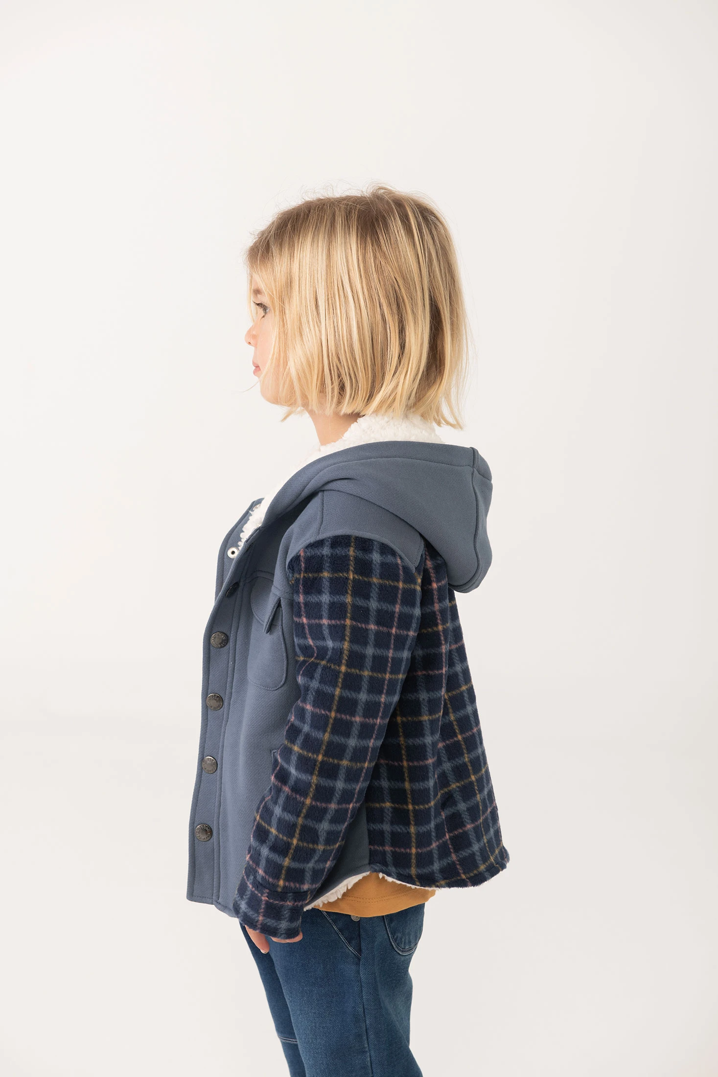 Veste en flanelle à carreaux pour garçon en bleu constitue un choix idéal pour garder votre enfant bien au chaud pendant les saisons d'automne et d'hiver. Son design moderne présente un élégant motif à carreaux, apportant une touche de style à un look décontracté et confortable. Équipée d'une capuche doublée en laine d'agneau douce, la veste offre un supplément de chaleur et de protection. Disponible en tailles de 12 mois à 10 ans, les fermetures à boutons permettent une utilisation quotidienne facile. Sa polyvalence permet de l'associer parfaitement avec divers ensembles de la garde-robe enfantine.