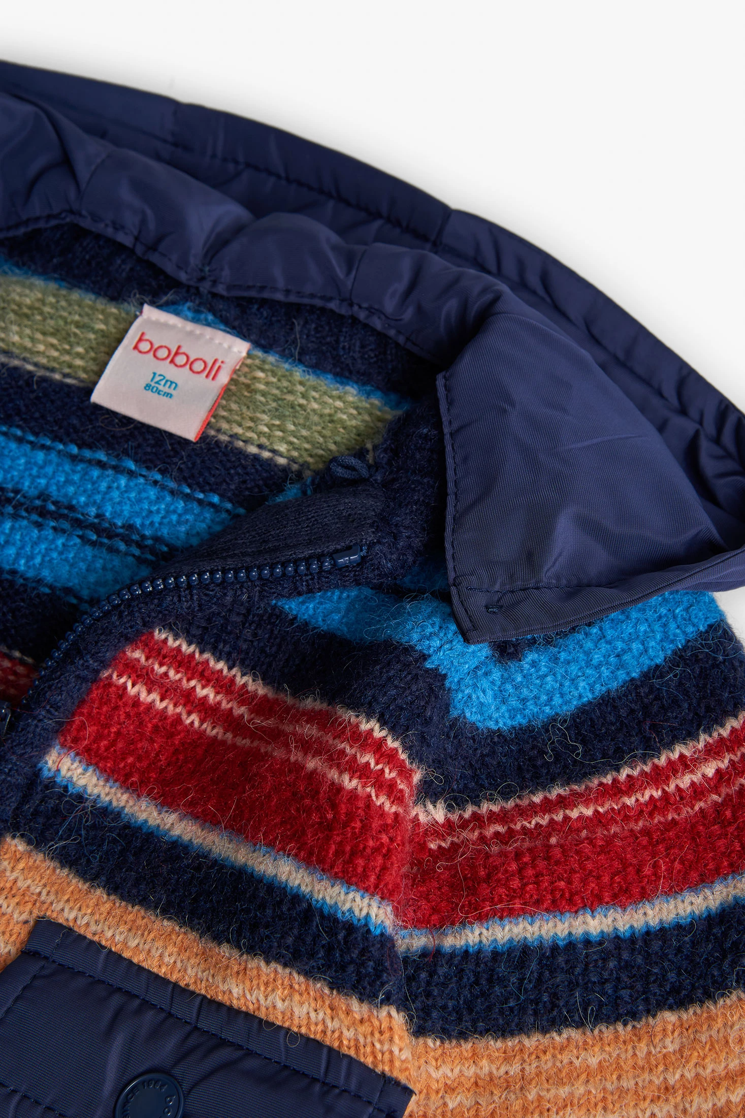 Veste en tricot pour garçon de couleur bleue avec un charmant motif à rayures horizontales, idéale pour les saisons d'automne et d'hiver. Fabriquée dans un tissu tricoté doux, elle garantit confort et chaleur. La fermeture pratique à glissière et la capuche offrent une protection accrue contre le froid. Disponible en tailles à partir de 12 mois jusqu'à 10 ans, cette veste est parfaite pour être associée à des pantalons et des t-shirts basiques, ajoutant une touche de style et de couleur à la garde-robe du petit.