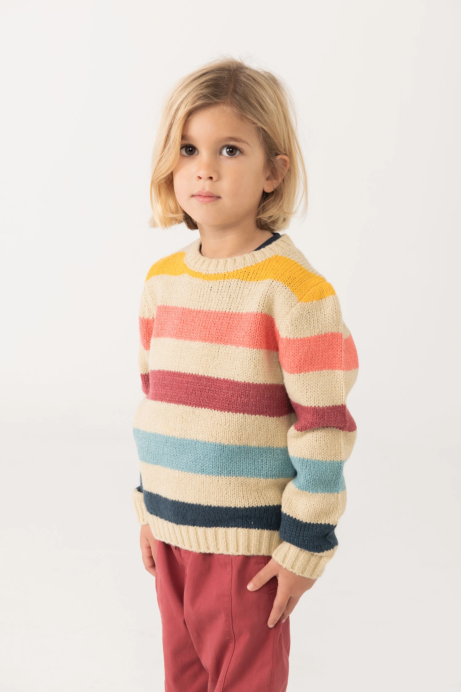 Pull pour enfant confectionné en tricot avec des rayures dans des tons beige, conçu pour garder les petits au chaud pendant l'automne et l'hiver. Design classique et élégant avec col rond et manches longues, en faisant un vêtement essentiel pour les jours froids. Fabriqué en tricot doux, il offre confort et chaleur, assurant le bien-être de l'enfant. Disponible en tailles de 12 mois à 10 ans, c'est une option parfaite pour assortir avec des pantalons ou des vestes dans une tenue chic et confortable.