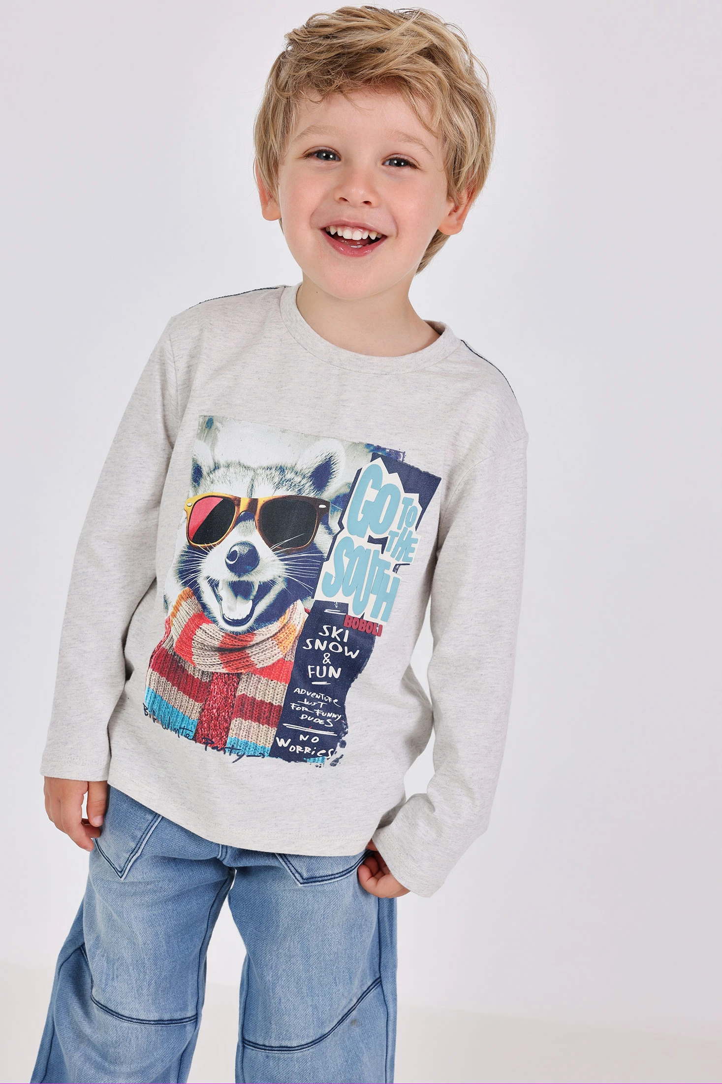 T-shirt pour garçon de couleur écrue, confectionnée en jersey doux pour offrir du confort pendant les mois les plus froids. Un charmant imprimé d'animaux ajoute une touche ludique à la tenue quotidienne de votre petit. Le design à manches longues et col rond en fait un vêtement polyvalent, idéal à associer avec un jean ou un pantalon en toile. Disponible en tailles de 12 mois à 10 ans, ce t-shirt est l'option parfaite pour garder votre enfant au chaud et avec style.