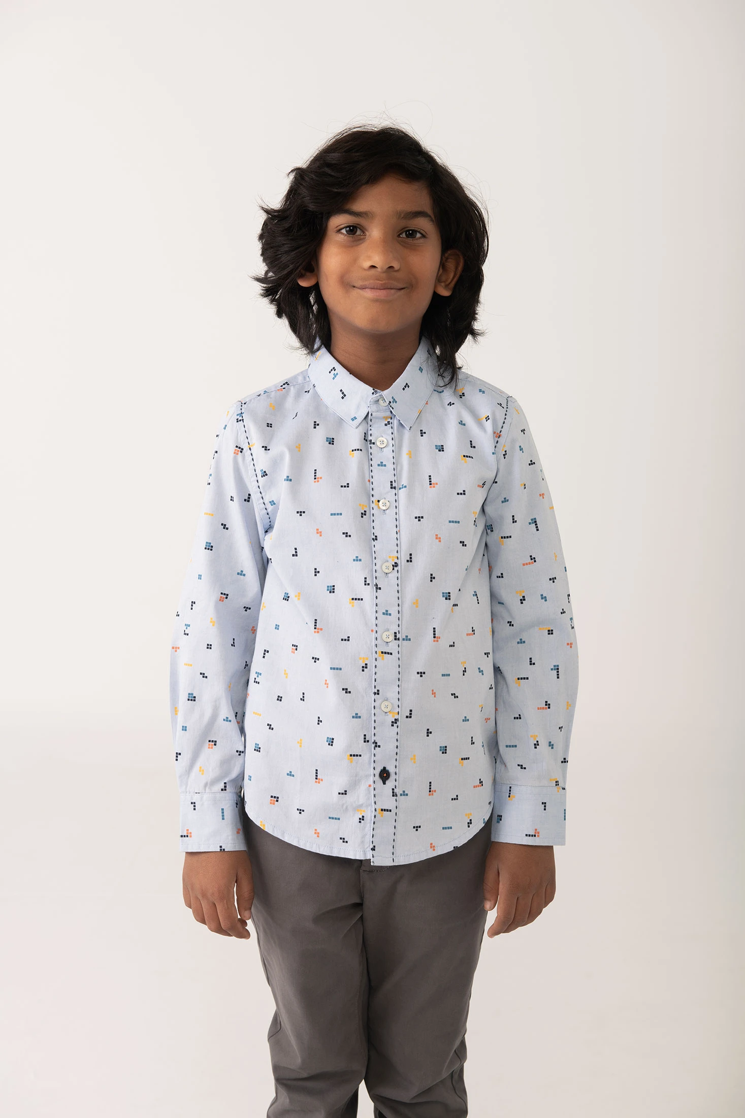Chemise oxford pour garçon avec un élégant motif géométrique en tons de bleu sur un fond bleu clair. Confectionnée dans un tissu doux et confortable, elle est parfaite pour des occasions tant informelles que formelles. Son design classique avec col chemisier offre une grande polyvalence en toute saison de l'année. Disponible en tailles de 2 à 14 ans, cette chemise accompagne la croissance de votre enfant, se mariant facilement avec des pantalons ou des bermudas pour un look raffiné.
