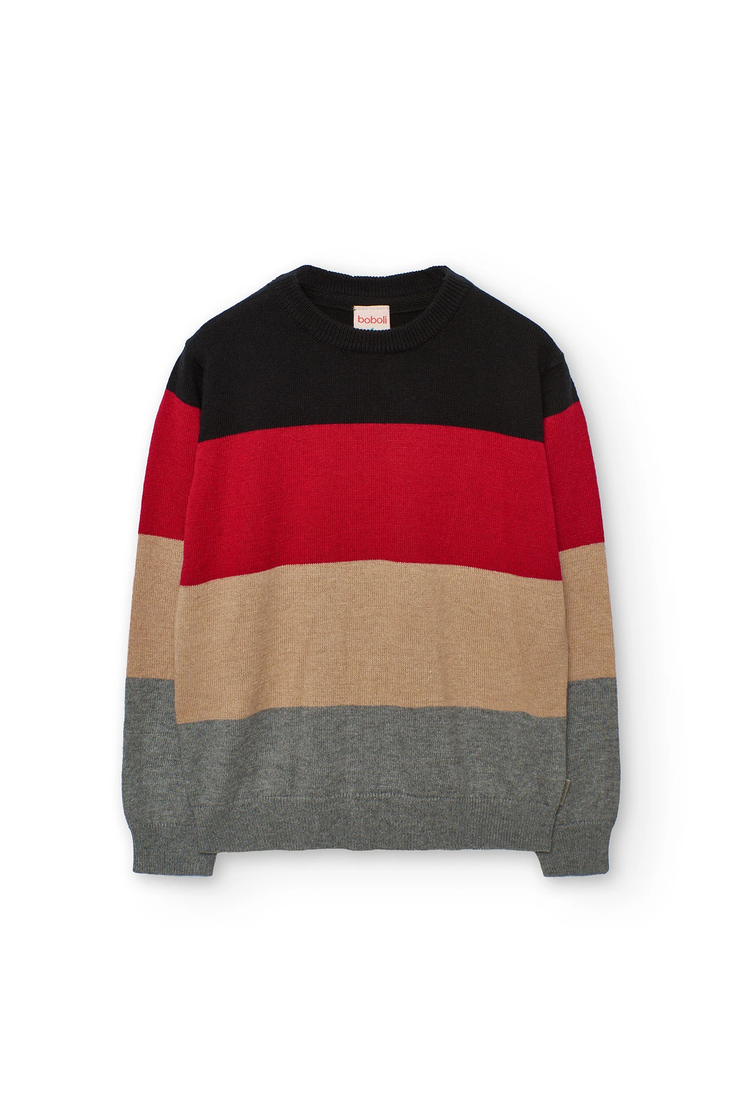 Pull en tricot pour garçon de couleur noire avec rayures, parfait pour l'automne et l'hiver. Vêtement classique qui présente des rayures horizontales dans des tons de noir, rouge, beige et gris, apportant un style unique et attrayant. Confectionné avec un tissu doux et confortable, il dispose d'un col rond et de manches longues offrant une protection optimale contre le froid. Disponible en tailles de 2 à 14 ans, il est une option polyvalente qui se combine facilement avec des jeans ou des pantalons décontractés. Son design moderne ajoute une touche de style à toute tenue par temps froid.