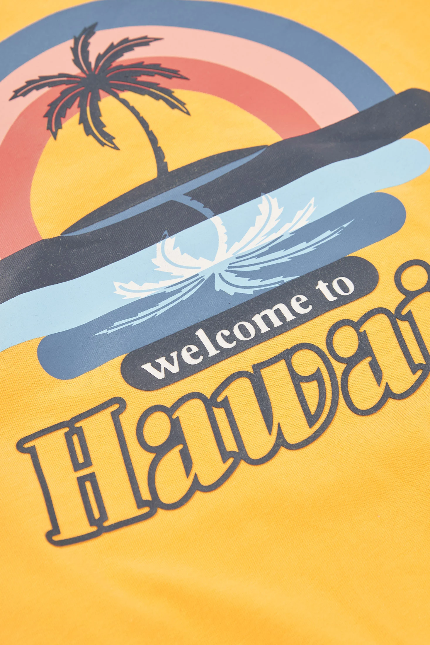Ensemble en coton pour garçon, parfait pour l'été. Le t-shirt est de couleur jaune avec un imprimé tropical multicolore, apportant un air frais et ludique. Le short bleu marine avec taille élastique et cordon ajustable complète le look. Idéal pour les enfants de 12 mois à 10 ans, cet ensemble est facile à assortir et adapté à toutes sortes d'activités de plein air, offrant confort et style décontracté.