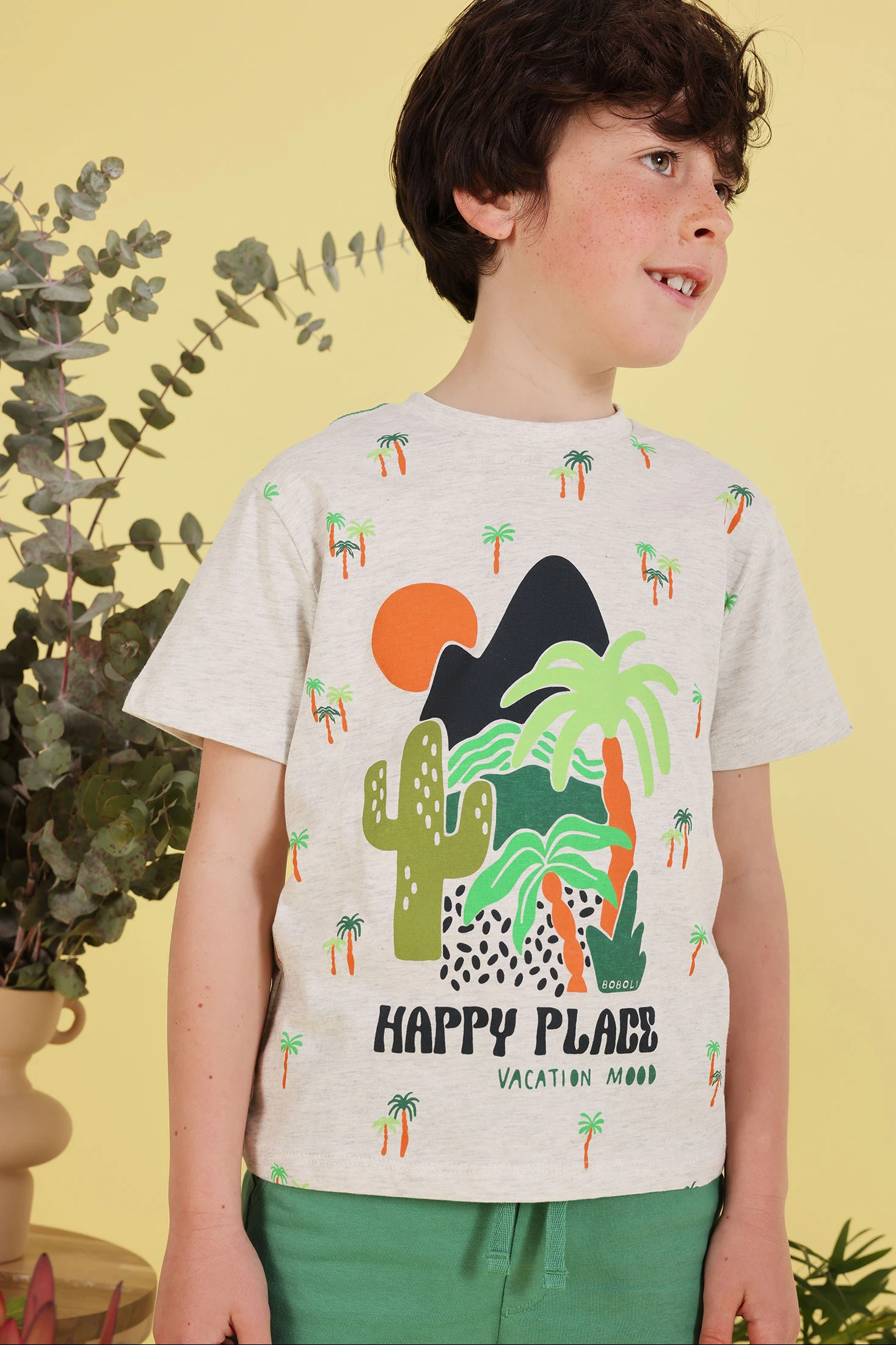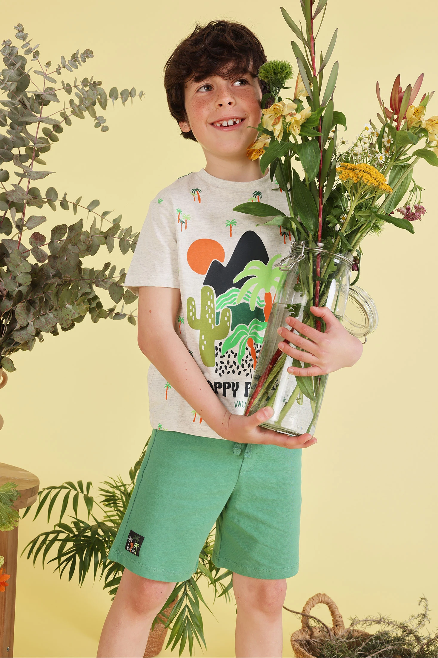 Ensemble pour garçon qui comprend un t-shirt et un short. Le t-shirt est à manches courtes en couleur écru chiné avec un grand imprimé tropical et coloré. Le short est de couleur verte avec une taille élastique et un cordon ajustable, assurant un ajustement parfait. Le tissu en maille garantit un confort pour explorer en toute liberté. Disponible en tailles de 12 mois à 10 ans, cet ensemble est idéal pour les journées chaudes. Son design joyeux le rend parfait pour les activités de plein air et garantit style et confort durant toute aventure.