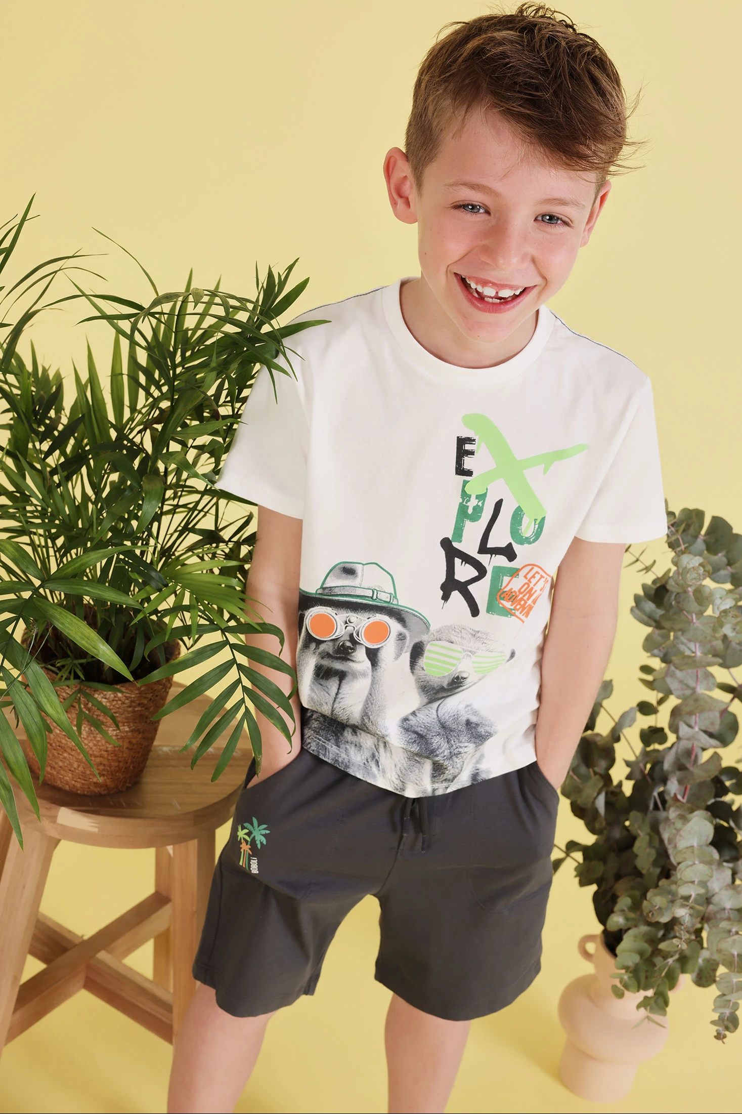 T-shirt en coton blanc pour garçon, idéale pour un look décontracté et amusant. Elle présente un motif de suricates avec des lunettes et un chapeau, ajoutant une touche ludique. Le design inclut le mot "Explore" en couleurs éclatantes. Son matériau en coton offre confort et est parfait pour une utilisation quotidienne par temps chaud. Disponible en tailles de 12 mois à 10 ans, elle s'adapte à la croissance des enfants. Ce vêtement peut être facilement associé à un jean ou un short pour un style frais et moderne.
