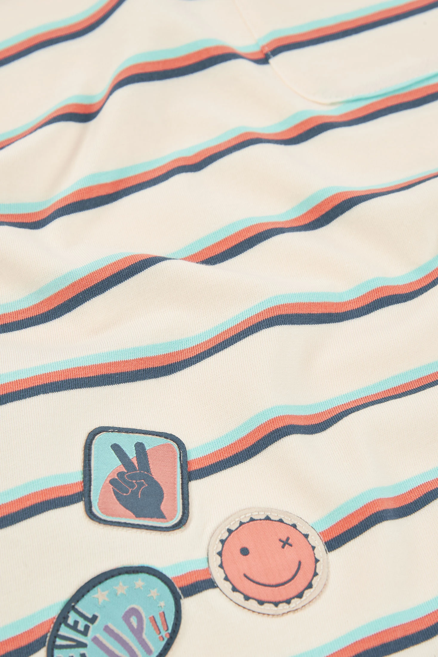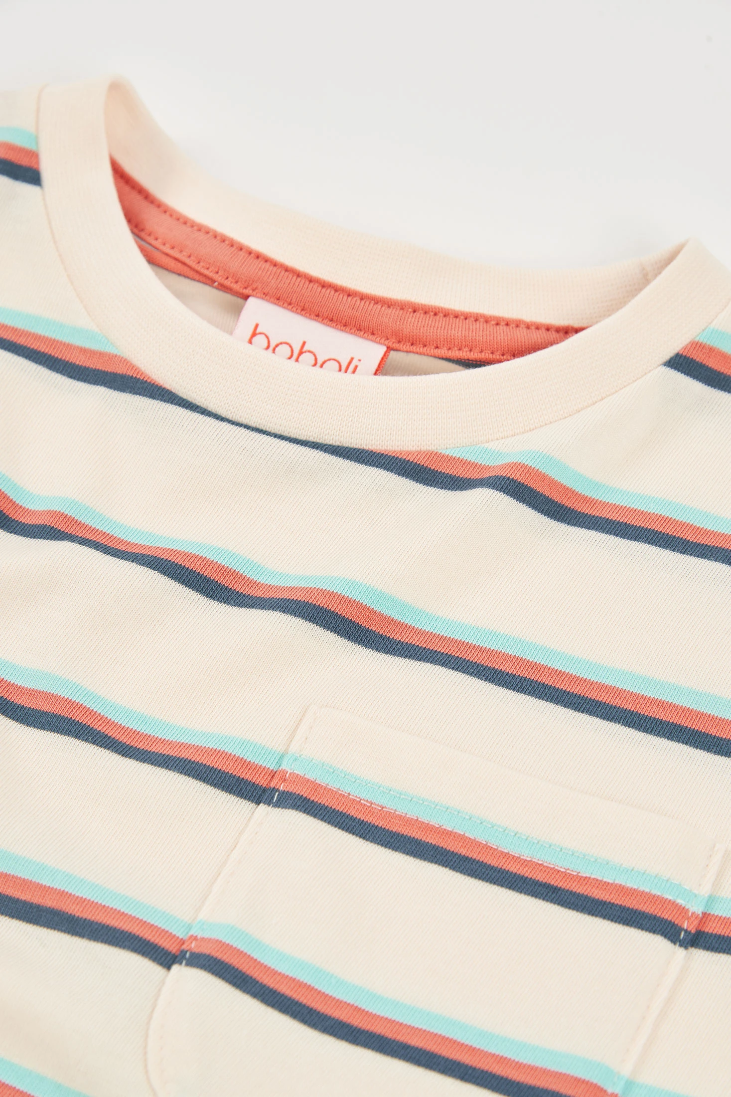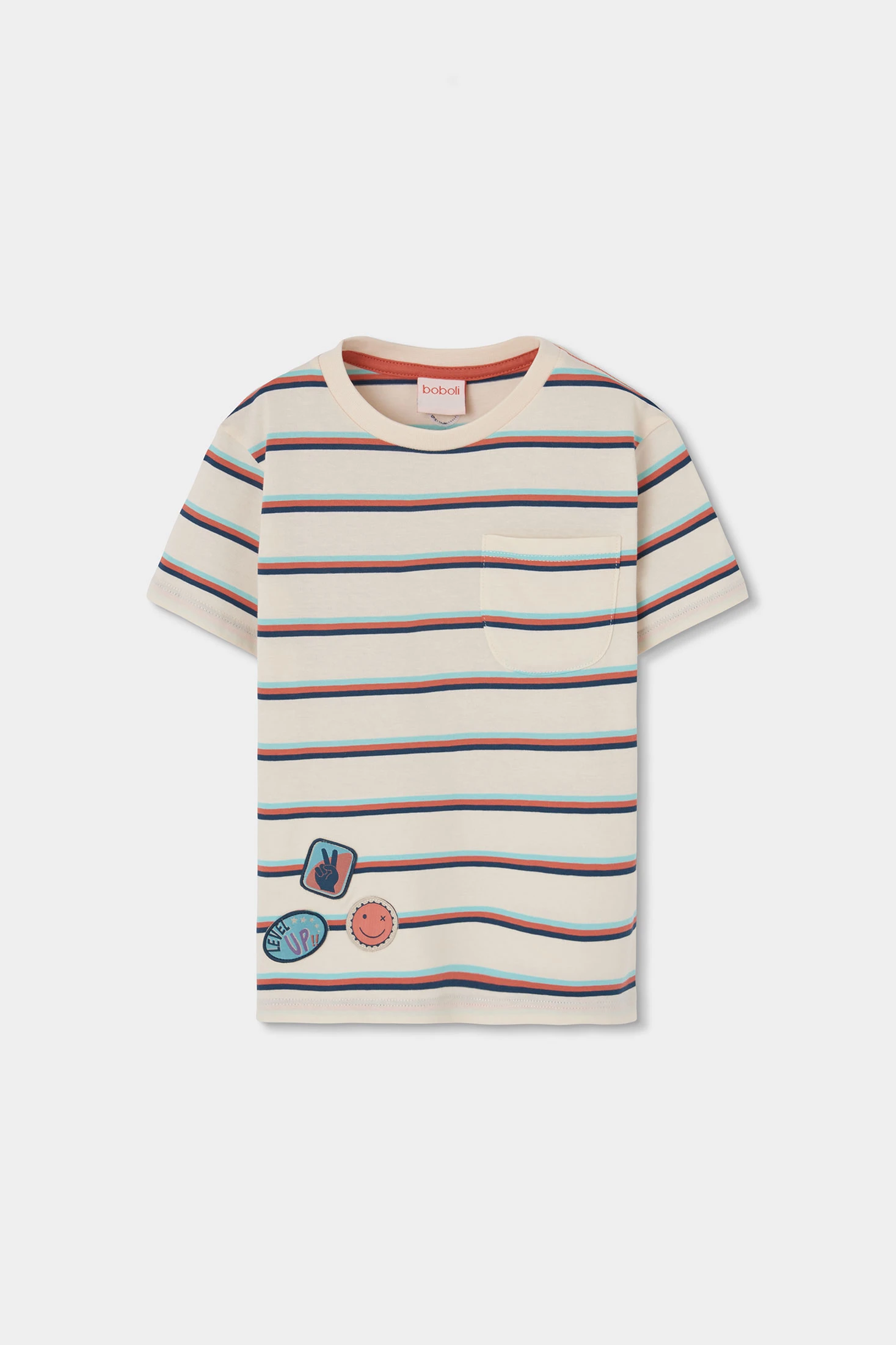 T-shirt en maille pour garçon idéale pour toutes les saisons. Confectionnée dans un tissu en maille doux et confortable, elle présente un motif à rayures horizontales multicolores sur un fond clair. Elle inclut des détails d'étiquettes comme décoration, apportant une touche unique. Son col rond et ses manches courtes la rendent parfaite pour un usage quotidien. Disponible en tailles de 12 mois à 10 ans, c'est une pièce polyvalente qui se combine facilement avec un jean ou un short pour un look décontracté et moderne.
