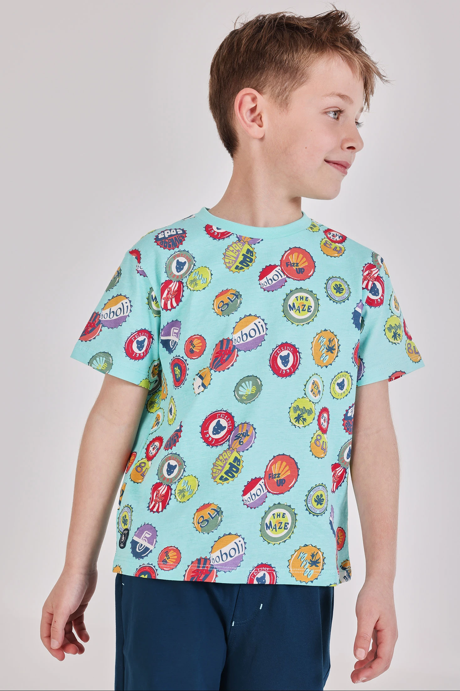 T-shirt en coton imprimé pour garçon idéale pour les plus petits. Disponible de 12 mois à 10 ans, elle s'adapte à la croissance de votre enfant. Son design présente des imprimés colorés de badges et de logos sur un fond bleu clair, ajoutant une touche amusante et moderne. Le matériel en coton assure confort et douceur pour un usage quotidien. Avec un col rond et des manches courtes, c'est un vêtement polyvalent qui se combine facilement avec des jeans ou des shorts, permettant à votre petit de paraître frais et à la mode.