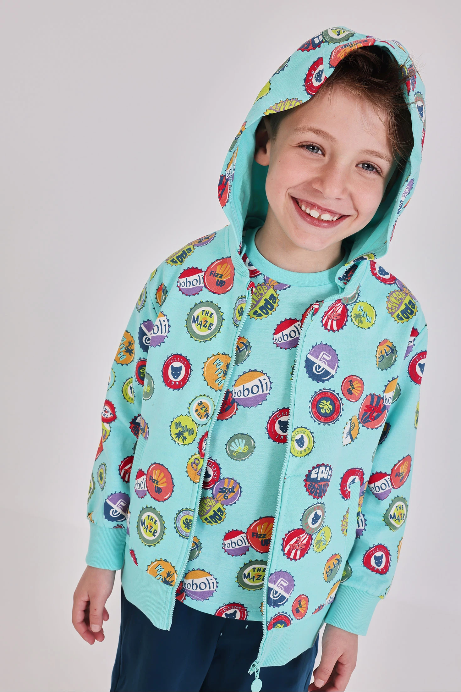 Veste en maille pour garçon, idéale pour les jours les plus frais, se distingue par son imprimé amusant de badges colorés sur un fond bleu. Avec capuche et fermeture éclair, elle offre fonctionnalité. Le tissu en maille assure confort et chaleur. Disponible en tailles allant de 12 mois à 10 ans, elle est parfaite pour un usage quotidien. Vous pouvez la combiner avec un jean pour un look décontracté et moderne. Les manches longues et les poches fonctionnelles en font une option idéale pour explorer en plein air.