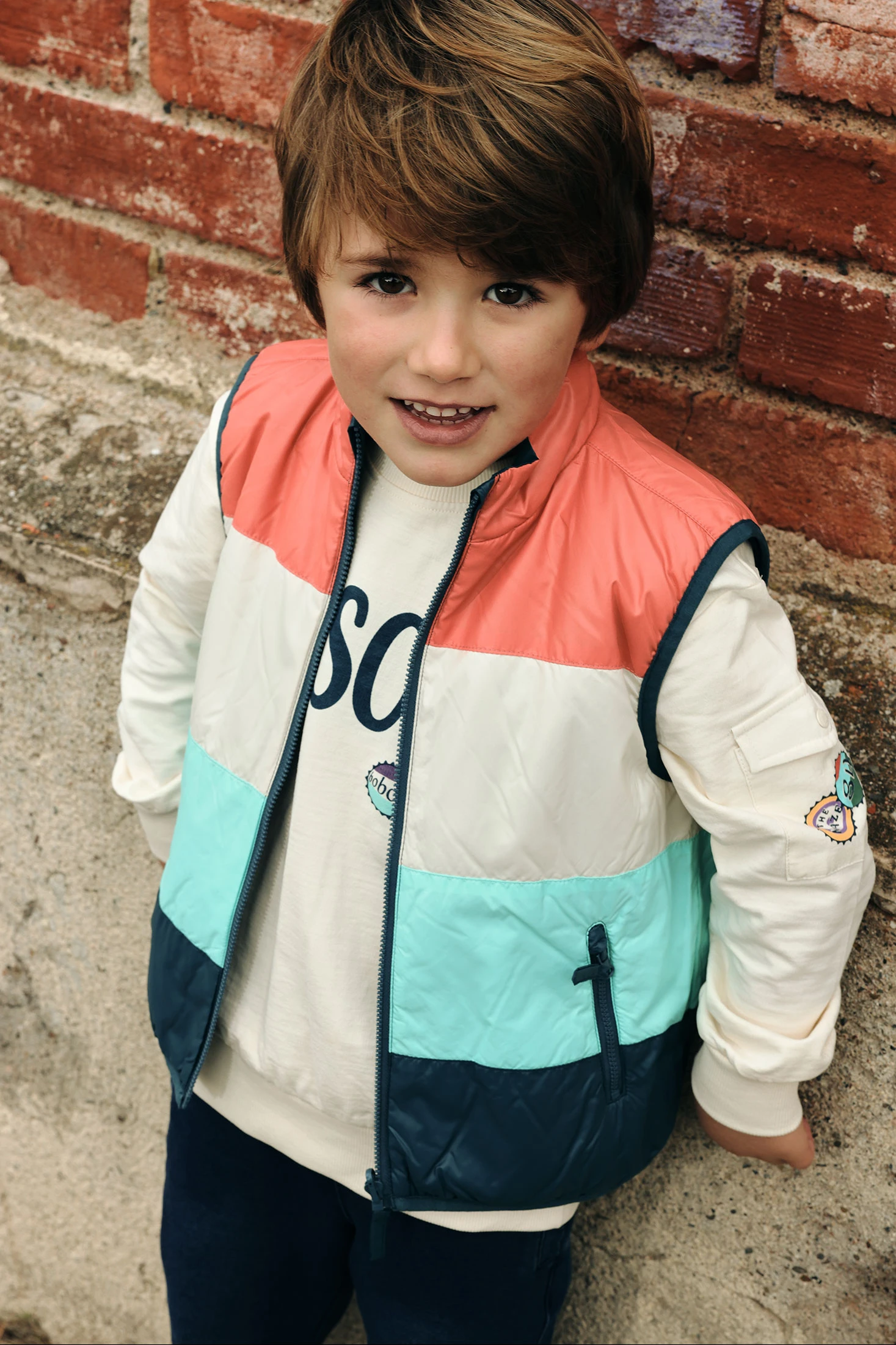 Gilet réversible pour enfant confectionné en tissu technique, parfait pour la mi-saison. De couleur bleu foncé verdâtre d'un côté, et multicolore de l'autre. Offre un design attrayant et amusant. Inclut des détails graphiques de plaques qui ajoutent une touche originale. Conçu pour les âges de 12 mois à 10 ans, c'est un vêtement polyvalent et fonctionnel. Conçu pour offrir confort et chaleur, il peut être assorti à des t-shirts ou des pulls pour un style décontracté et moderne. Idéal pour les aventures en plein air durant les journées fraîches.