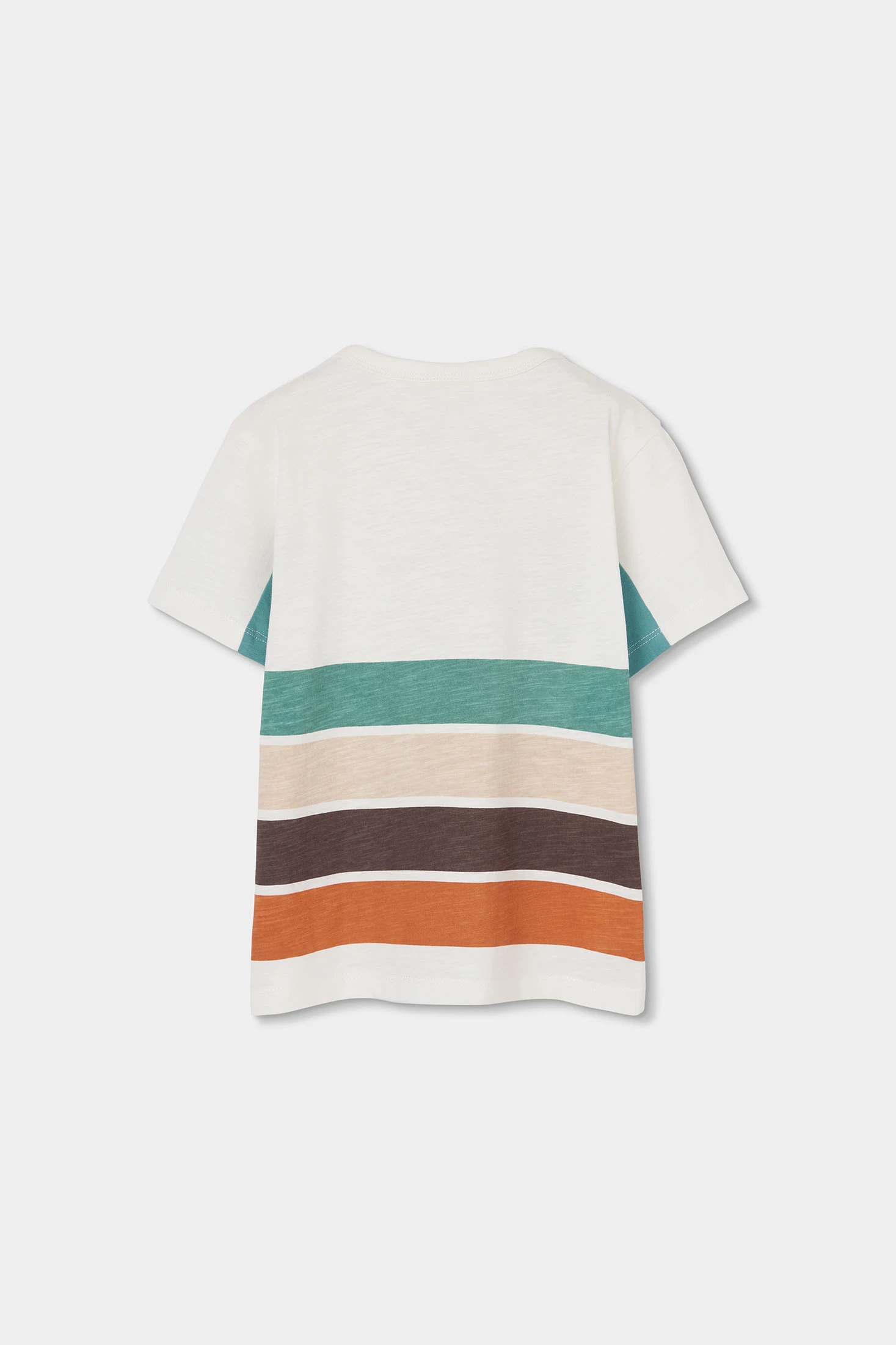 T-shirt en coton blanc cassé pour enfant, idéale pour un look décontracté. Elle présente un design amusant avec le mot "JUMP" en couleurs variées et un petit kangourou. Le matériau en coton assure confort et fraîcheur. Appropriée pour les âges de 12 mois à 10 ans, avec des tailles disponibles de 12 mois à 10 ans. Les boutons au niveau du col ajoutent une touche de style. Parfaite pour assortir avec des shorts ou des jeans pour une journée active.