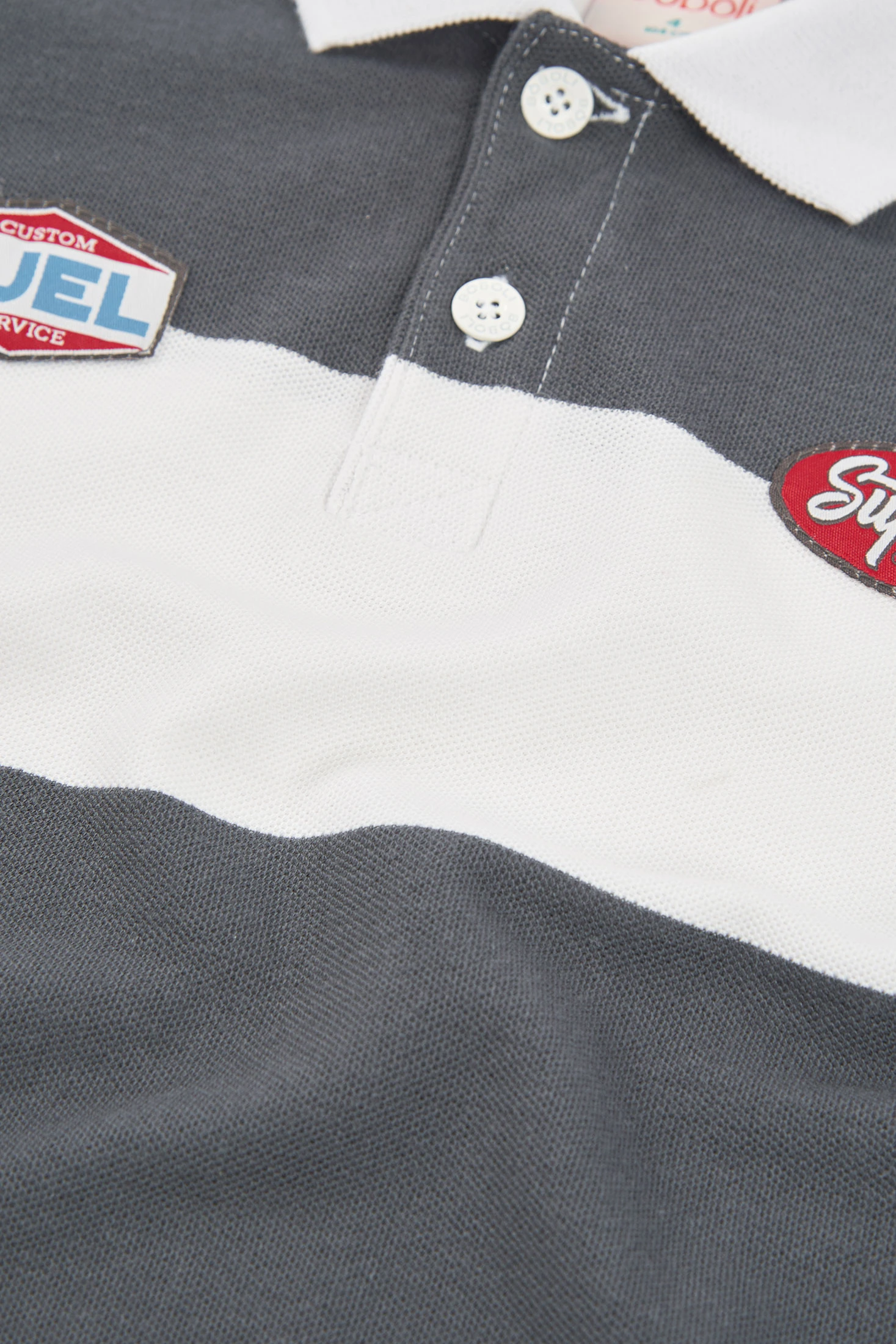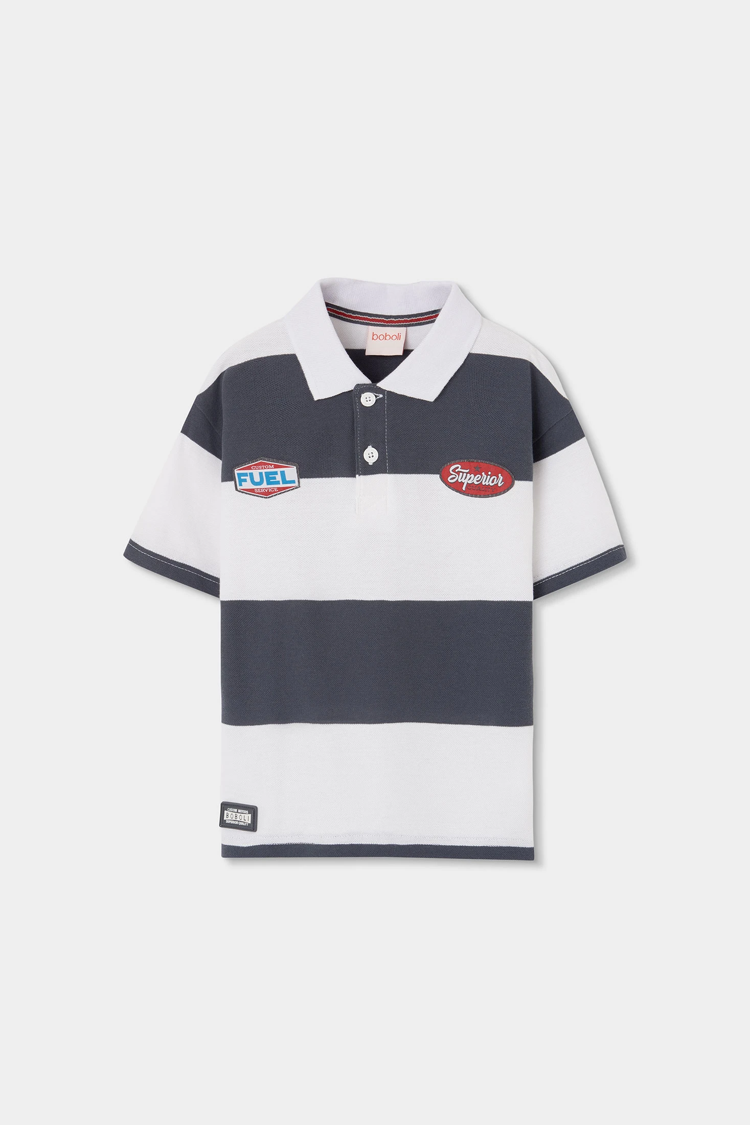 Polo rayé pour enfant confectionné en coton, garantissant confort et douceur. Il présente un design avec des rayures blanches et grises, accompagné de patchs décoratifs. Idéal pour des âges allant de 2 à 14 ans, c'est un vêtement polyvalent parfait pour les occasions décontractées. Son col classique et ses boutons à l'avant ajoutent des éléments de style, le rendant facile à assortir avec des pantalons ou des shorts. Un polo qui offre un équilibre entre mode et confort pour le quotidien.