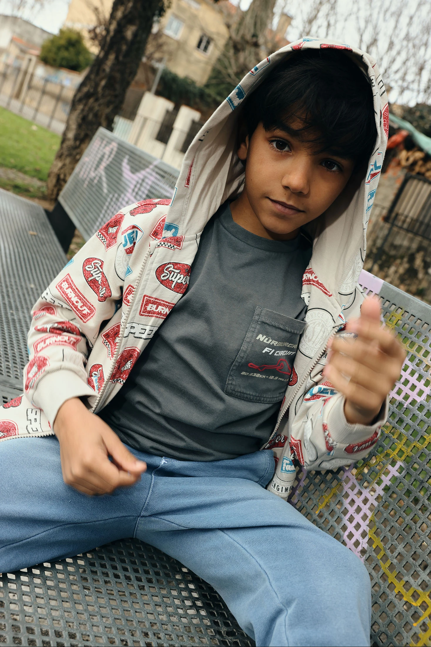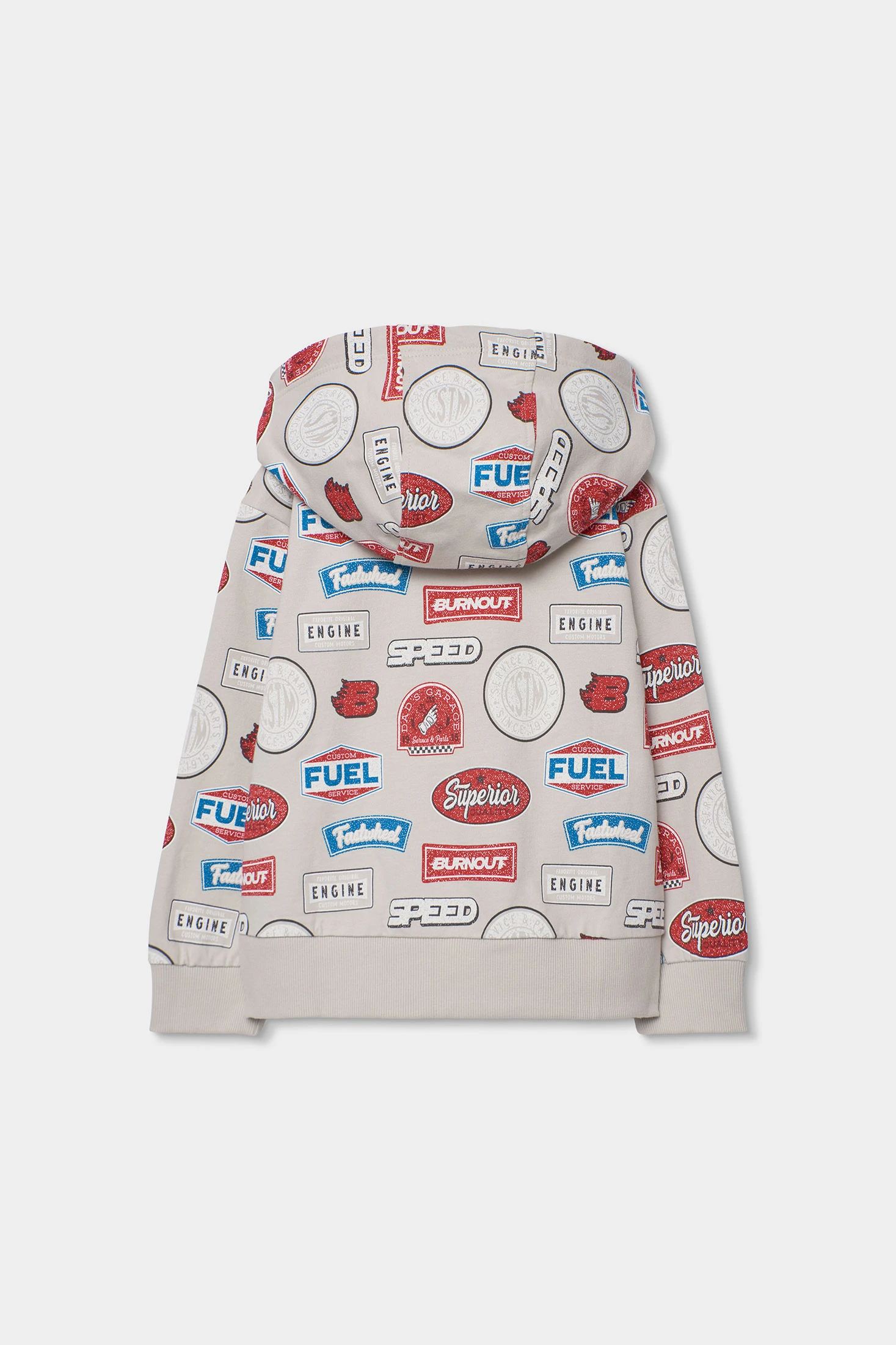 Veste en peluche imprimée pour garçon idéale pour le printemps. Son tissu doux offre confort et chaleur. De couleur grise avec des imprimés colorés de mots comme "Fuel" et "Speed", elle ajoute une touche amusante. Comprend une capuche et une fermeture éclair frontale pour plus de fonctionnalité. Disponible en tailles pour les âges de 2 à 14 ans, elle est parfaite pour être associée à un jean ou un pantalon de sport, offrant style et confort au quotidien.