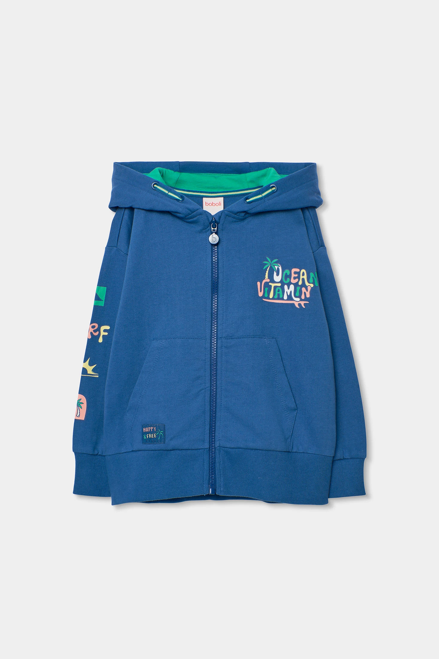 Veste en peluche pour garçon idéale pour le printemps. Confectionnée en coton, elle offre chaleur et confort. De couleur bleue, elle présente des détails imprimés colorés et une capuche pratique pour se protéger du froid. Sa fermeture est à glissière, facilitant son usage quotidien. Disponible en tailles de 2 à 14 ans, elle est parfaite pour être associée à des jeans ou des pantalons décontractés, ajoutant une touche amusante et moderne.