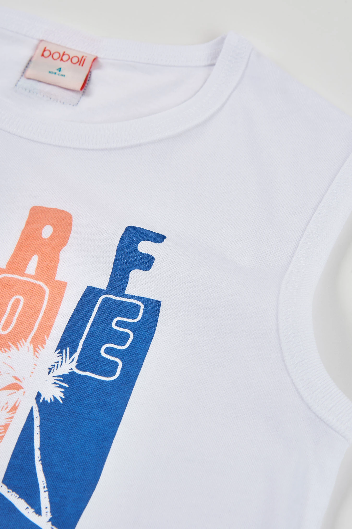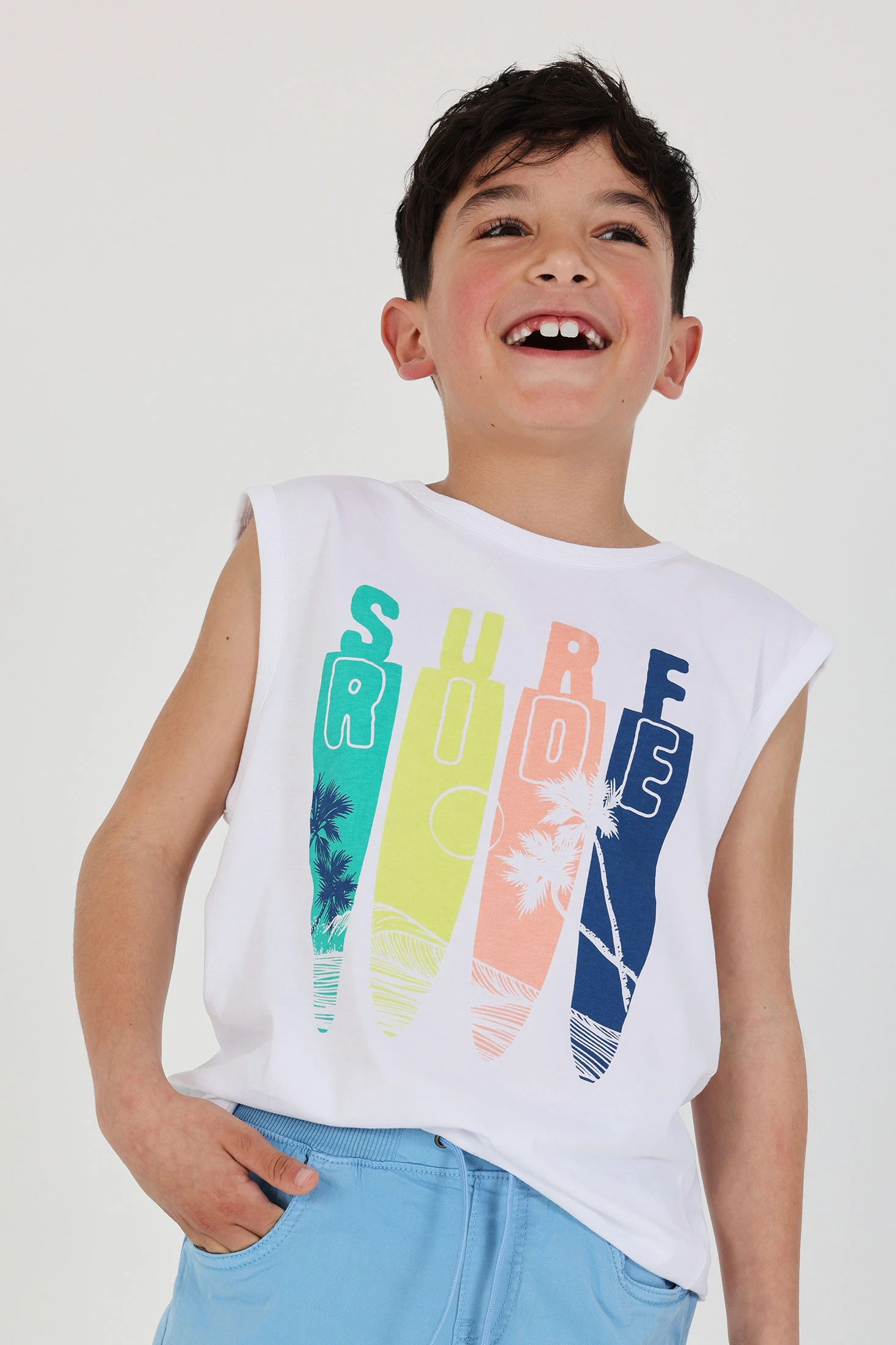 Débardeur pour garçon, confectionné en coton blanc, parfait pour les journées chaudes. Il présente un design coloré à l'avant avec des lettres et des planches de surf qui ajoutent une touche amusante et estivale. Doux et respirant, il est idéal pour garder le confort pendant le jeu. Disponible en tailles de 2 à 14 ans. Ce débardeur se marie facilement avec des shorts ou des jeans pour un look décontracté et frais.