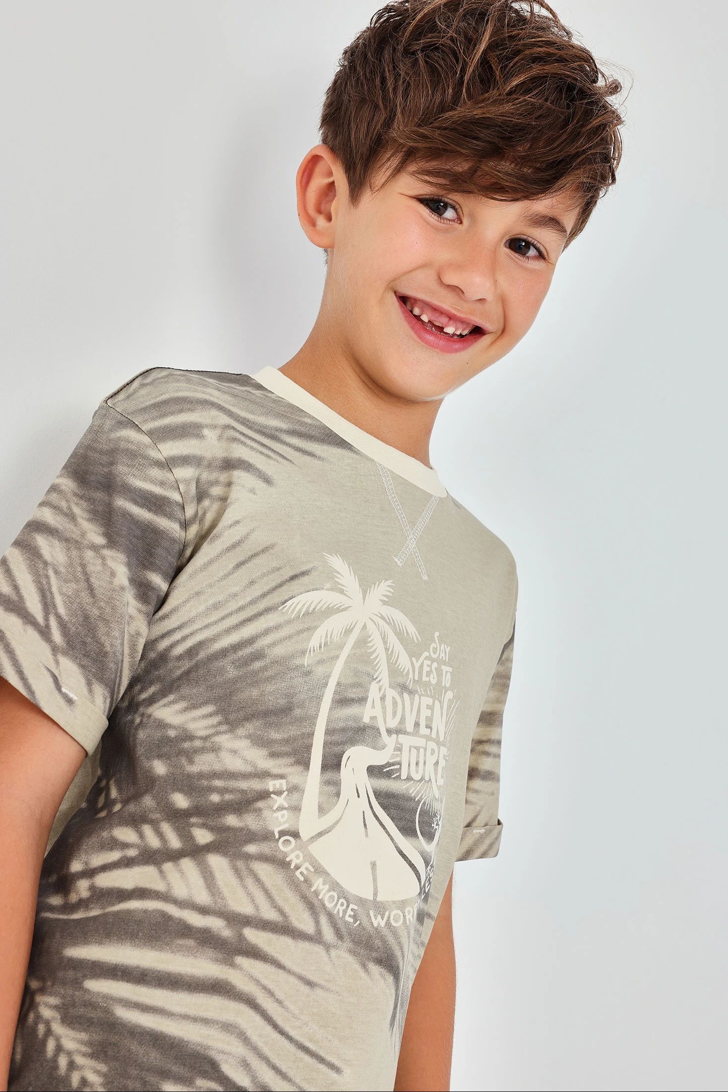 T-shirt en coton brut pour garçon, parfaite pour toute occasion décontractée. Son design présente un imprimé avec des palmiers style tie-dye et une phrase inspirante, ajoutant une touche d'aventure. Le matériau en coton garantit confort et douceur au contact de la peau. Disponible en tailles allant de 2 ans à 14 ans, s'adaptant à différents âges. T-shirt de couleur terre, facile à assortir avec un pantalon sombre ou des shorts pour un look détendu. Idéal pour explorer avec style et confort.
