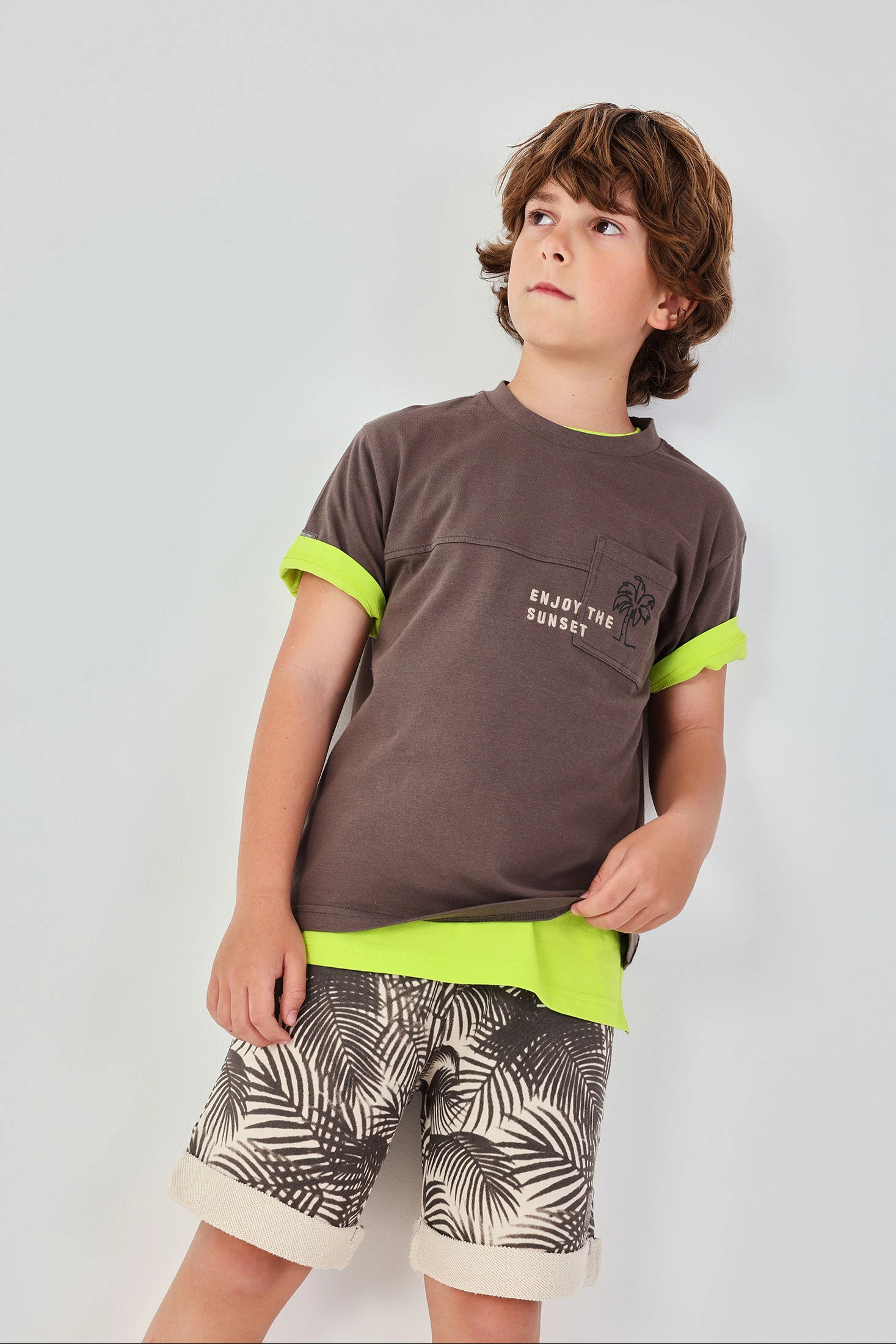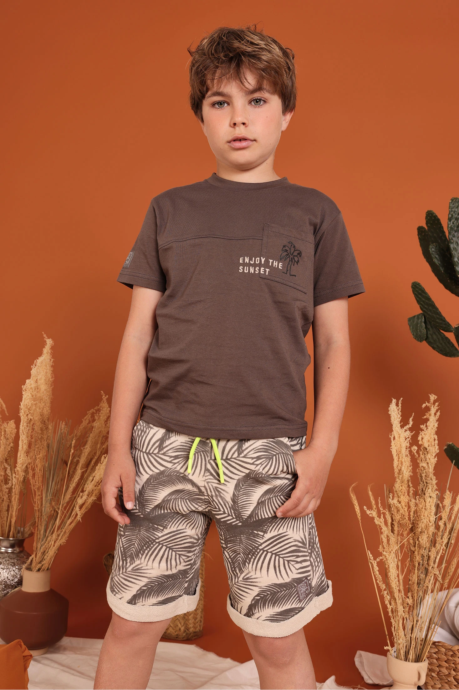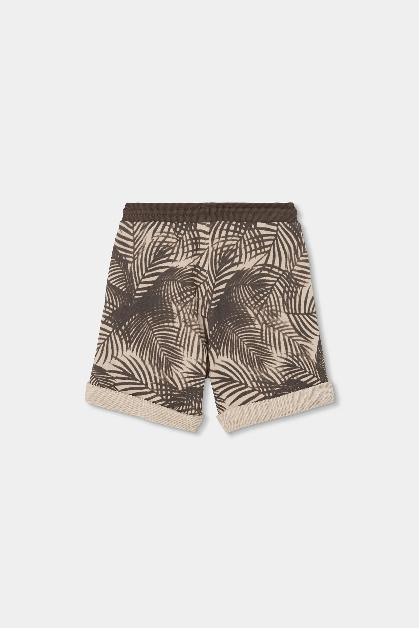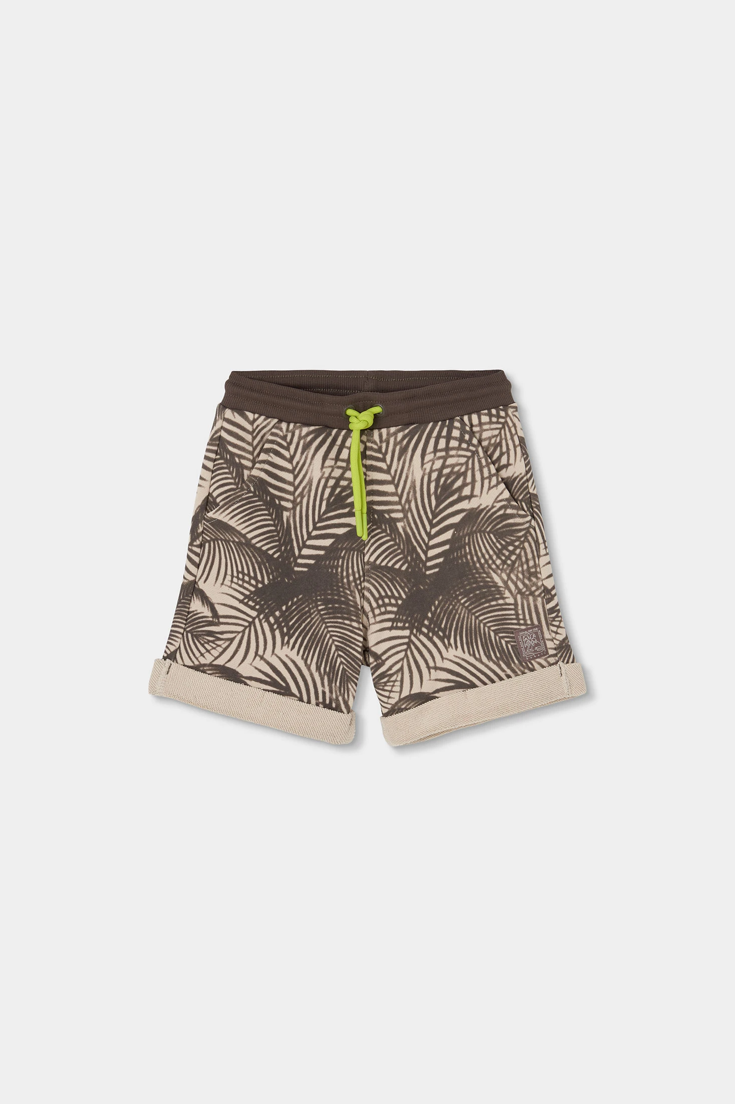 Bermudas en pelfe pour garçon idéales pour l'été, faites d'un matériau doux qui garantit le confort. Elles présentent un imprimé de feuilles tropicales dans des tons marron et beige, leur conférant un style frais et estival. La taille élastique avec cordon ajustable en vert néon assure un ajustement sûr et personnalisé. Disponibles dans les tailles de 2 à 14 ans. Parfaites à combiner avec des t-shirts simples ou imprimés, elles sont une option confortable et stylée pour les journées chaudes.