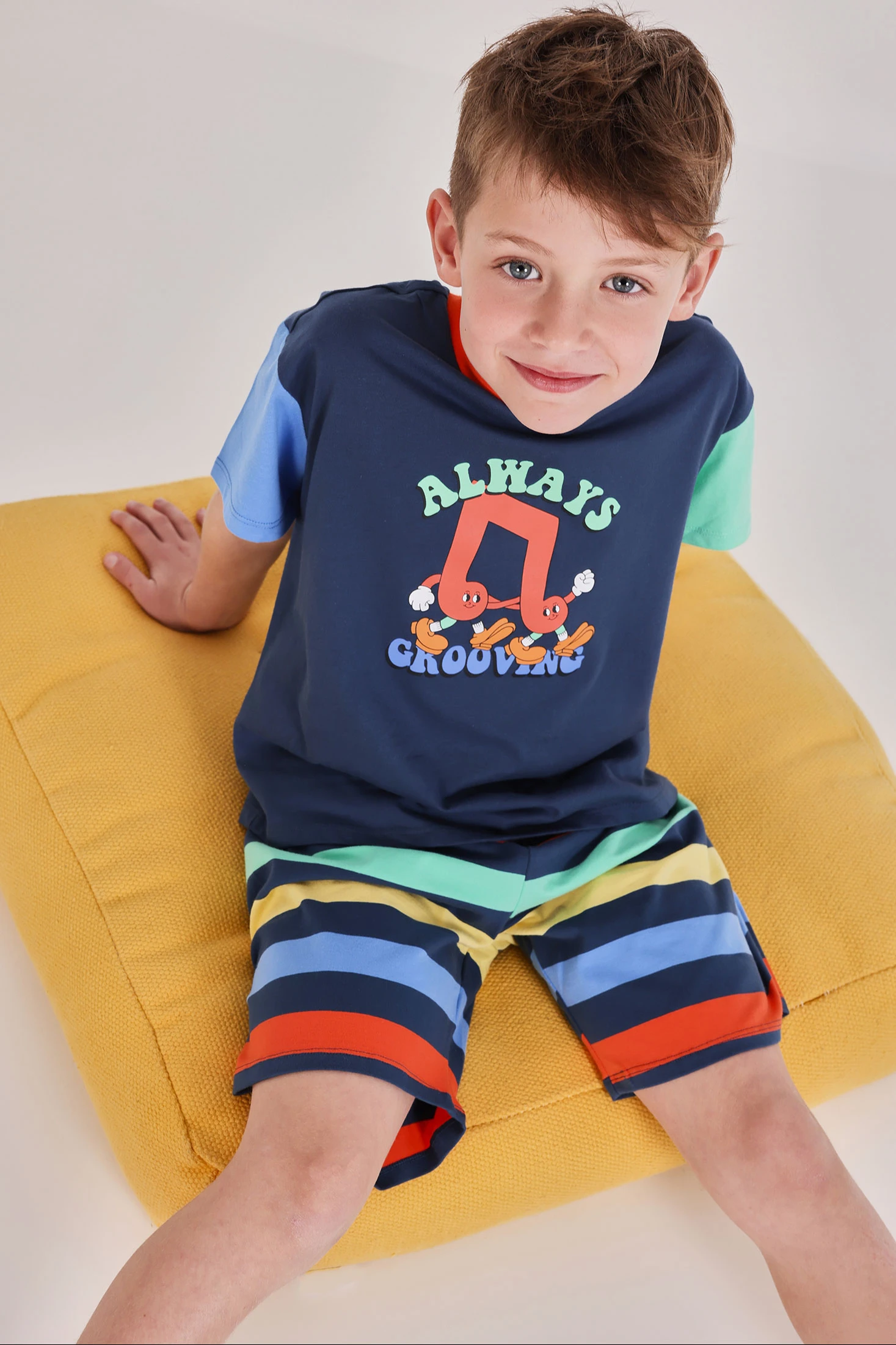 Pyjama bleu pour garçon confectionné en doux coton, garantissant confort tout au long de la nuit. Présente un design amusant avec des notes de musique et du texte, ainsi que des manches de différentes couleurs. La partie inférieure est à rayures multicolores, ajoutant une touche joyeuse. Disponible en tailles de 2 à 14 ans, offrant un ajustement approprié à mesure que l'enfant grandit. Parfait pour offrir style et confort à l'heure du coucher.